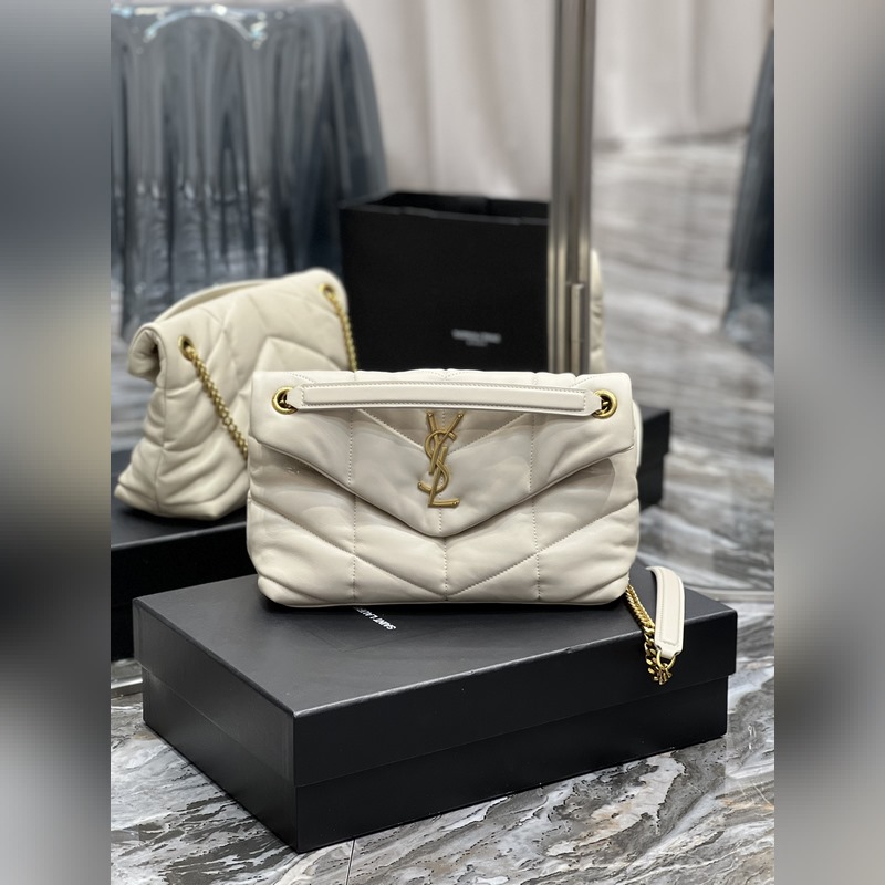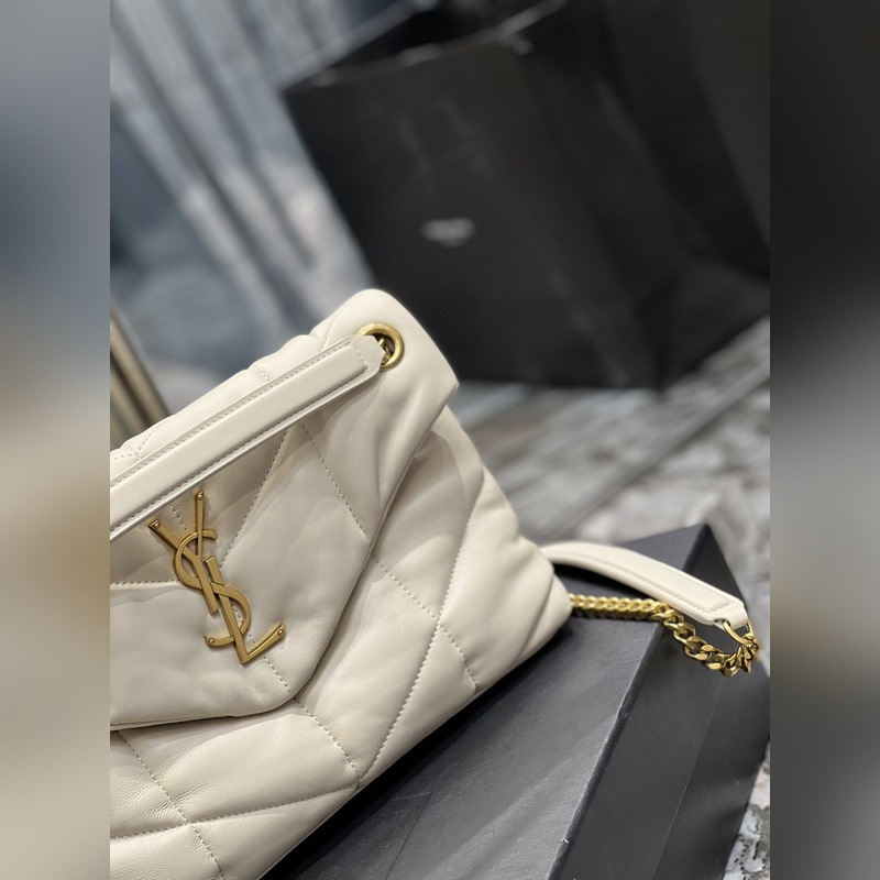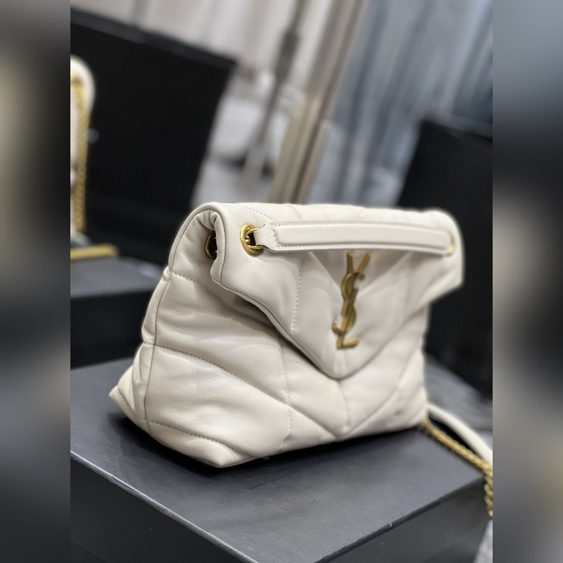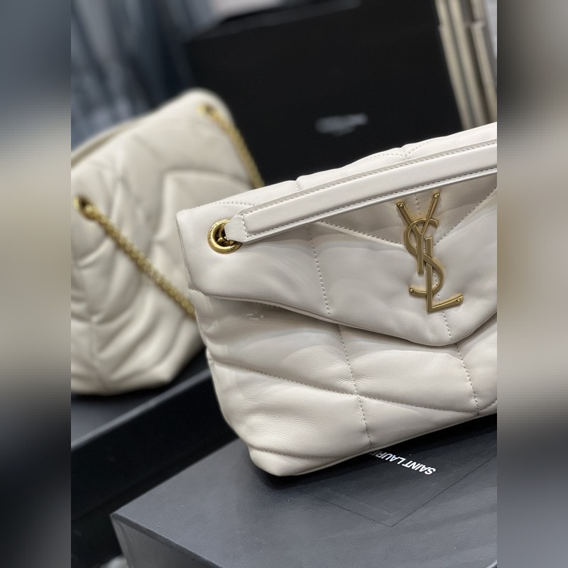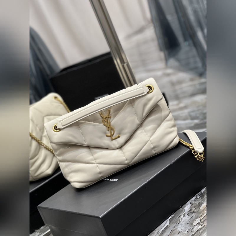 화이트에 골드 버클 LOULOU PUFFER_퀼팅 양가죽 백 100% 양가죽 제작 부드럽고 섬세한 감촉으로 마치 구름을 안는 듯한 느낌. 클래식한 Y자 로고 체인 및 고리 금속 부품은 모두 빈티지 금속 소재로 제작되어 복고적인 질감과 독특한 매력을 선사합니다. p6800 사이즈: 29x17x11cm 모델: 577476