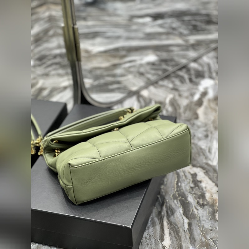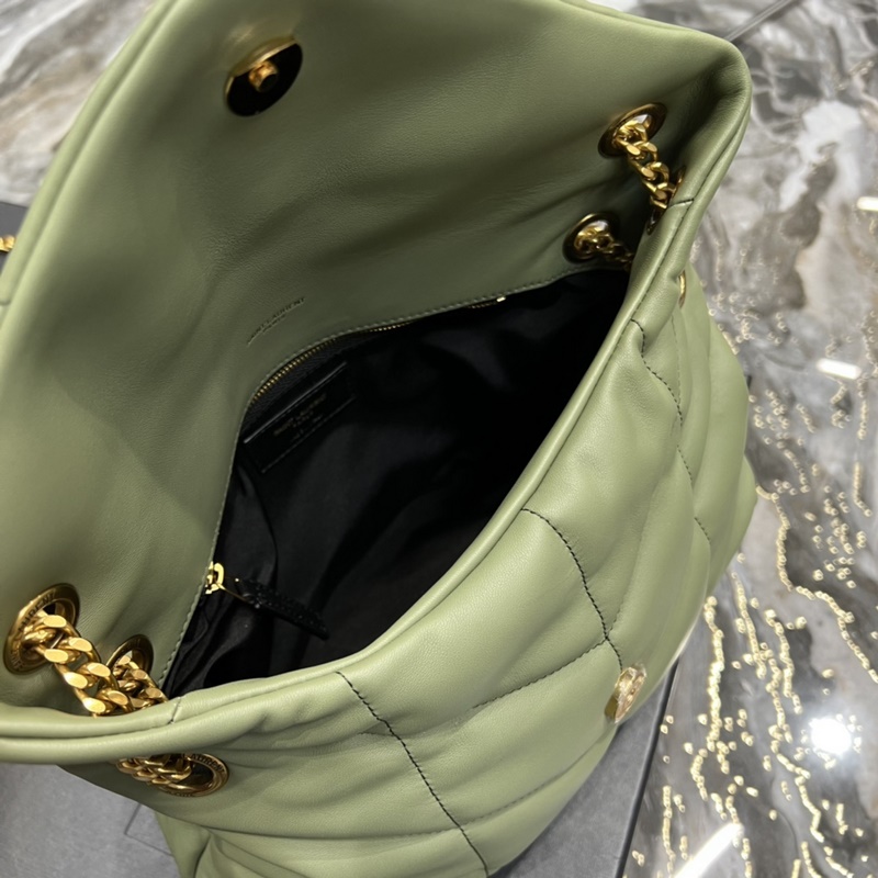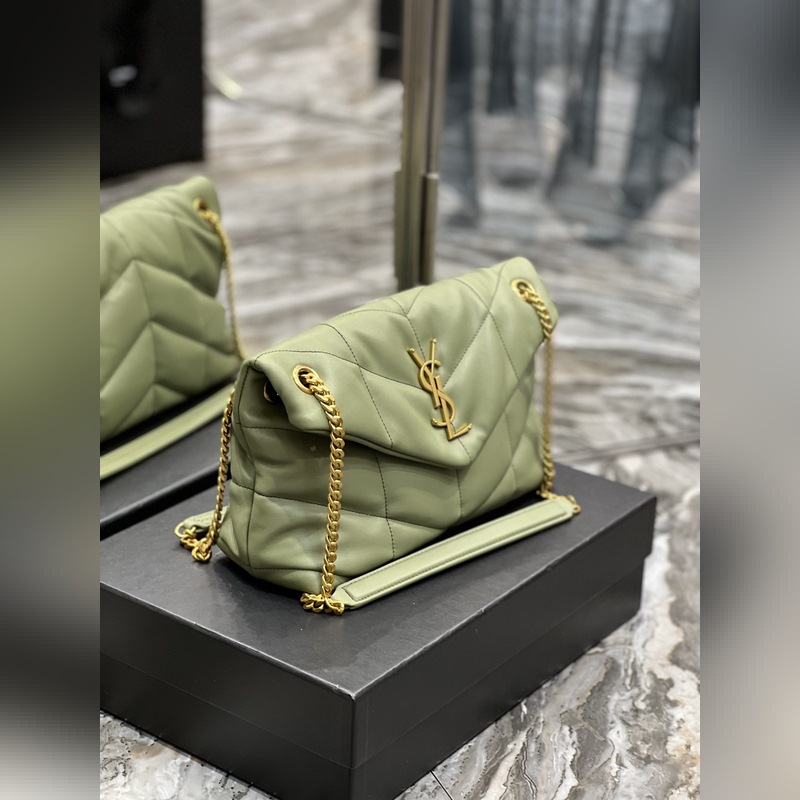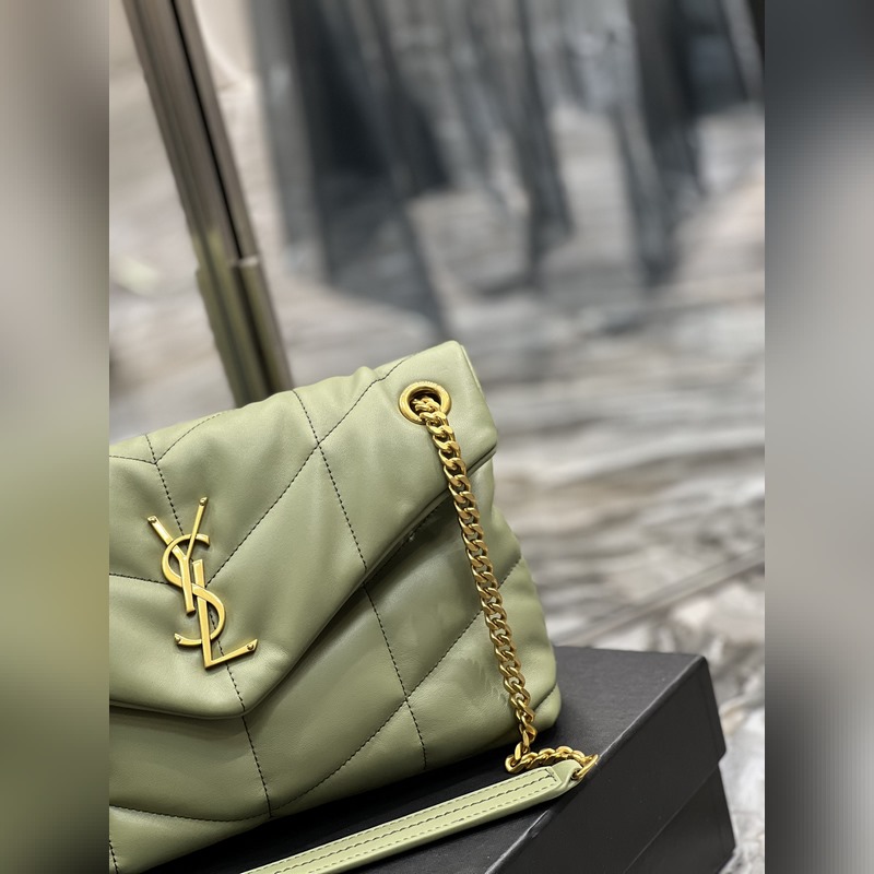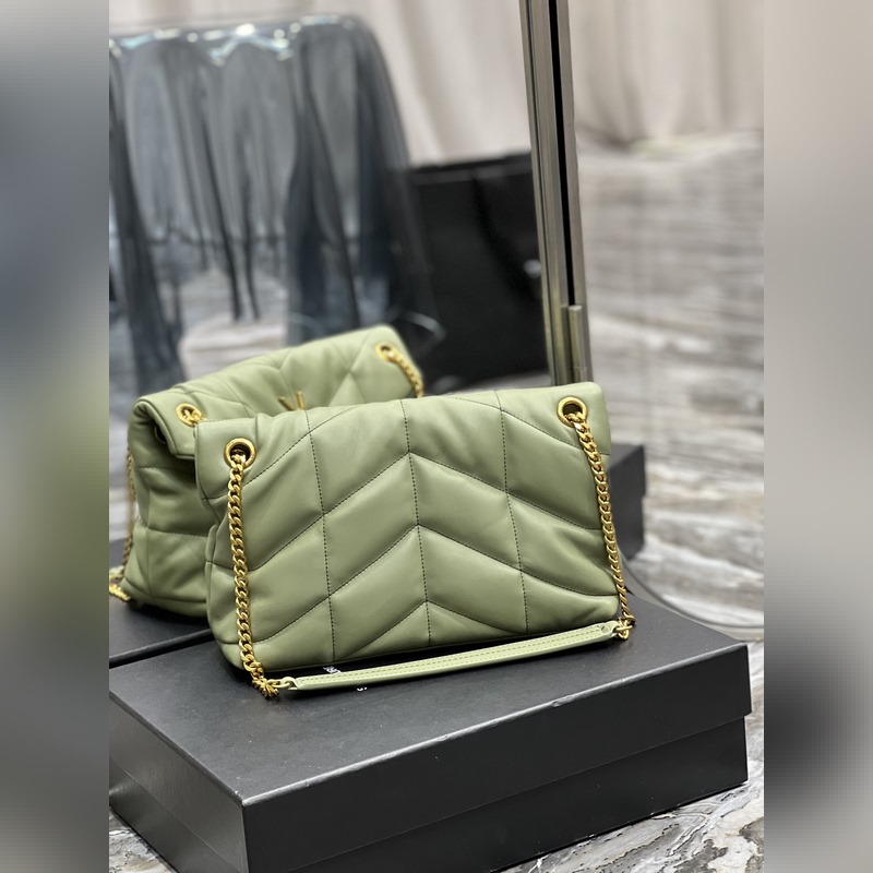아보카도 그린에 골드 버클 LOULOU PUFFER_퀼팅 양가죽 백 100% 양가죽 제작 부드럽고 섬세한 감촉으로 마치 구름을 안는 듯한 느낌. 클래식한 Y자 로고 체인 및 고리 금속 부품은 모두 빈티지 금속 소재로 제작되어 복고적인 질감과 독특한 매력을 선사합니다. p6800 사이즈: 29x17x11cm 모델: 577476