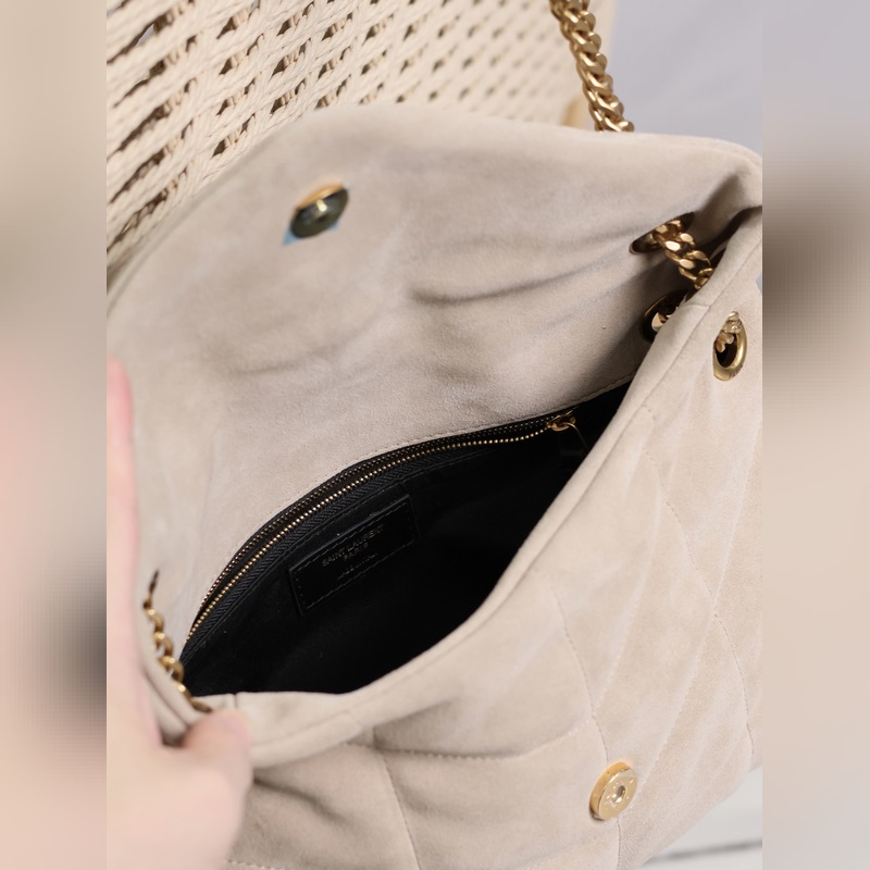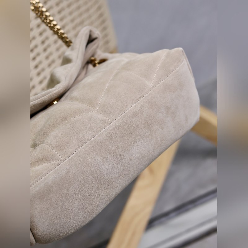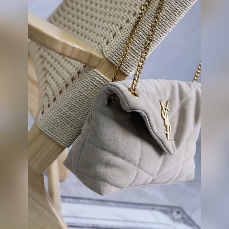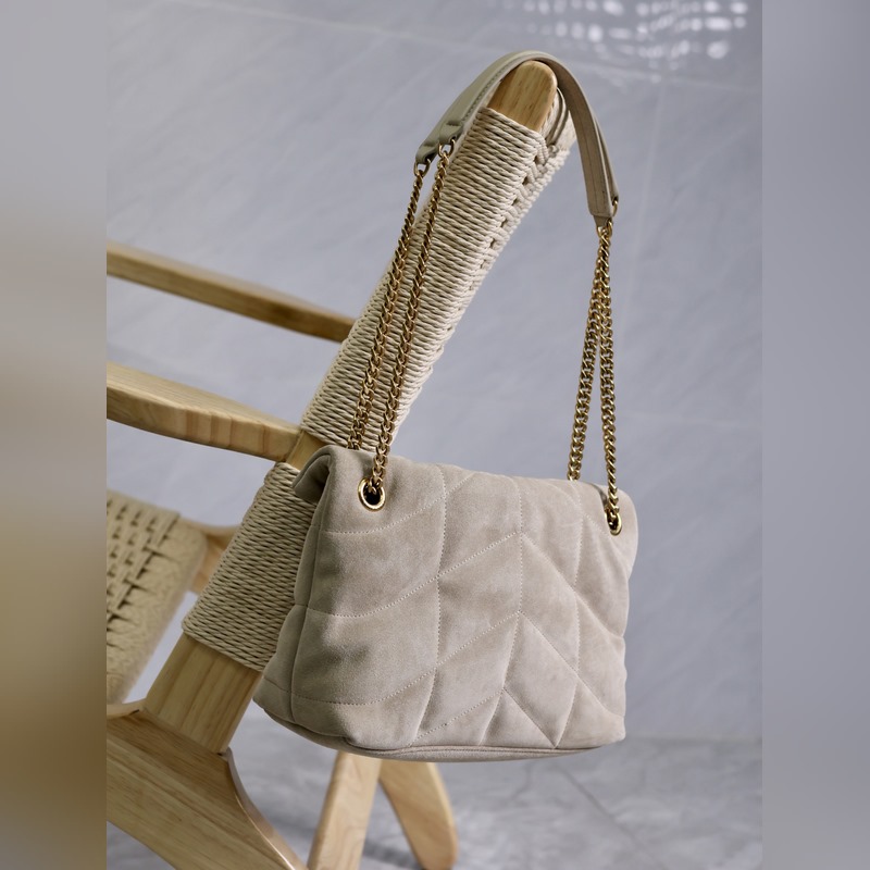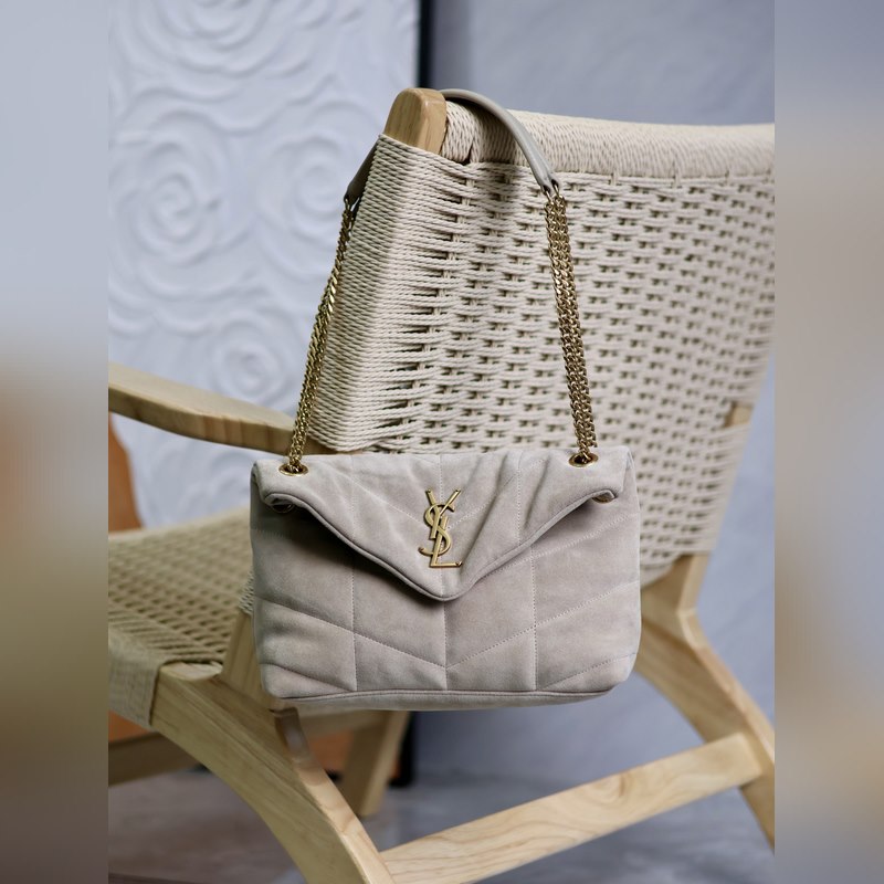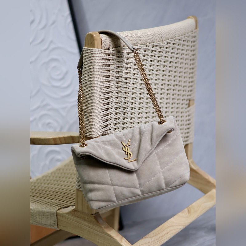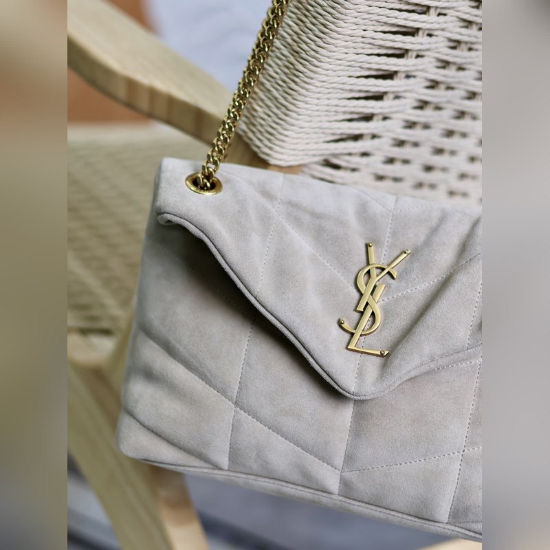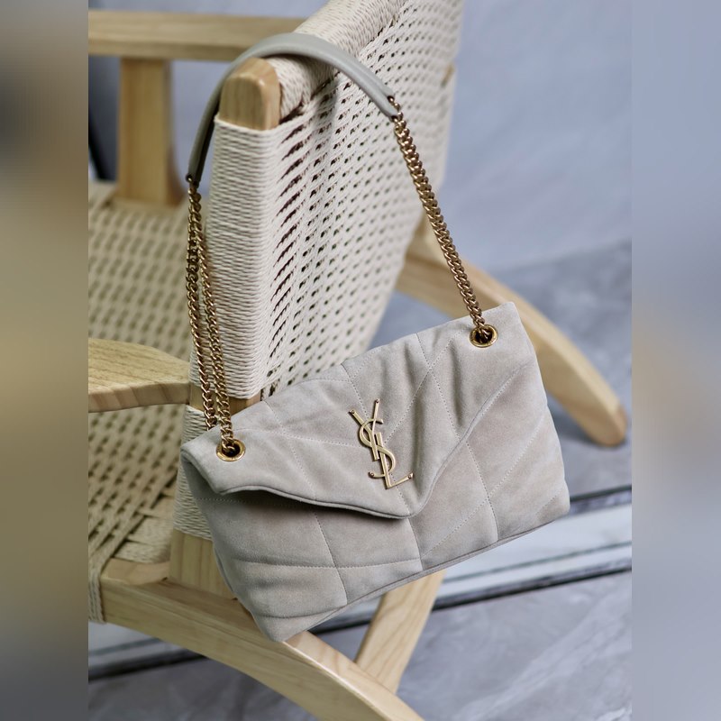회색 금색 버클 무광 처리 Loulou 퍼프_퀼팅 체인백 이탈리아산 스웨이드로 제작되어 부드럽고 섬세한 감촉으로 마치 구름을 안는 듯한 느낌을 선사합니다. 클래식한 Y자 로고 체인 및 고리 금속 부품은 모두 빈티지 처리된 금속 소재를 사용하여 복고적인 질감과 독특한 매력을 더했습니다. 사이즈: 29x17x11cm 모델: 577476