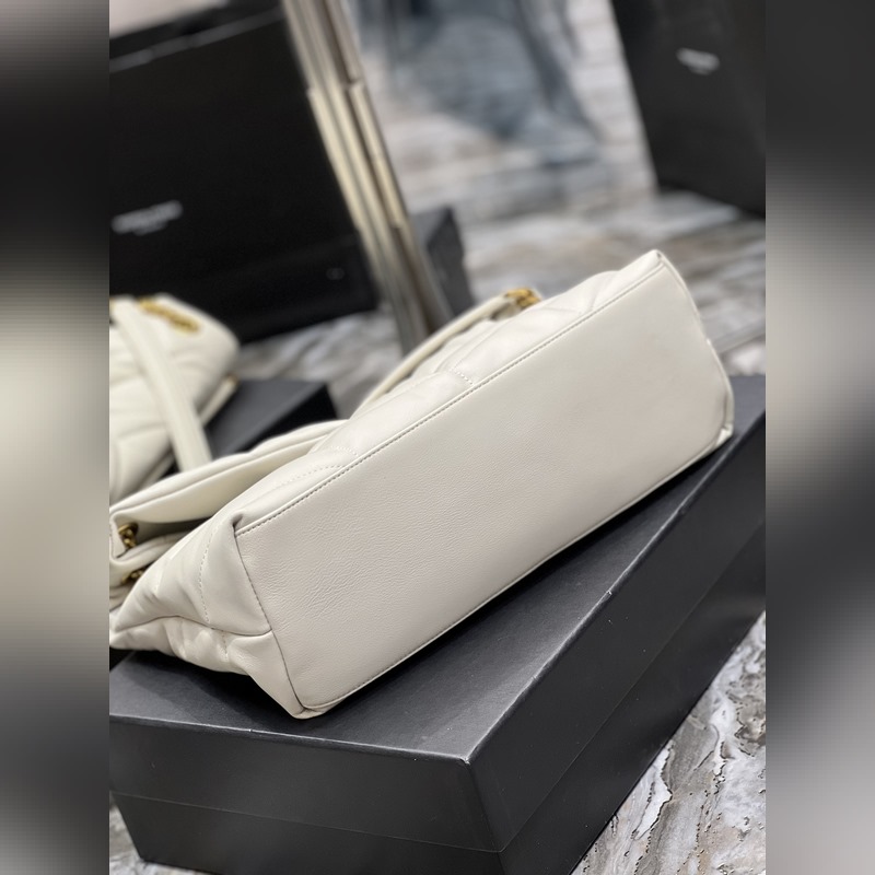 화이트에 골드 버튼 LOULOU PUFFER _퀼팅 양가죽 백 100% 양가죽 제작 부드럽고 섬세한 감촉으로 마치 구름을 안는 듯한 느낌. 클래식한 Y자 로고 체인 및 고리 금속 부품은 모두 빈티지 처리된 금속 소재로 복고적인 질감과 독특한 매력을 더합니다. 사이즈: 35x23x13.5cm 모델: 577475-1
