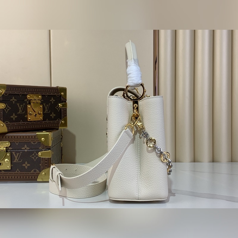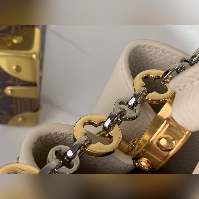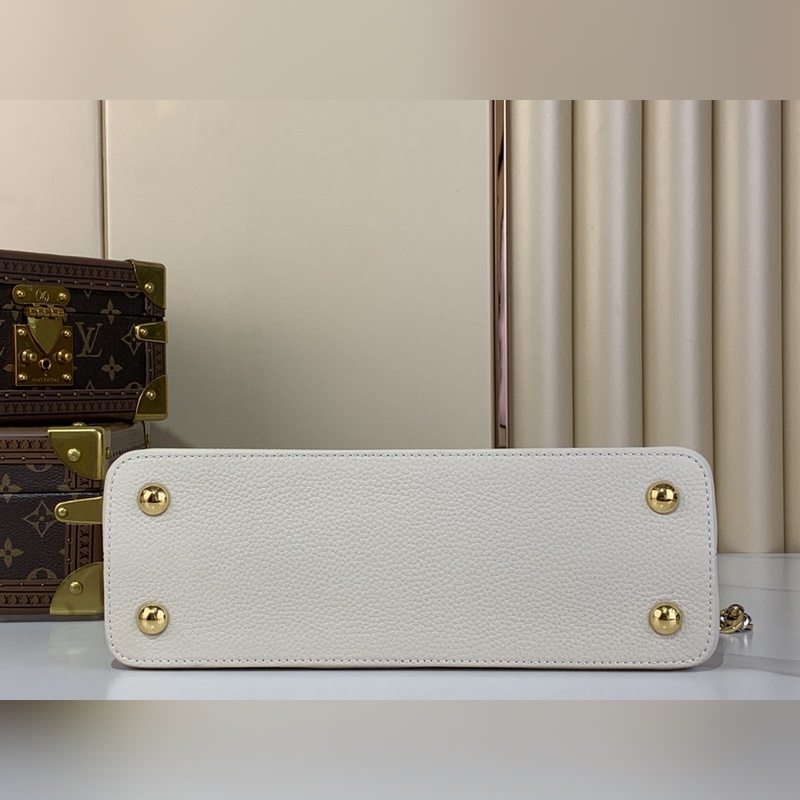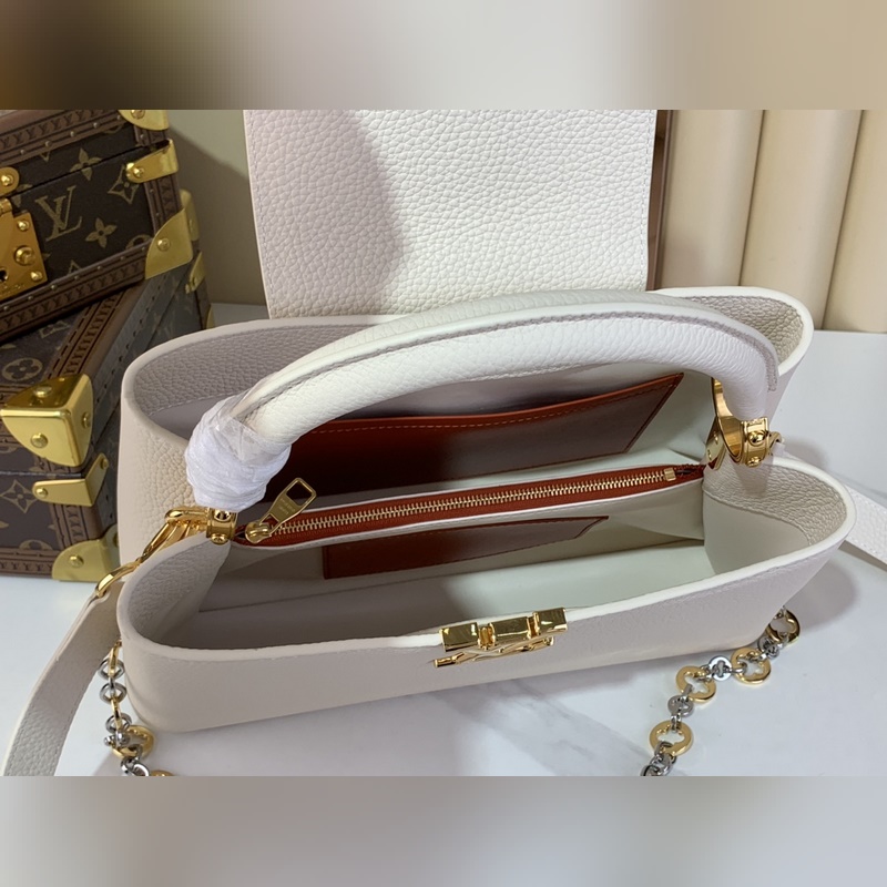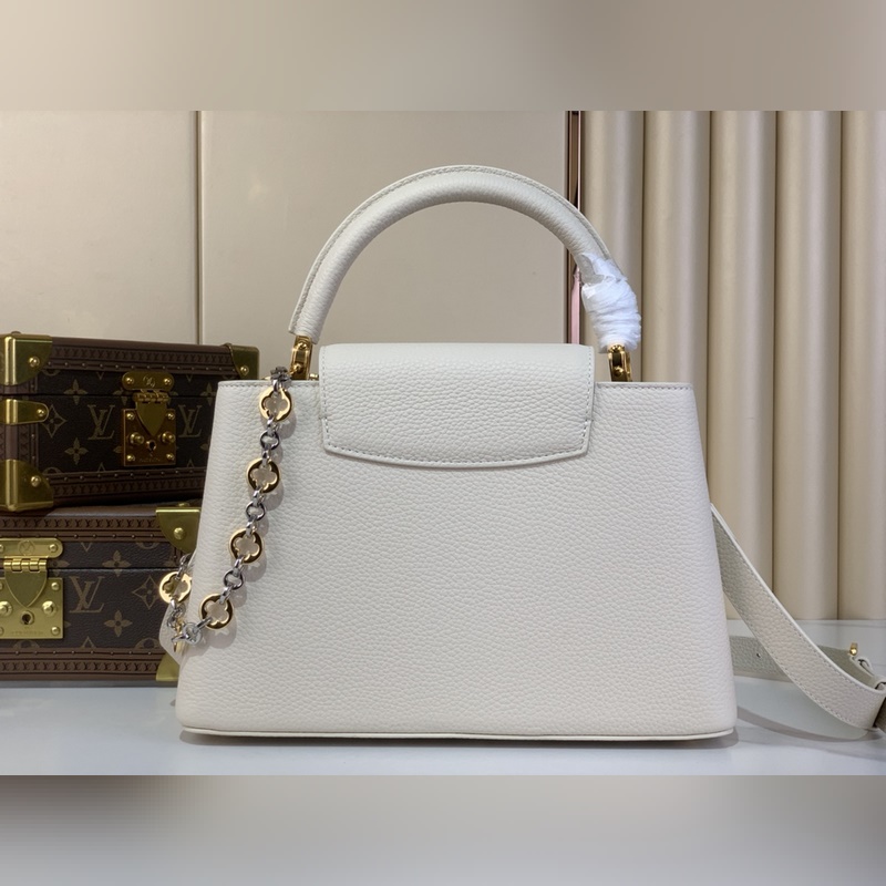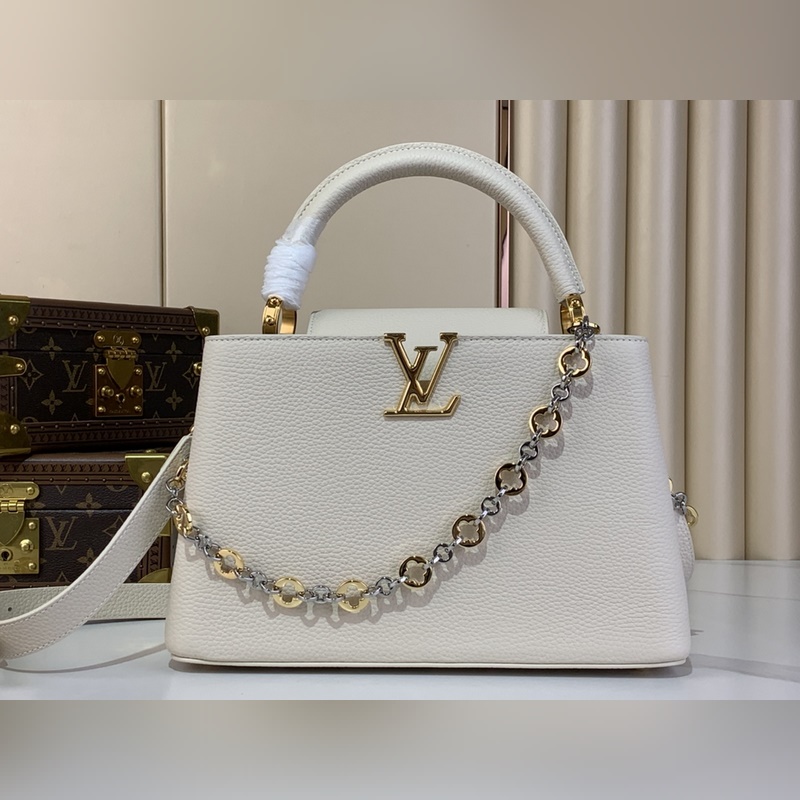 최상급 원단 복제품 독점 실물 촬영 [CAPUCINES 미디움 핸드백] M48865 M12935 화이트/주얼 체인 본 제품 Capucines 미디엄 핸드백은 Chain On You 시리즈로 Taurillon 소가죽을 통해 브랜드의 정교한 디자인과 우수한 장인정신을 보여줍니다. 주얼리 스타일의 이중 도금 체인이 Monogram 플라워를 장식하며 둥근 LV 로고와 금속 디테일이 세련된 터치를 더합니다. 크로스백 핸드백 숄더백으로 활용 가능하며 우아한 스타일을 연출합니다. 사이즈: 20 x 11 x 31.5 cm (높이 x 너비 x 길이)
