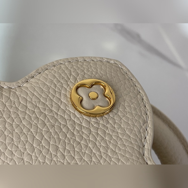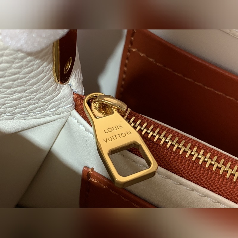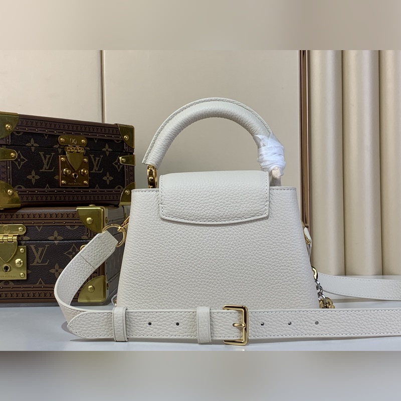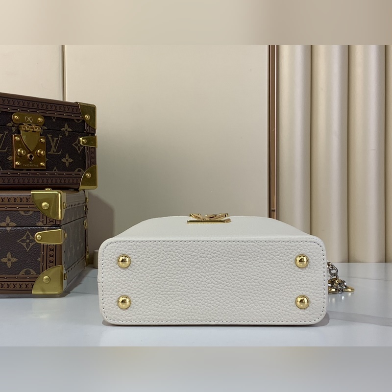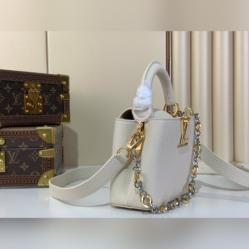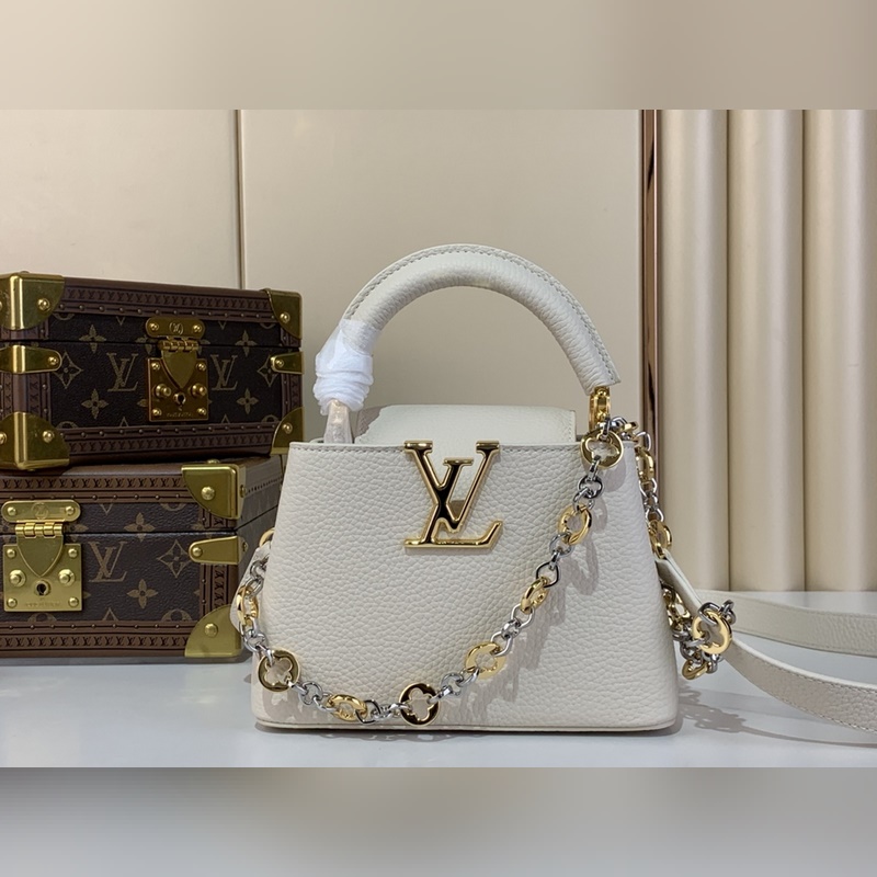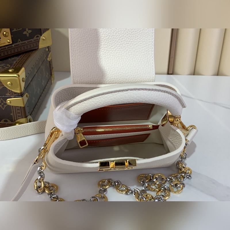 최상급 원단 복제품 독점 실물 촬영 [CAPUCINES 미니 핸드백] M48865 M12935 화이트/주얼 체인 본 Capucines 미디움 핸드백은 Chain On You 시리즈로 Taurillon 소가죽이 브랜드의 장인 정신과 정교한 공정을 보여줍니다. 주얼리 스타일의 이중 도금 체인이 Monogram 꽃무늬를 장식하며 둥근 LV 로고와 금속 부품이 세심한 디테일을 더합니다. 크로스백 핸드백 숄더백으로 활용 가능하며 우아한 스타일을 연출합니다. 사이즈: 14 x 8 x 21cm (높이 x 너비 x 길이)