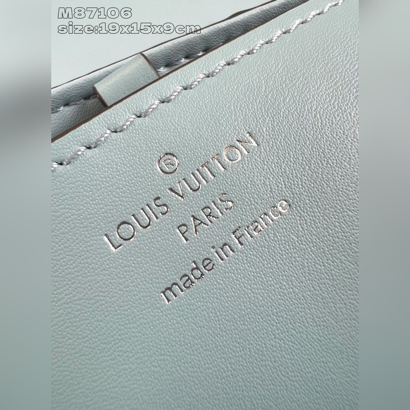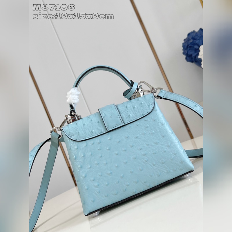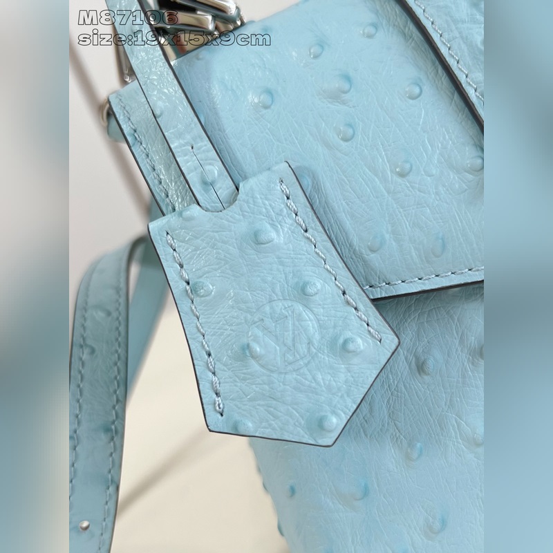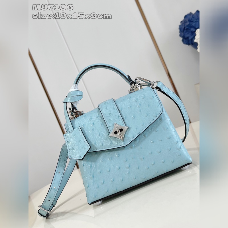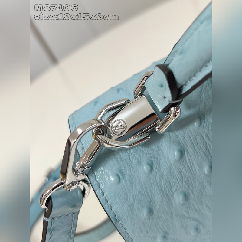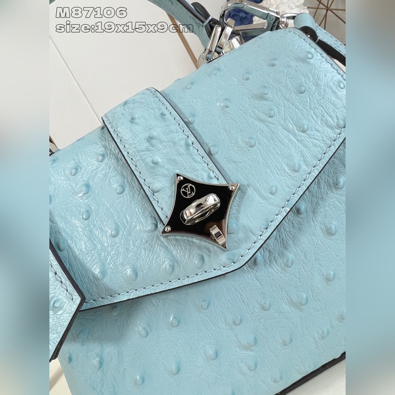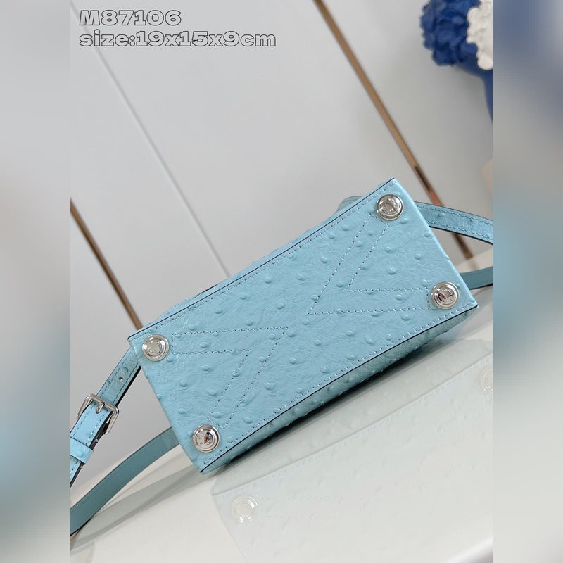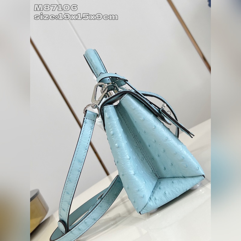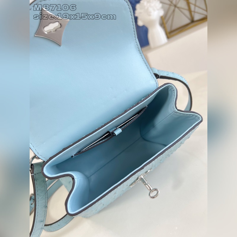 [독점 실사 M87106 옅은 블루 무광 타조 무늬 실버 코어/미니 ] 로즈 데 방 미니 핸드백은 매끄러운 소가죽과 그레인 소가죽으로 우아한 실루엣을 연출하며 골드 LV 자물쇠가 반짝이는 광채를 더합니다. 상단 핸들과 탈부착 및 길이 조절이 가능한 숄더 스트랩을 활용해 일상 속 우아한 엘보우 백 또는 실용적인 크로스백 등 다양한 스타일을 연출할 수 있습니다. 사이즈: 19 x 15 x 9cm