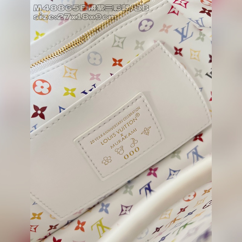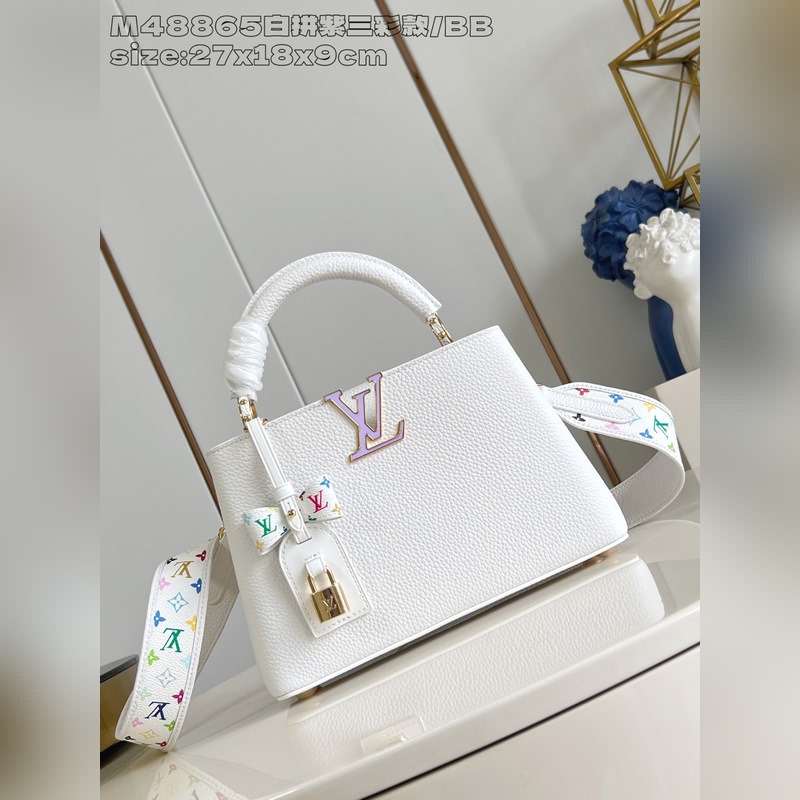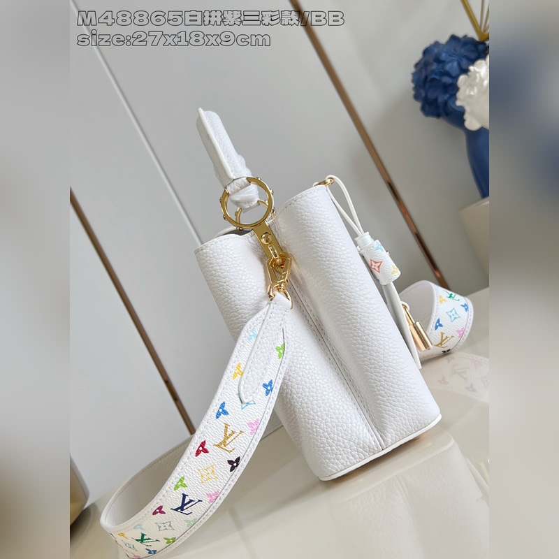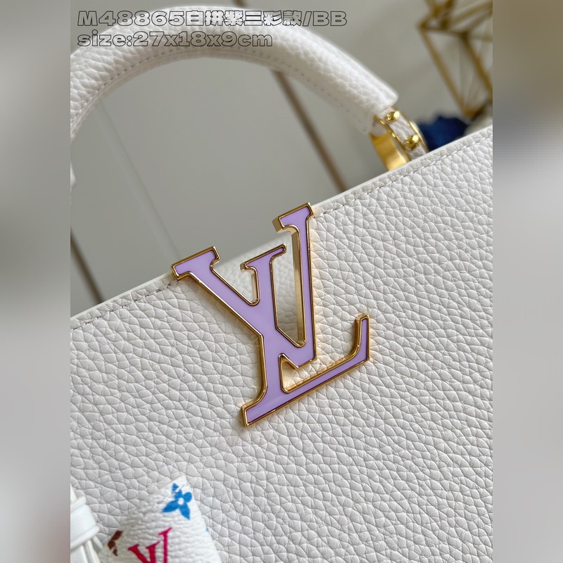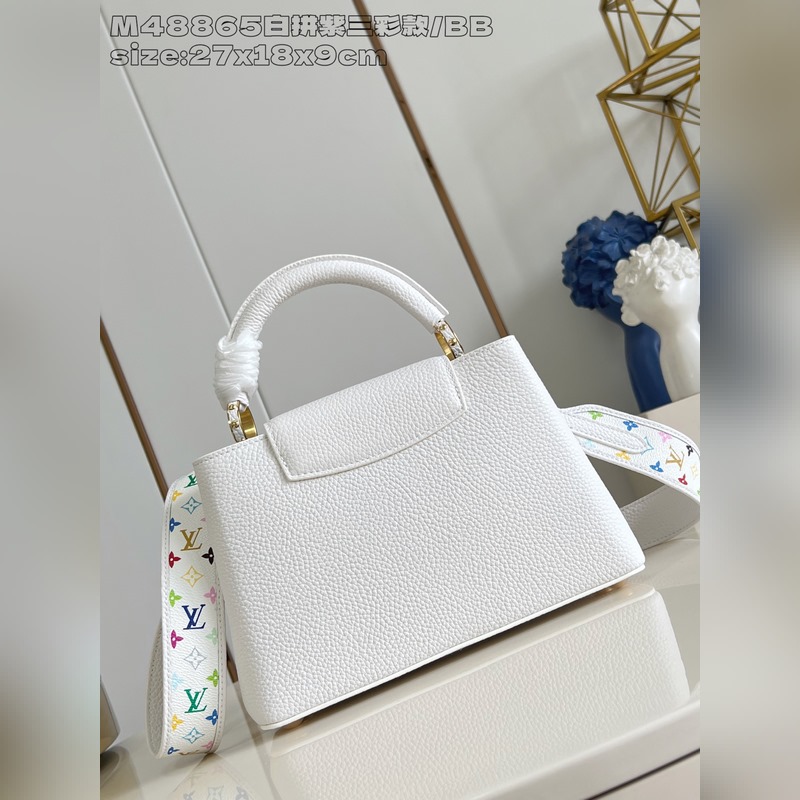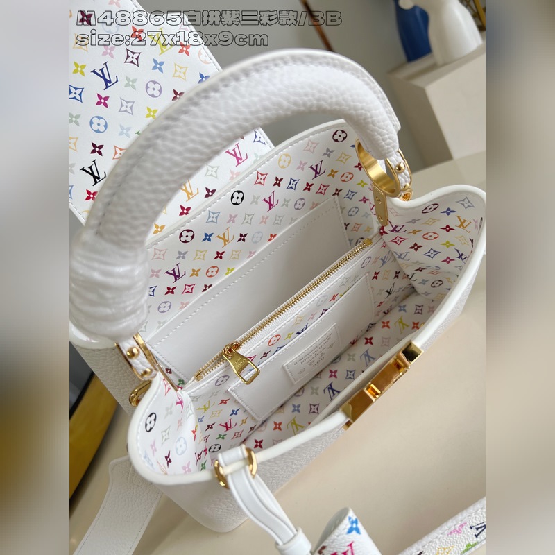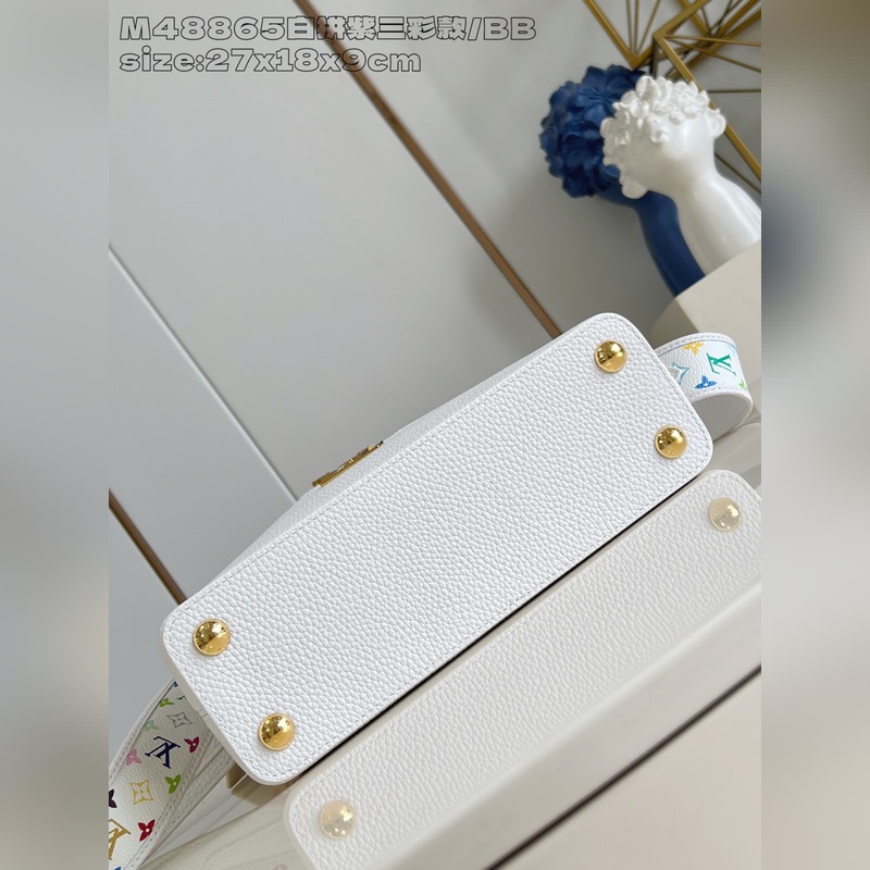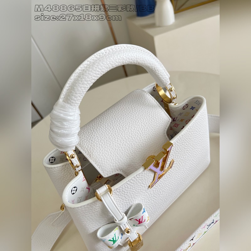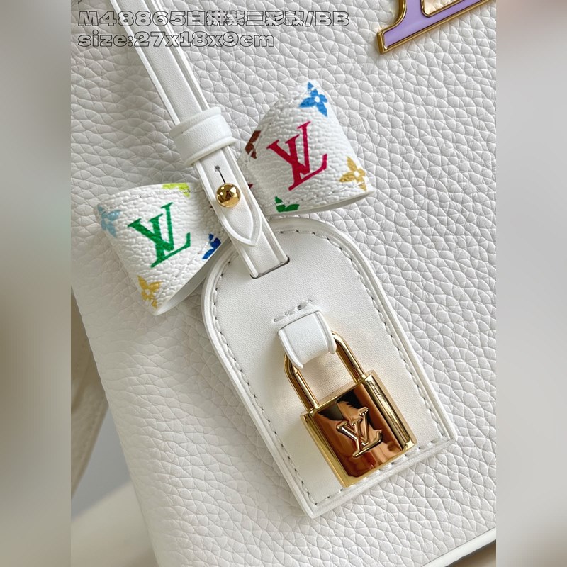 [독점 실사 M48865 화이트 & 퍼플 삼색 디자인/소형 ] 본 Capucines 핸드백은 루이 비통 x 무라카미 타카시 리이슈 컬렉션의 작품으로 타우리용 소가죽을 사용해 클래식한 디자인을 재치 있게 재해석했습니다. LV 로고와 탈부착 가능한 모노그램 숄더 스트랩은 화사한 색조로 물들여져 아티스트의 상징적인 무지개빛 터치를 연상시킵니다. 리본 모양 키 케이스와 자물쇠 장식이 세심한 디테일을 더하며 내부 칸막이와 다중 포켓으로 일상 소지품을 편리하게 수납할 수 있습니다. 17.3 x 9 x 27 cm (높이 x 너비 x 길이)