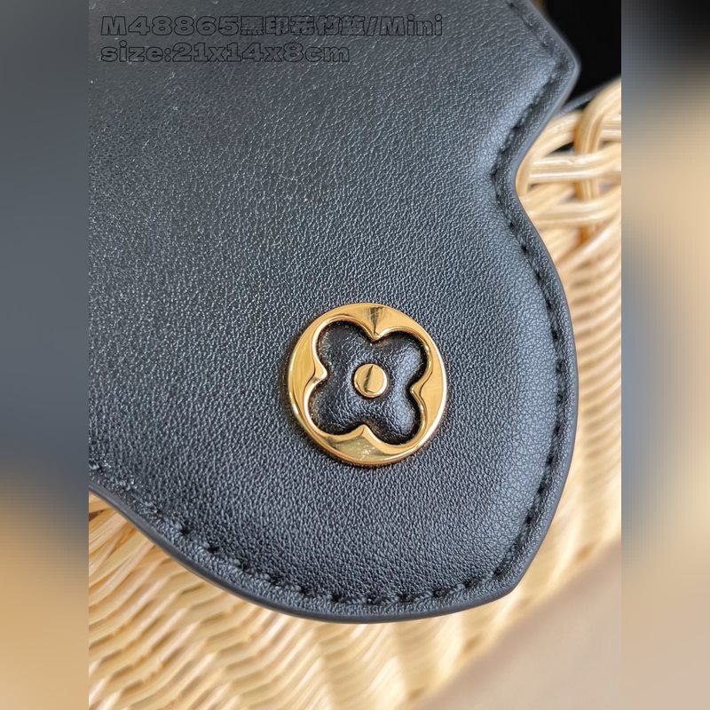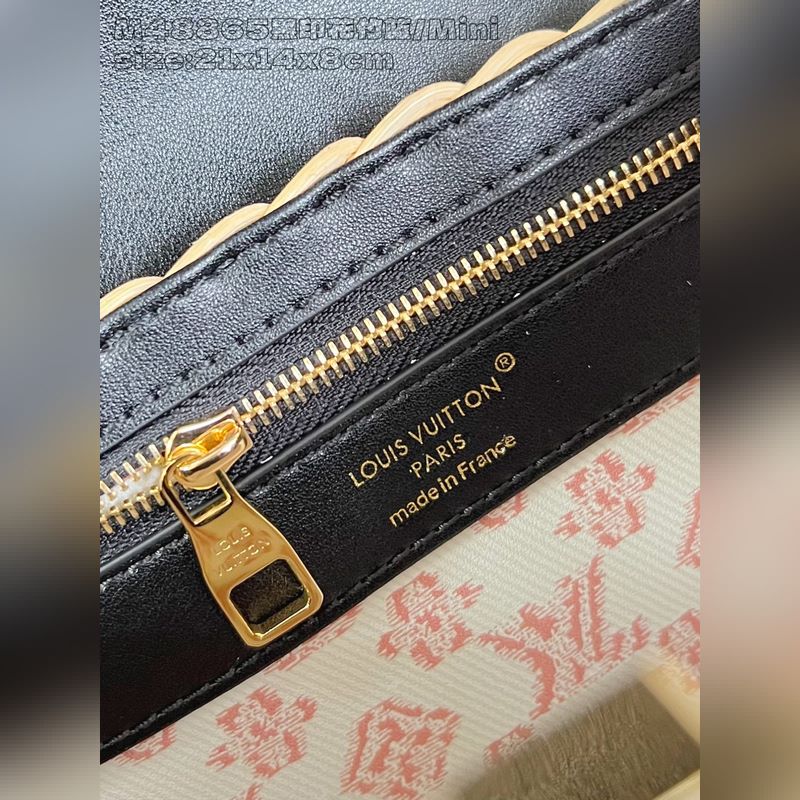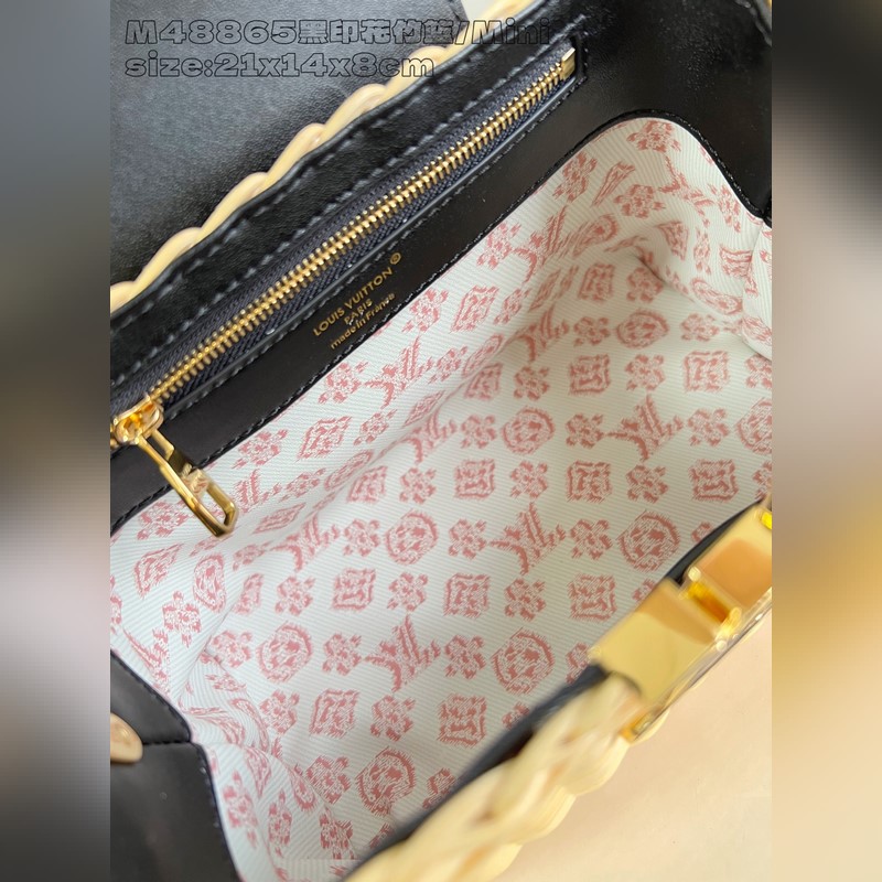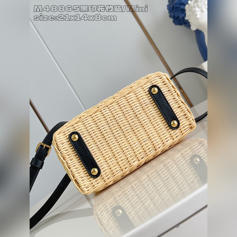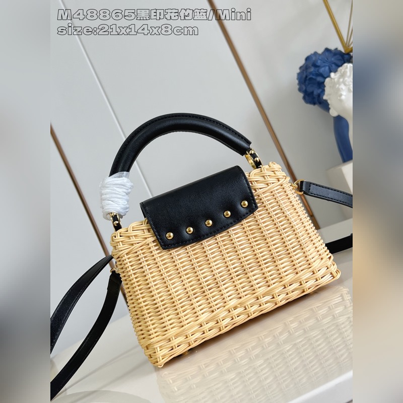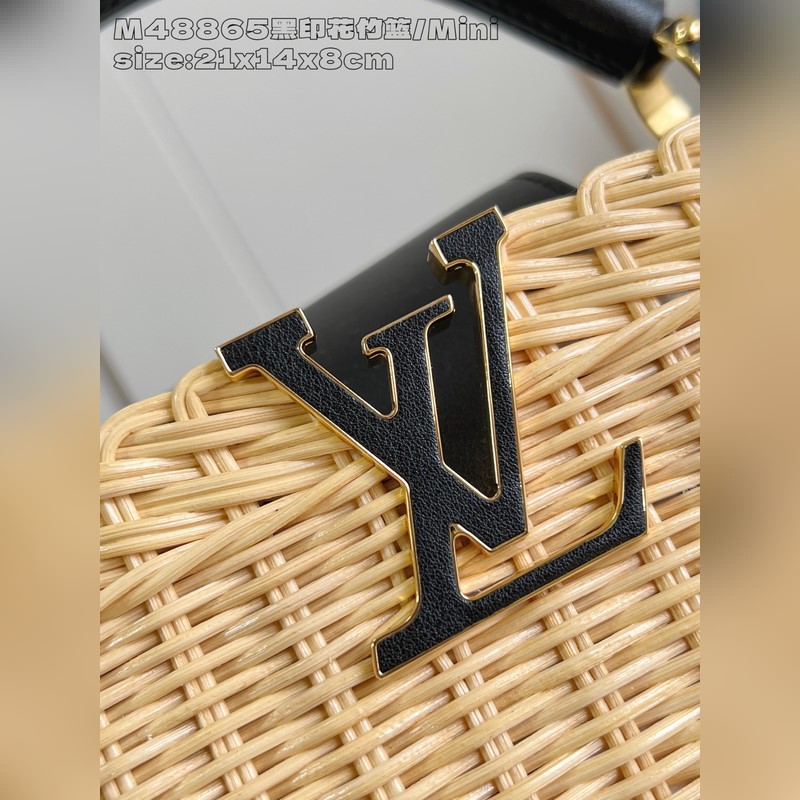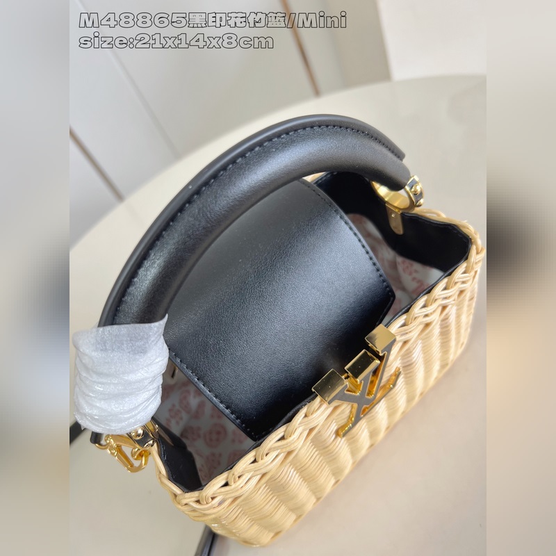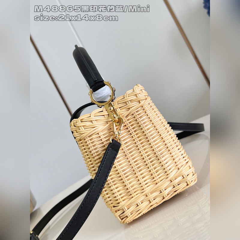 [독점 실사 M48865 블랙 프린트 대나무 바구니/미니] M26003 이 캡시네 미니 핸드백은 1892년 루이 비통이 선보인 피크닉 하드 케이스에서 영감을 받아 여름의 정취를 가득 담았습니다. 대나무 바구니 몸체는 수일의 정교한 엮기 작업이 필요하며 가죽 트림과 눈부신 LV 로고가 디테일을 완성합니다. 크로스백 숄더백 또는 핸드백으로 활용 가능합니다. 21 x 8 x 14 cm (높이 x 너비 x 길이)