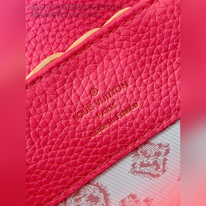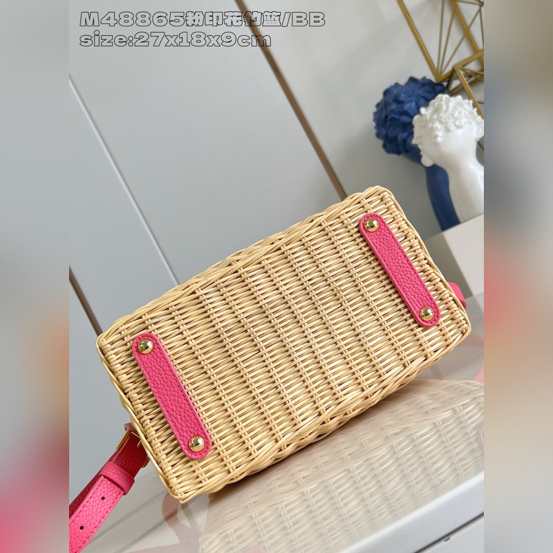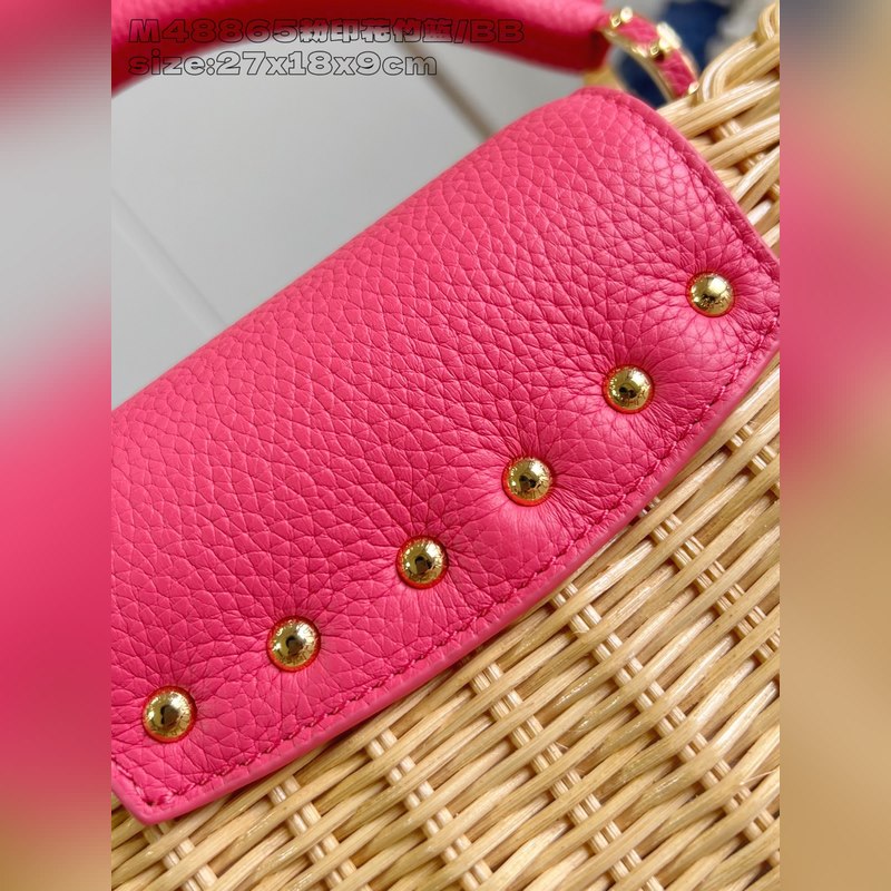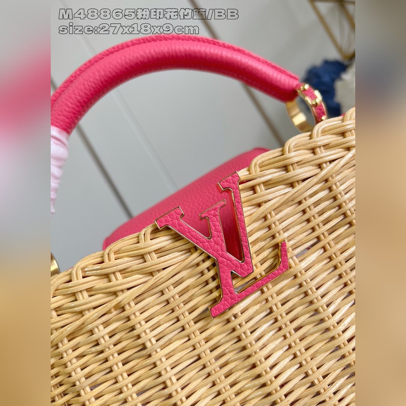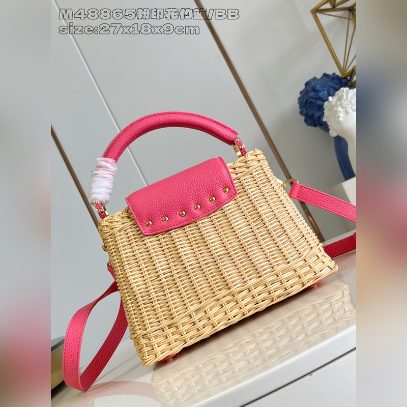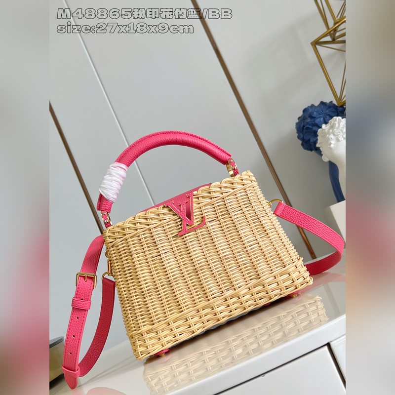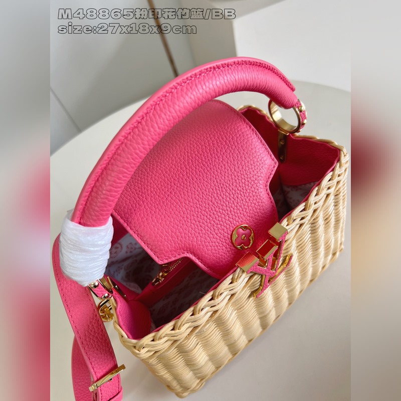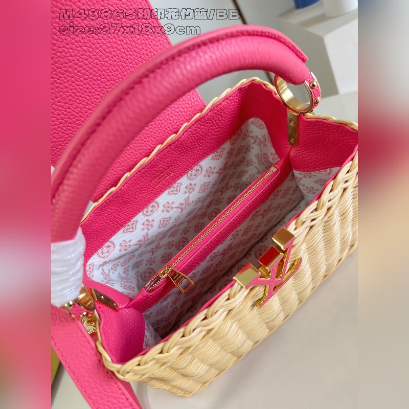 [독점 실사 M48865 핑크 프린트 대나무 바구니/소형] 이 Capucines BB 핸드백은 1892년 루이 비통이 선보인 피크닉 하드 케이스에서 영감을 받아 여름의 정취를 물씬 풍깁니다. 대나무 바구니 몸체는 수일의 정교한 엮기 작업이 필요하며 가죽 트림과 눈부신 LV 로고가 디테일을 완성합니다. 크로스백 숄더백 또는 핸드백으로 활용 가능합니다. 27 x 9 x 18 cm (높이 x 너비 x 길이)
