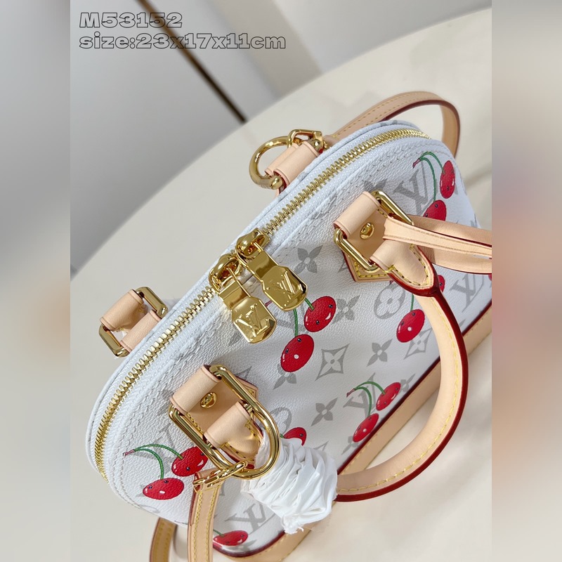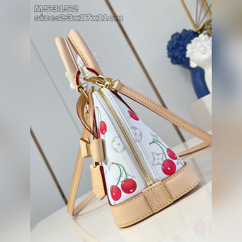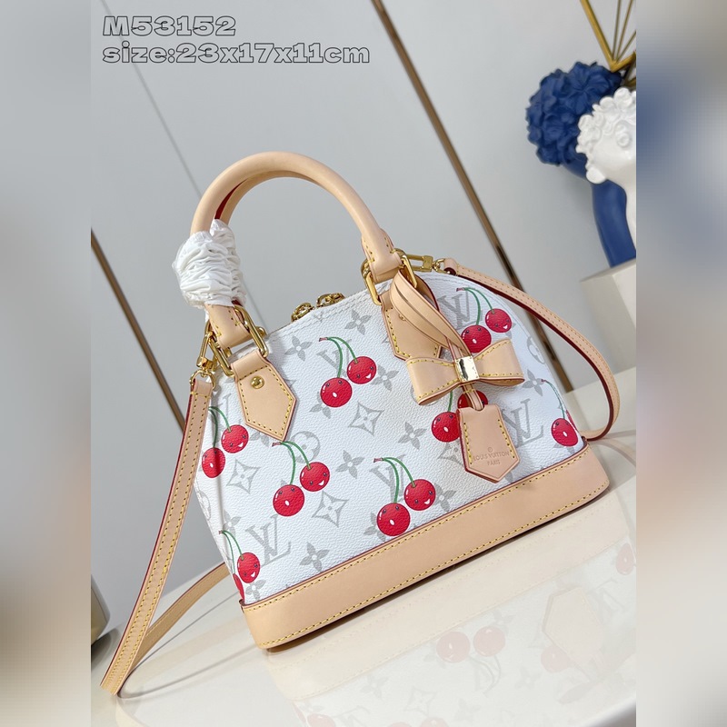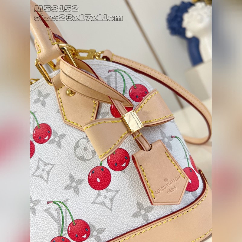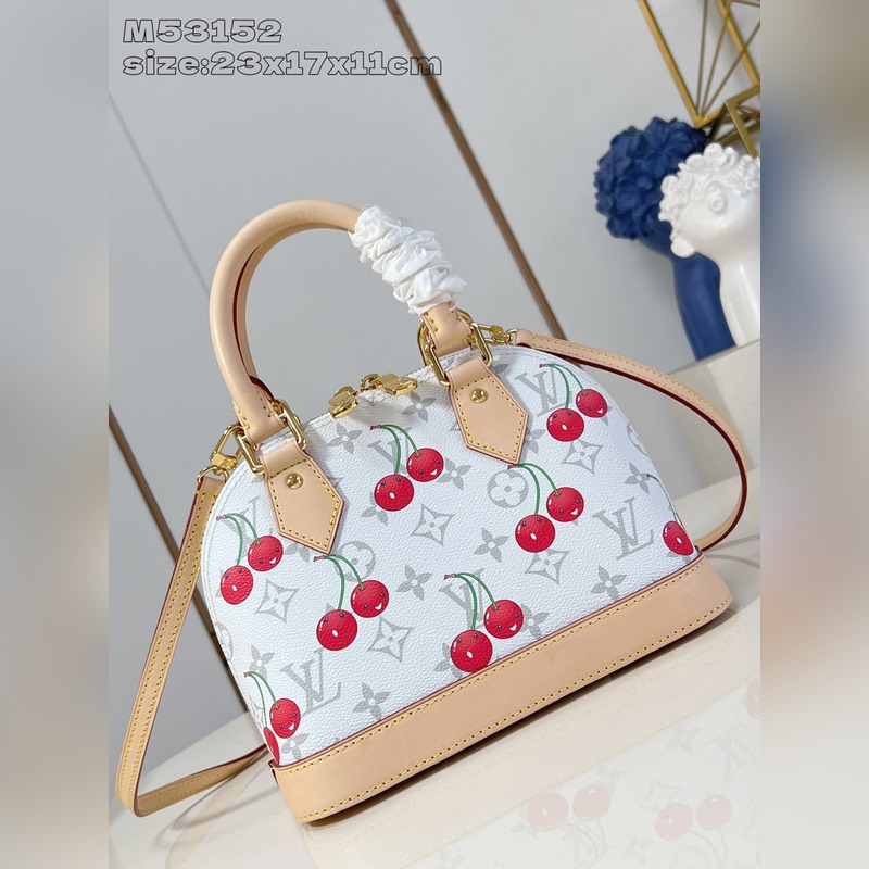 탑급 원단 [M53152 체리 ] M14234 이 세련된 Alma BB 핸드백은 유쾌한 리메이크 버전인 루이 비통 x 무라카미 컬렉션에서 탄생했습니다. 브랜드의 클래식한 모노그램 코팅 캔버스로 장식 예술 스타일의 실루엣을 구현했으며 선명한 색조로 일본 예술가 무라카미 타카시의 화려한 체리 패턴을 강조했습니다. 가방은 상징적인 천연 가죽으로 우아한 토론 핸들 바닥 부분 및 유머러스한 리본 모양 키홀더에 주목할 만한 스타일을 더했습니다. 23.5 x 17.5 x 11.5 cm (길이 x 높이 x 너비)