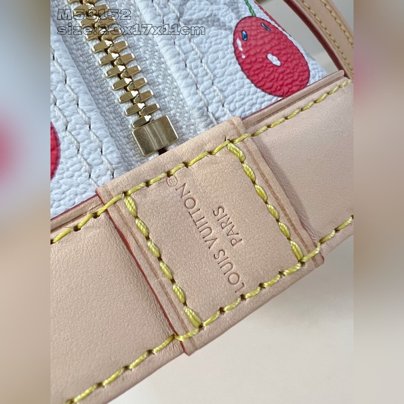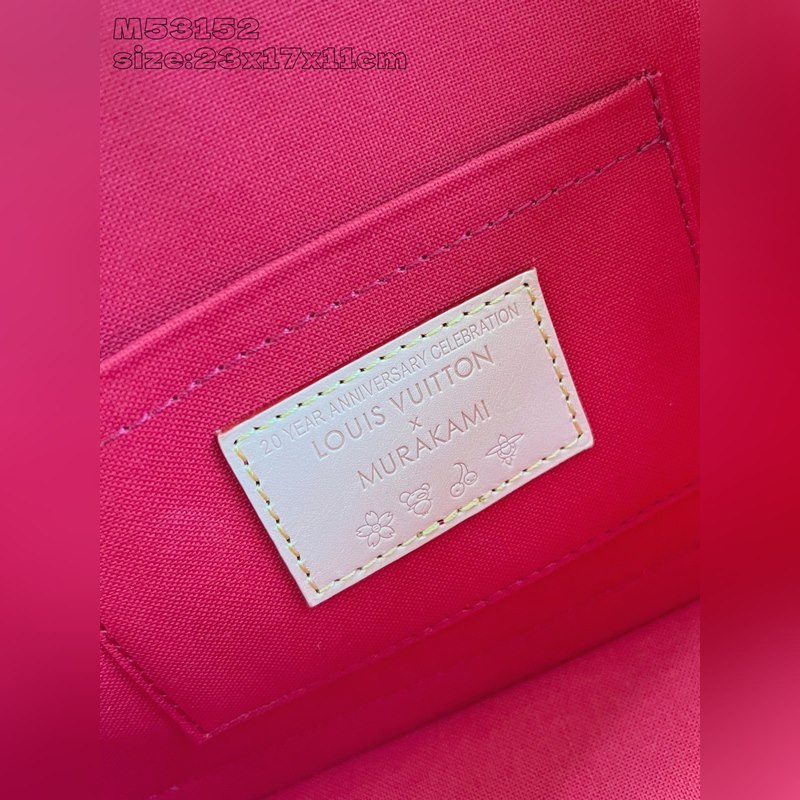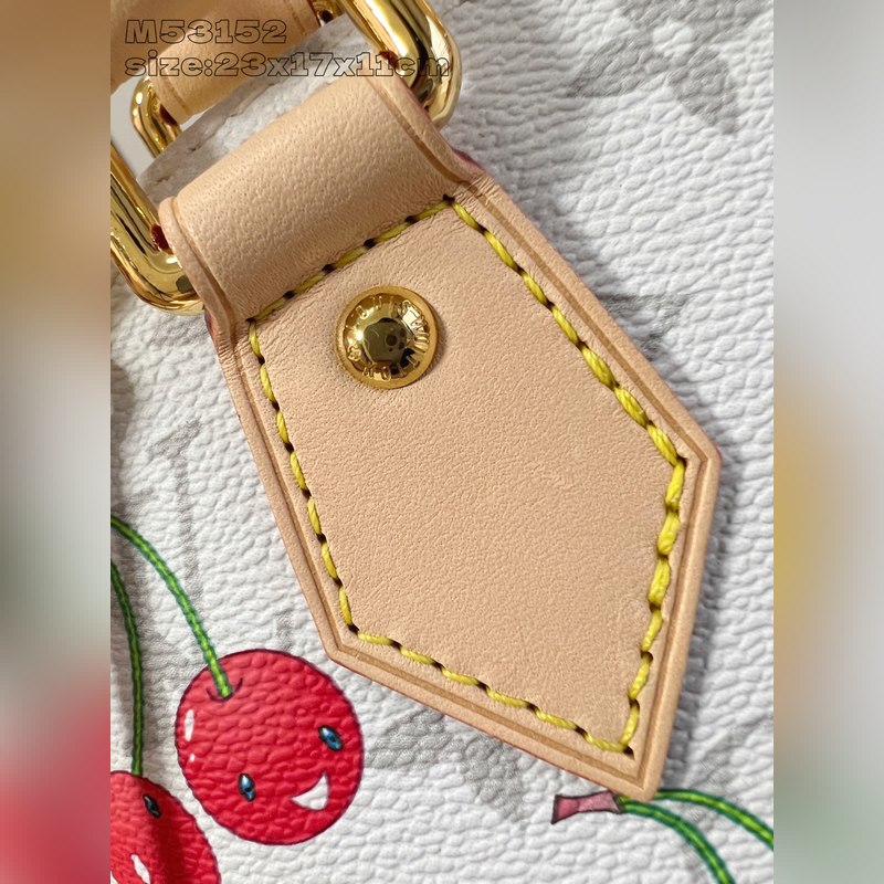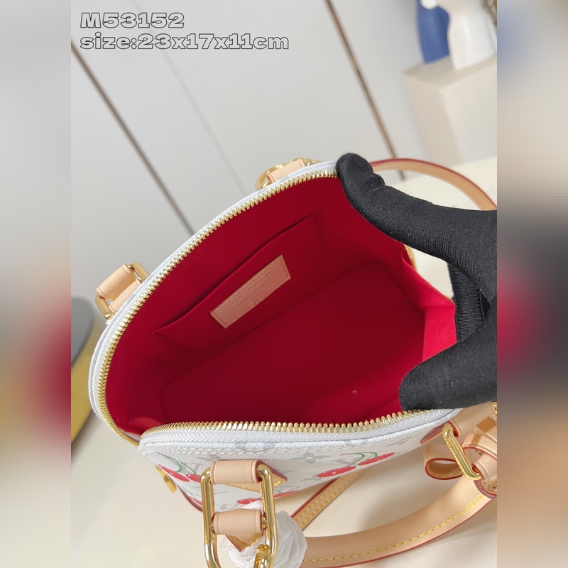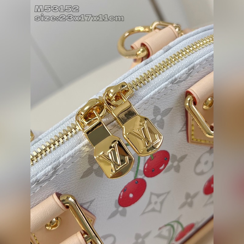 탑급 원단 [M53152 체리 ] M14234 이 세련된 Alma BB 핸드백은 유쾌한 리메이크 버전인 루이 비통 x 무라카미 컬렉션에서 탄생했습니다. 브랜드의 클래식한 모노그램 코팅 캔버스로 장식 예술 스타일의 실루엣을 구현했으며 선명한 색조로 일본 예술가 무라카미 타카시의 화려한 체리 패턴을 강조했습니다. 가방은 상징적인 천연 가죽으로 우아한 토론 핸들 바닥 부분 및 유머러스한 리본 모양 키홀더에 주목할 만한 스타일을 더했습니다. 23.5 x 17.5 x 11.5 cm (길이 x 높이 x 너비)