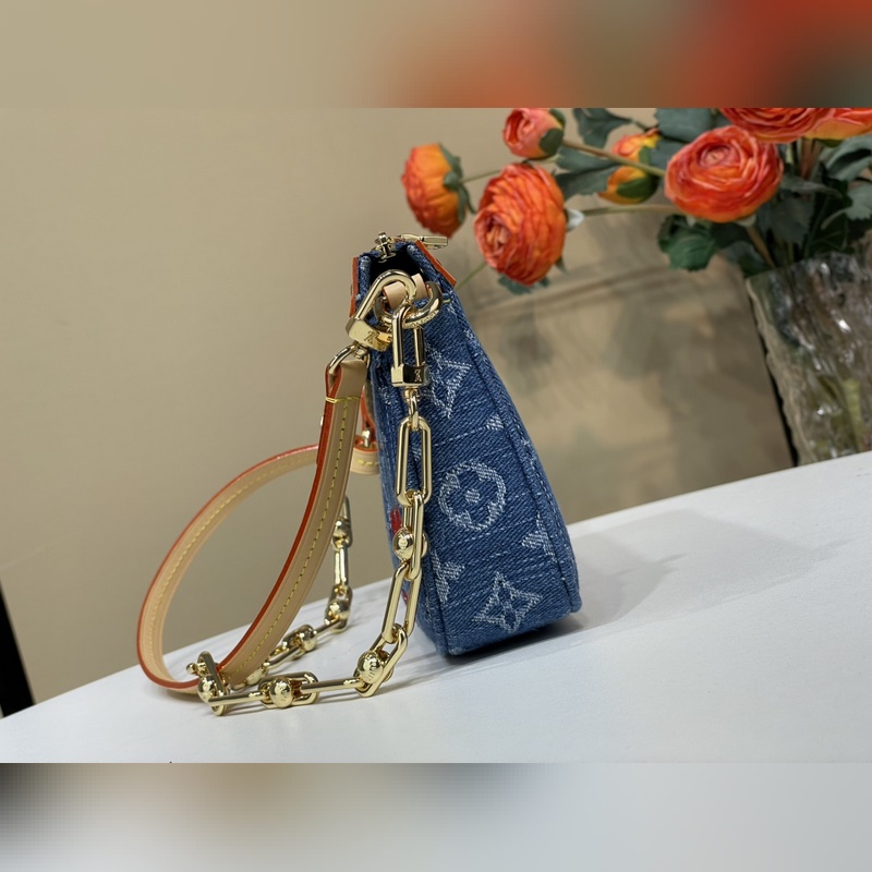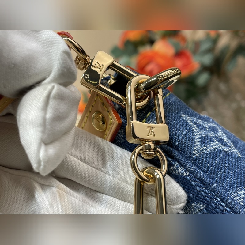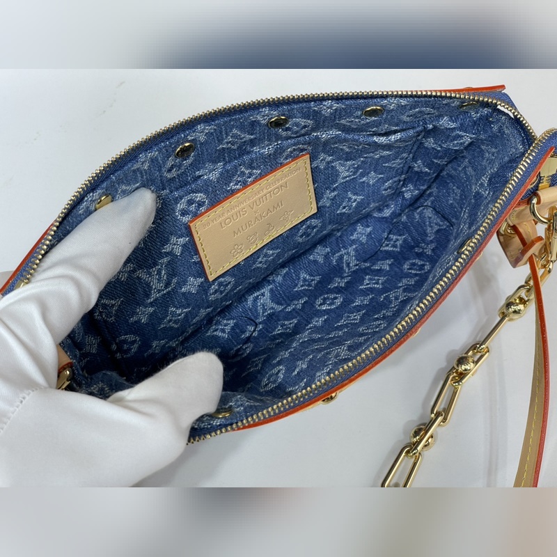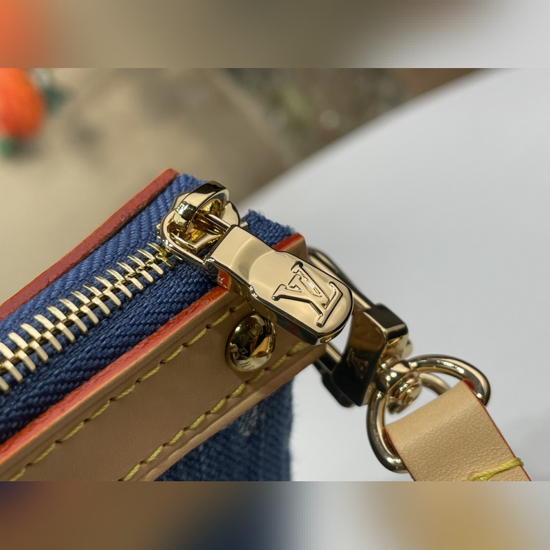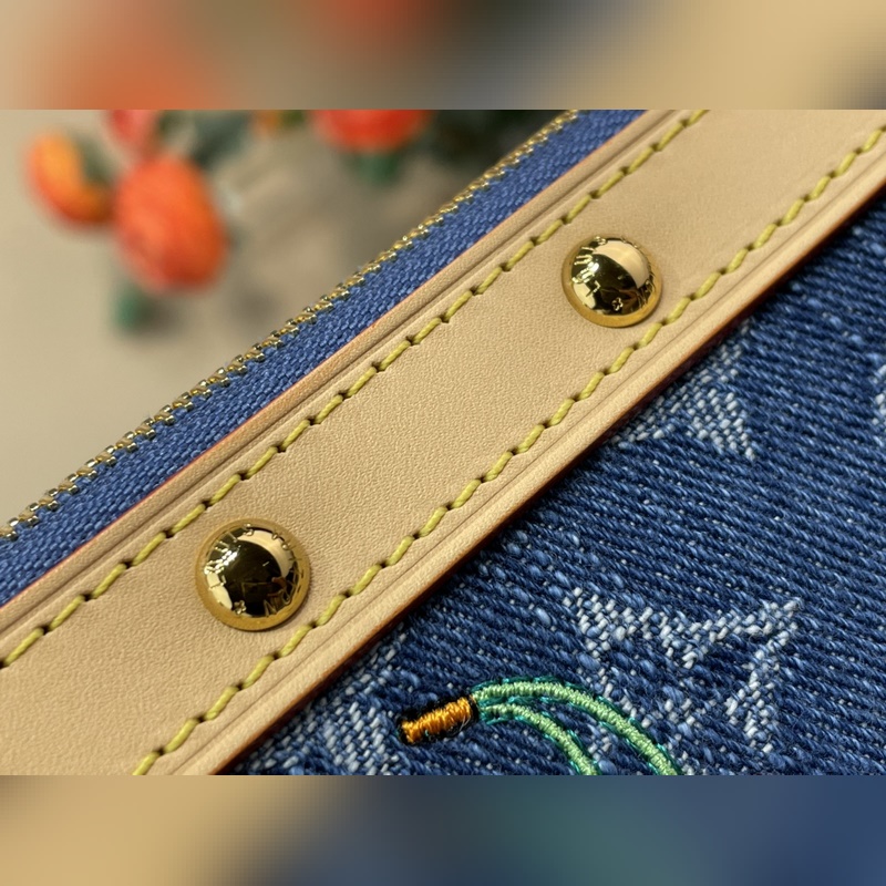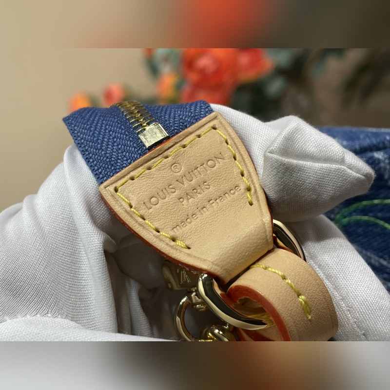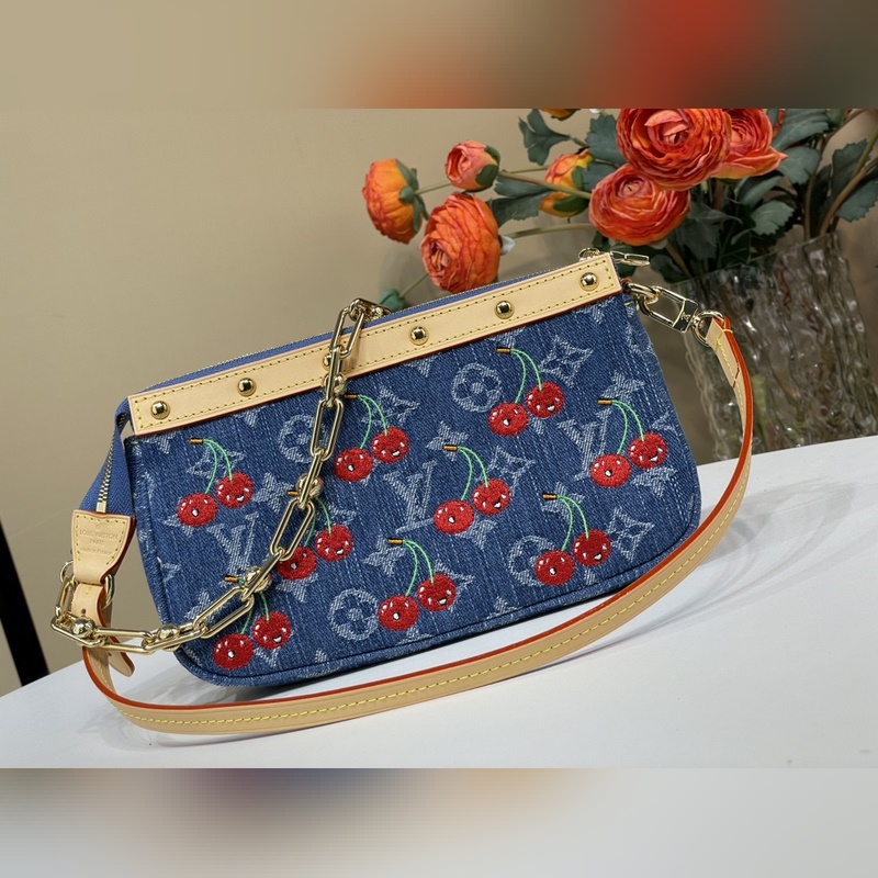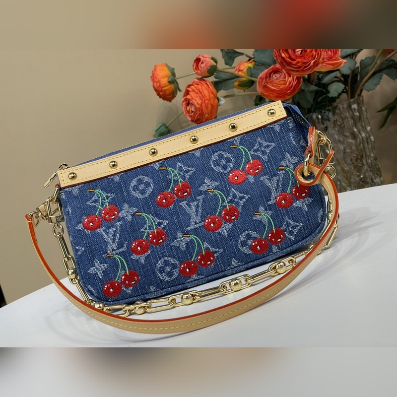 탑급 원단 복제품 독점 실물 촬영 [포셰트 액세서리 마작 가방 핸드백] m13994 블루 데님/ 체리 Pochette Accessoires 핸드백이 루이 비통 x 무라카미 타카시 리메이크 시리즈에 합류했습니다. 모노그램 데님 원단이 체리 자수 패턴의 생동감 넘치는 분위기를 강조하며 이 일본 예술가의 유희적인 미학 철학을 구현합니다. 가죽 트림의 스터드 장식과 반짝이는 금속 디테일이 풍부한 디테일을 더합니다. 사이즈: 13 x 4 x 22 cm