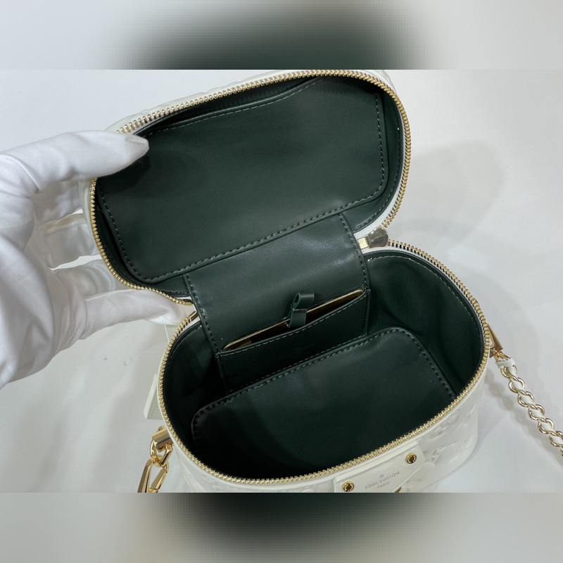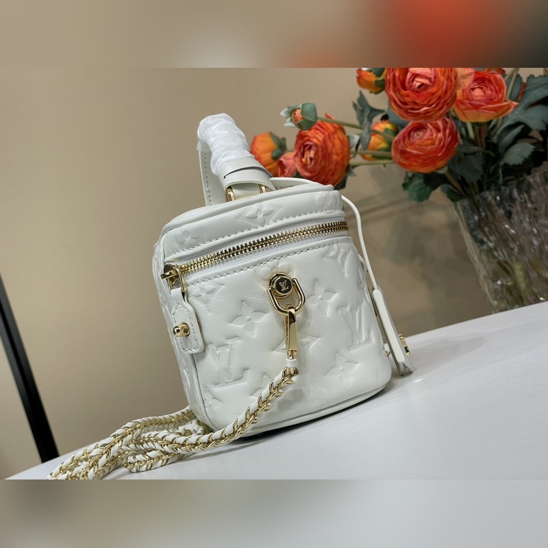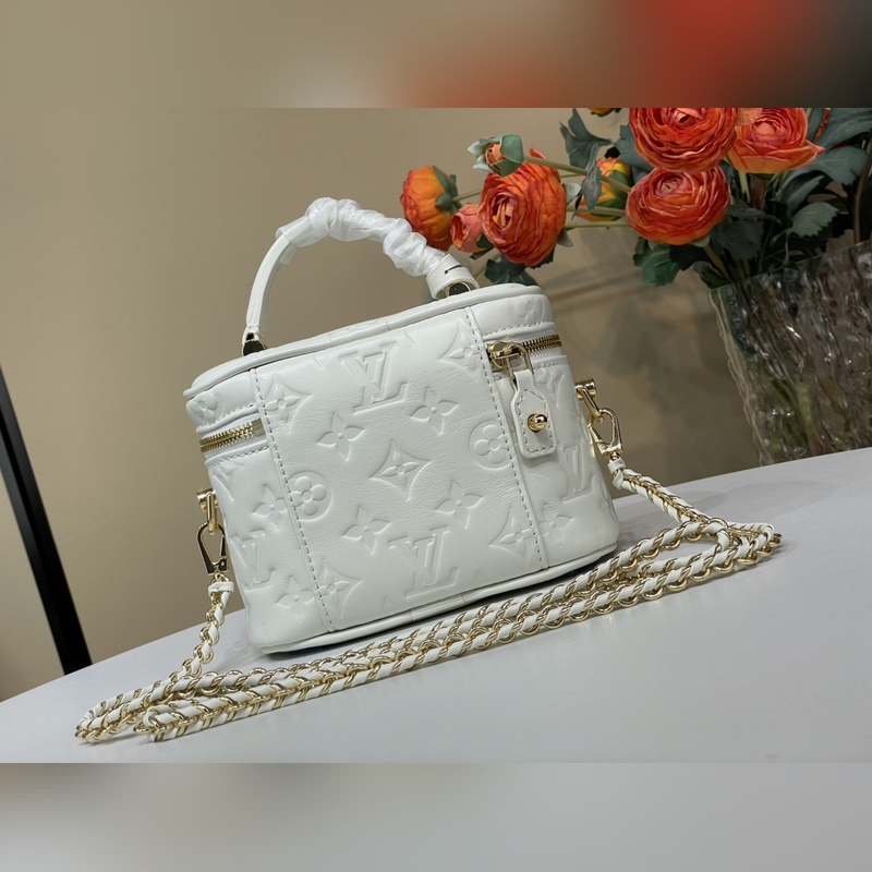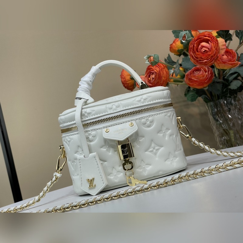 탑급 원단 복제품 독점 실물 촬영 [Vanity 소형 메이크업 핸드백] M25123 블랙 25219 화이트 (엠보싱) 본 Vanity 소형 핸드백은 푹신한 양가죽을 소재로 부드럽고 가벼운 디자인으로 Nicolas Ghesqui?re의 도시형 핸드백에 대한 새로운 해석을 보여줍니다. 눈부신 LV 자물쇠와 가죽 키 케이스가 브랜드 정체성을 표시하며 탈부착 가능한 가죽 체인 스트랩으로 손잡이 어깨 크로스백으로 활용 가능합니다. 사이즈: 19 x 13 x 11 cm