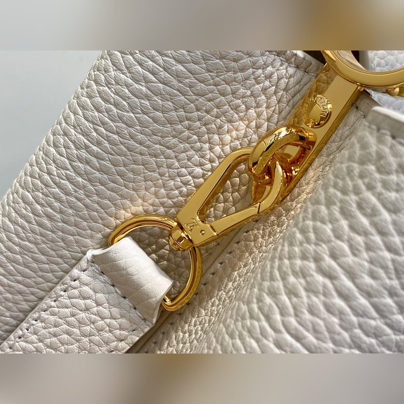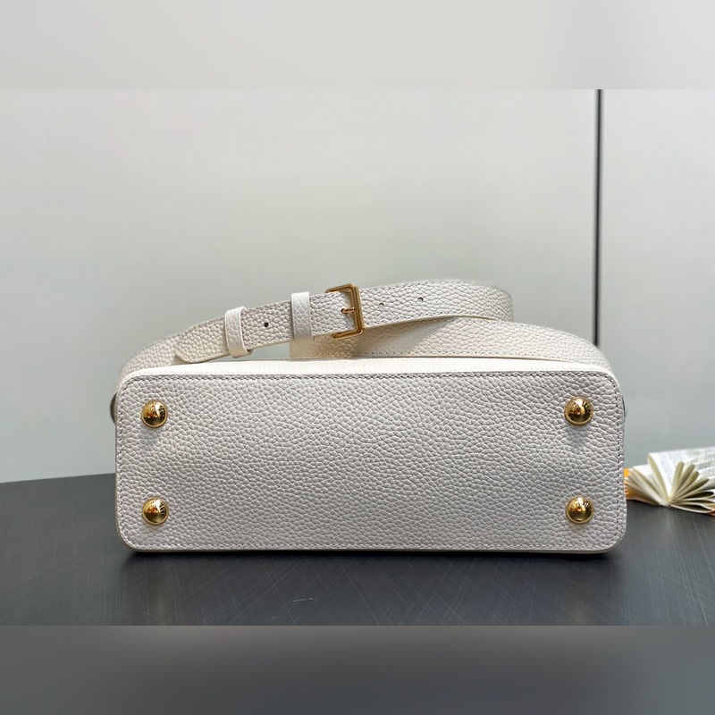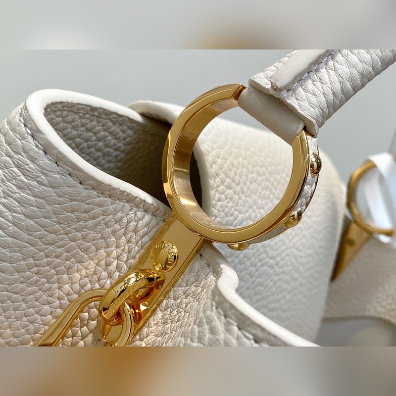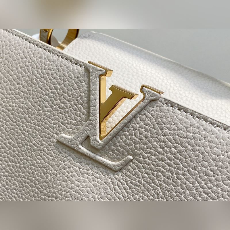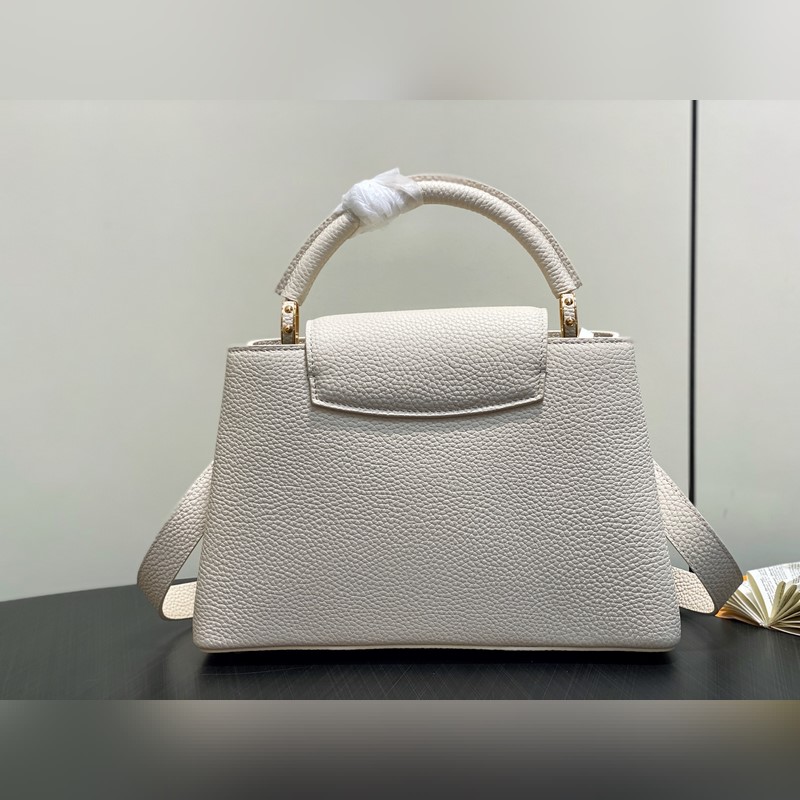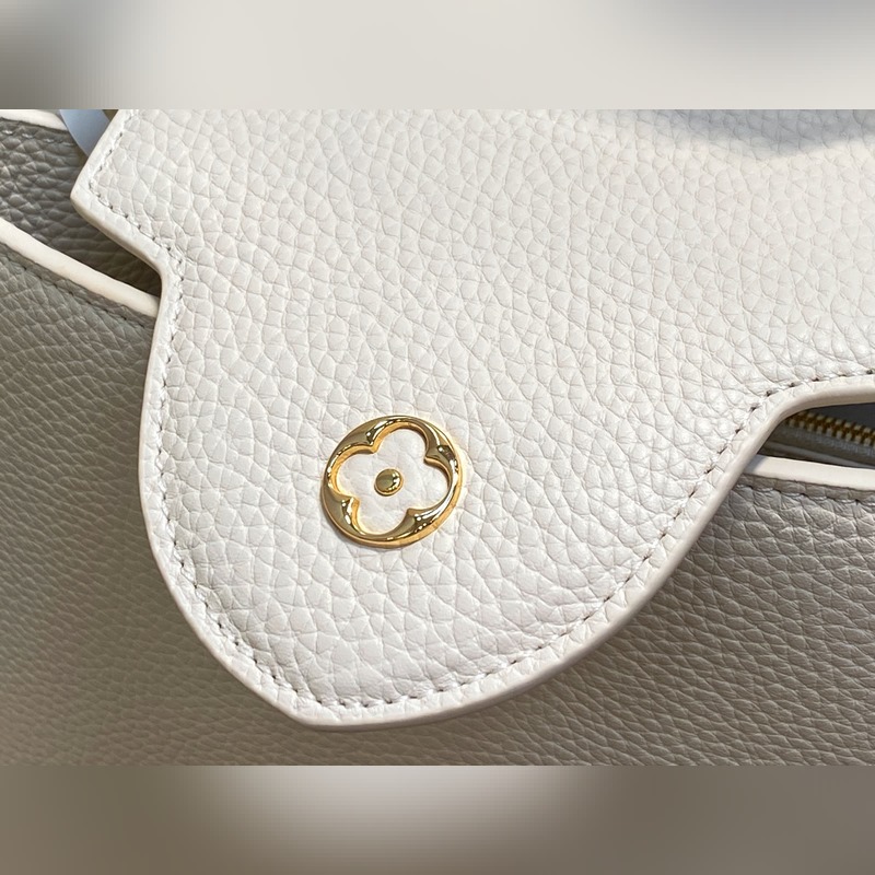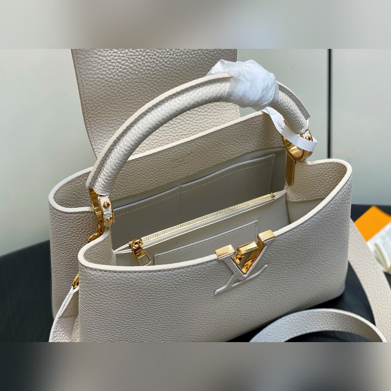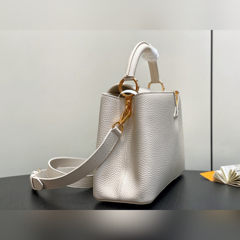 M24545 미백색 풀 가죽 캡 나잉 스타일 시리즈 CAPUCINES 미디엄 핸드백 Capucines 미디엄 핸드백은 2013년 출시되었으며 1854년 루이 비통이 파리에서 첫 매장을 연 거리의 이름을 따서 명명되었습니다. 전체 그레인 타우리용 소가죽에 클래식 플랩 디자인: 외부는 모노그램 플라워가 화려하게 장식되었고 내부는 가죽으로 감싸인 LV 로고가 자리합니다. 가벼운 구조로 하루 종일 휴대하기에 적합하며 탈부착 가능한 숄더 스트랩으로 핸드백 숄더백 또는 크로스백으로 활용 가능합니다. 31 x 20 x 11 cm.