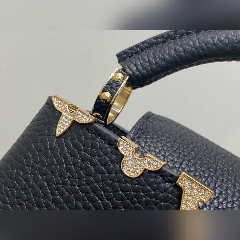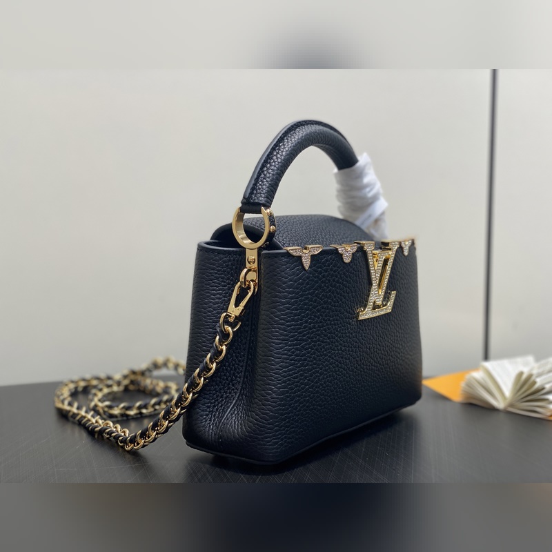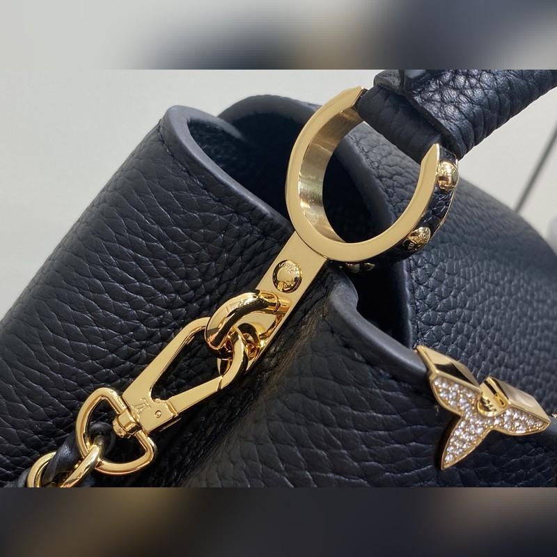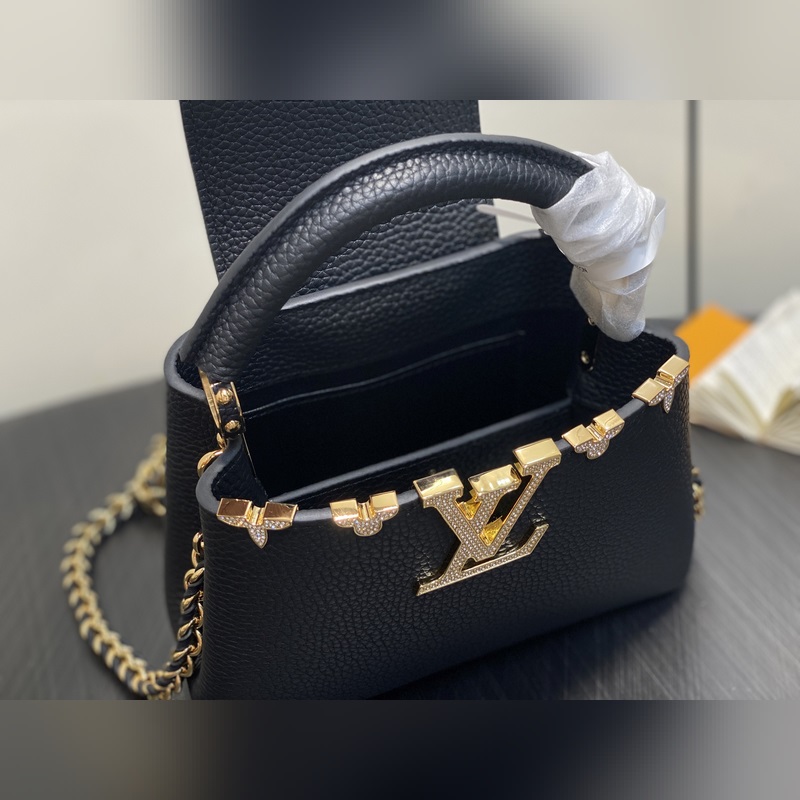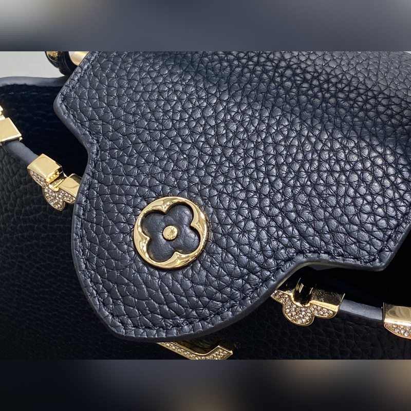 M48865 블랙 골드 다이아몬드 플라워 캡시네스 미니 핸드백 프랑스산 송아지 가죽 반짝이는 메탈 디테일 특유의 캡시네스 덮개는 가방 안에 넣어 모노그램 로고를 드러내거나 바깥으로 펼쳐 플라워 패턴을 연출할 수 있습니다. 사이즈: 21x14x8 cm.
