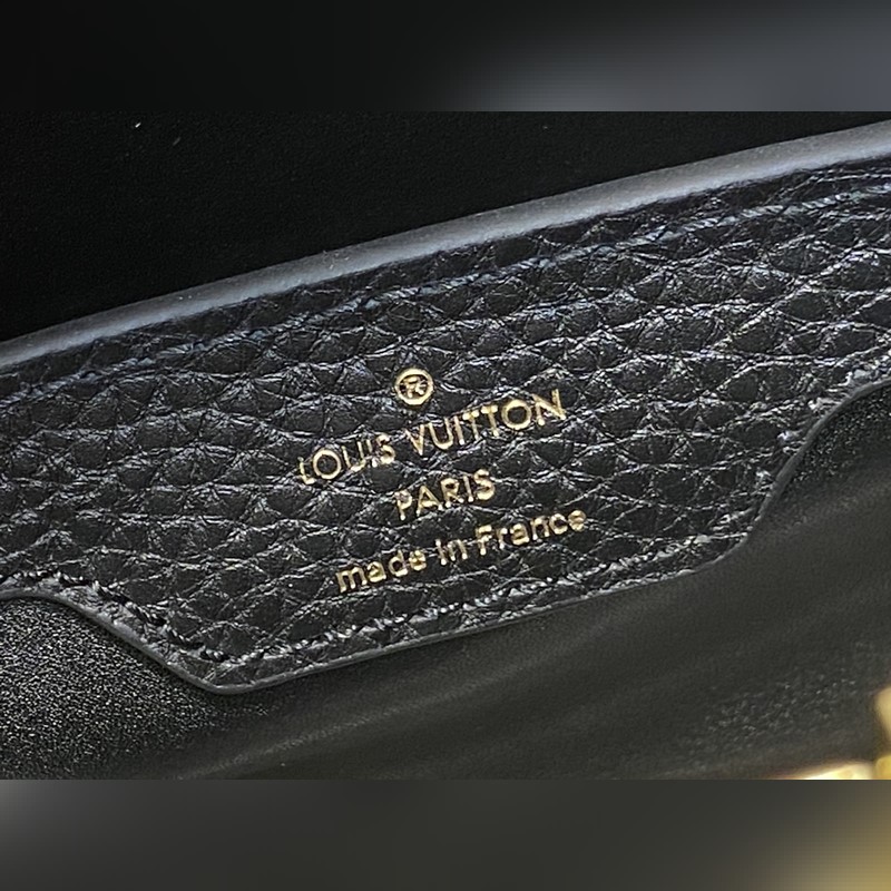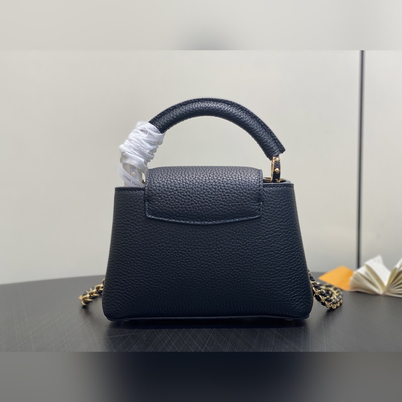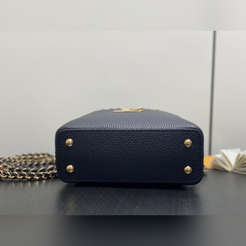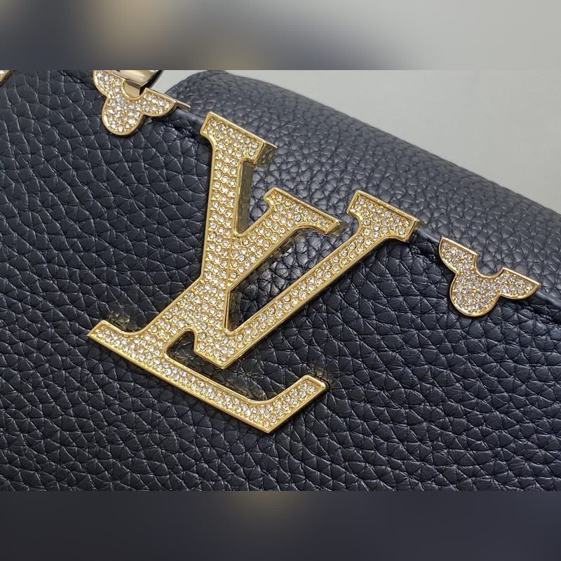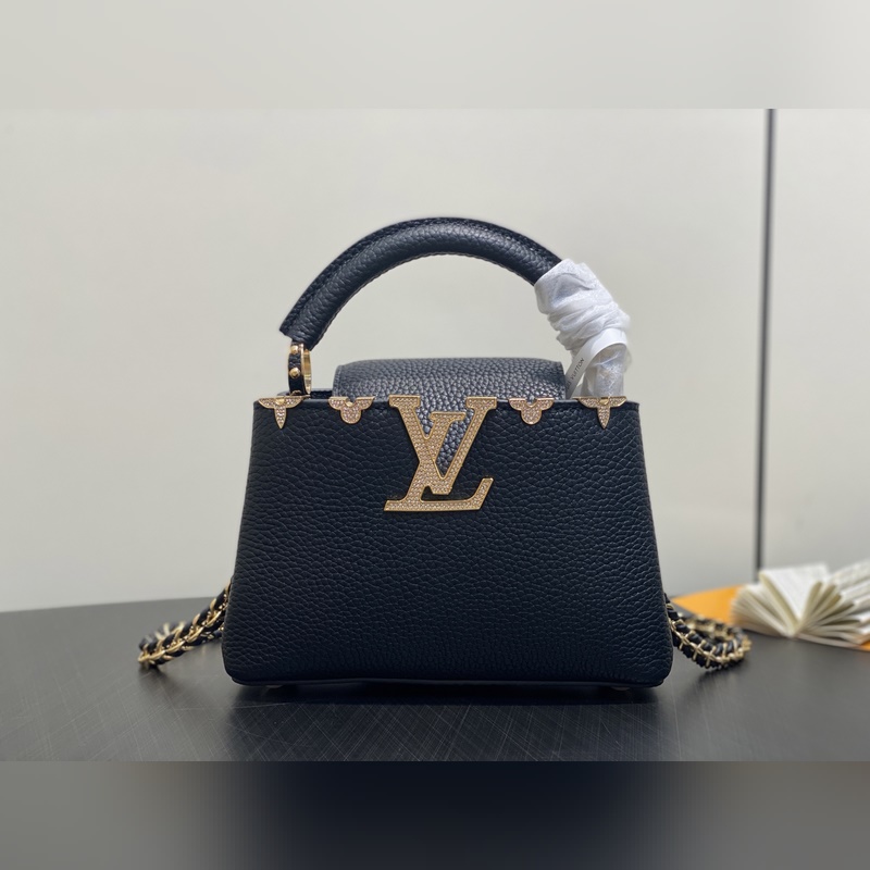 M48865 블랙 골드 다이아몬드 플라워 캡시네스 미니 핸드백 프랑스산 송아지 가죽 반짝이는 메탈 디테일 특유의 캡시네스 덮개는 가방 안에 넣어 모노그램 로고를 드러내거나 바깥으로 펼쳐 플라워 패턴을 연출할 수 있습니다. 사이즈: 21x14x8 cm.