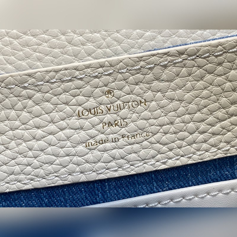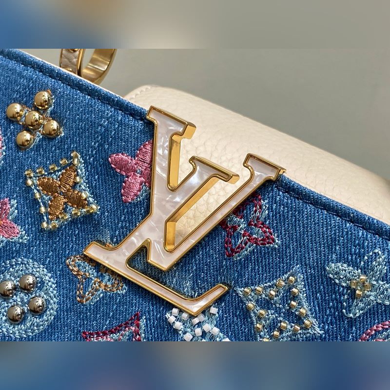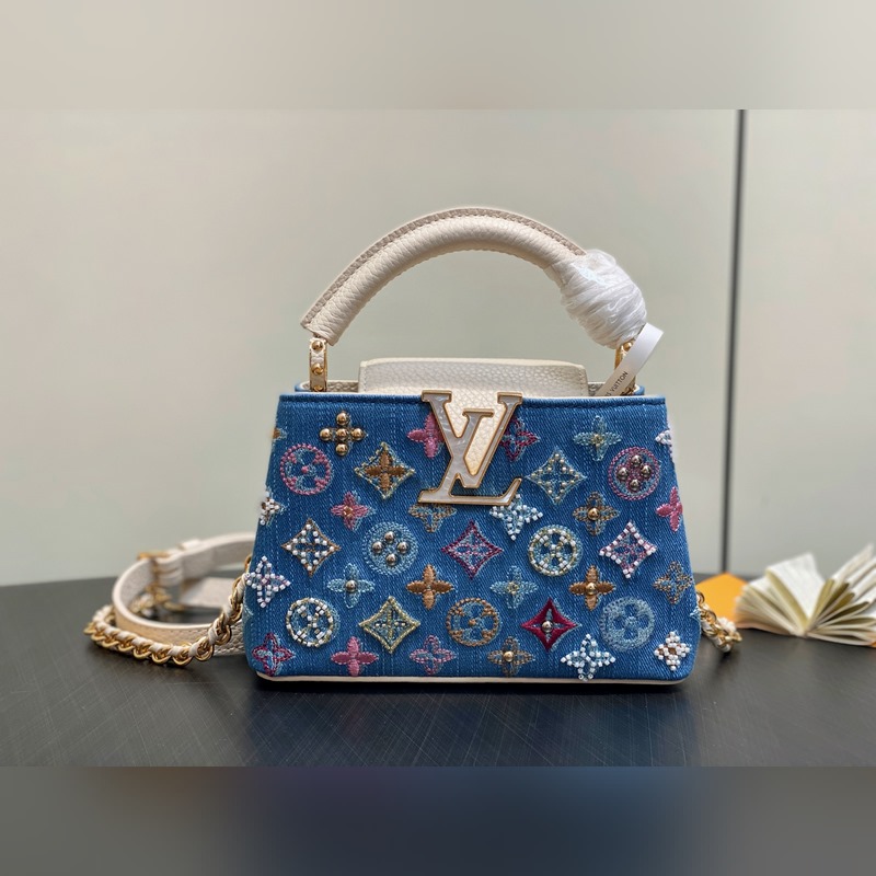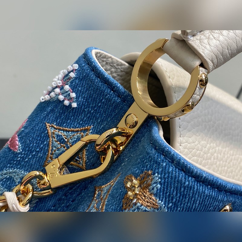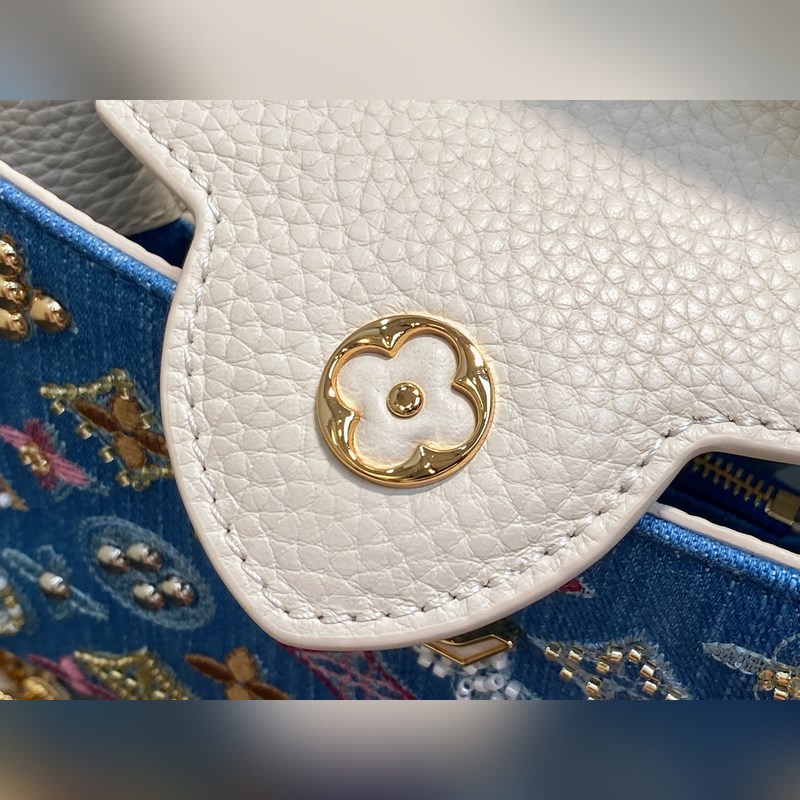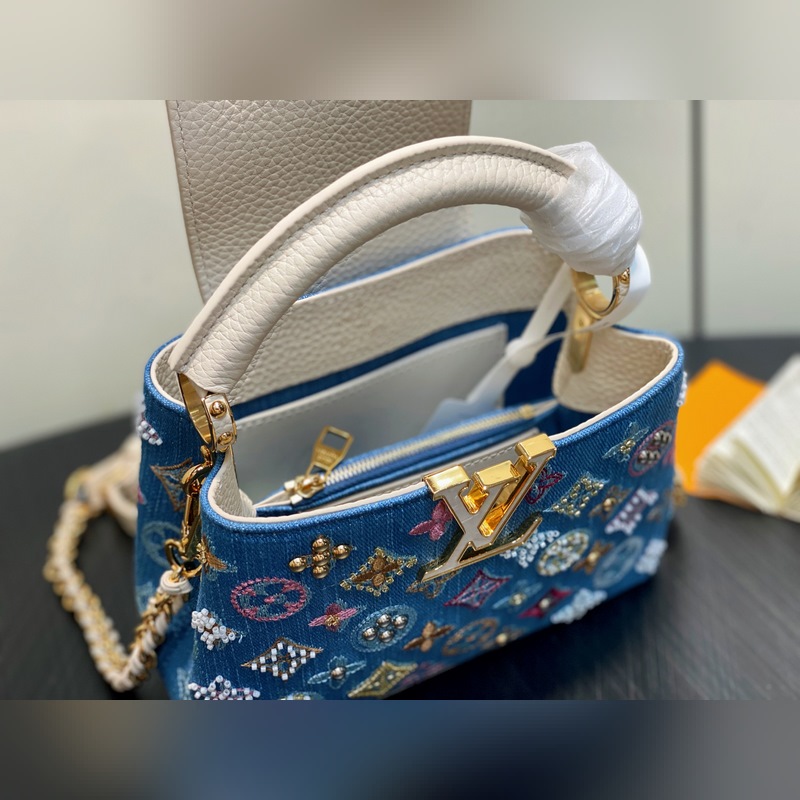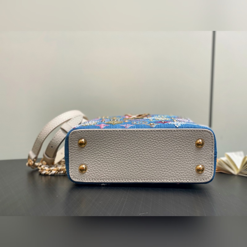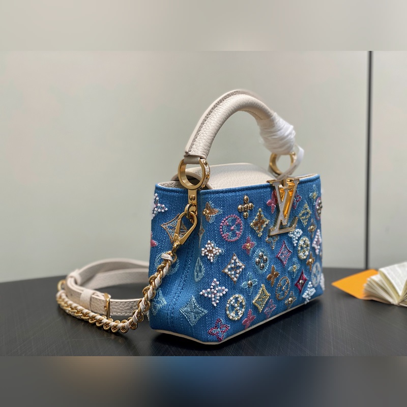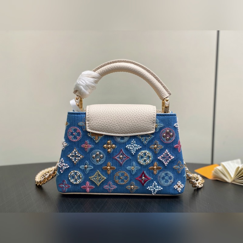 M12947 블루 데님 풀 가죽 캡 나잉 스타일 Capucines 미니 핸드백 본 Capucines 미니 핸드백은 모노그램 덴닝 천 자수와 비즈 장식용 실로 제작되었으며 LV 로고와 엮인 체인에 금속적인 날카로움을 더하고 대비되는 가죽 트림을 더했습니다. 플랩은 외부로 펼쳐지거나 안으로 접을 수 있으며 정돈된 내부 공간과 다양한 휴대 방식이 기능적 디테일을 완성합니다. 21x 13.6 x 8.0 cm (길이 x 높이 x 너비)