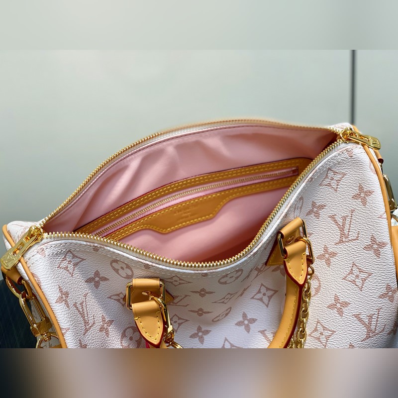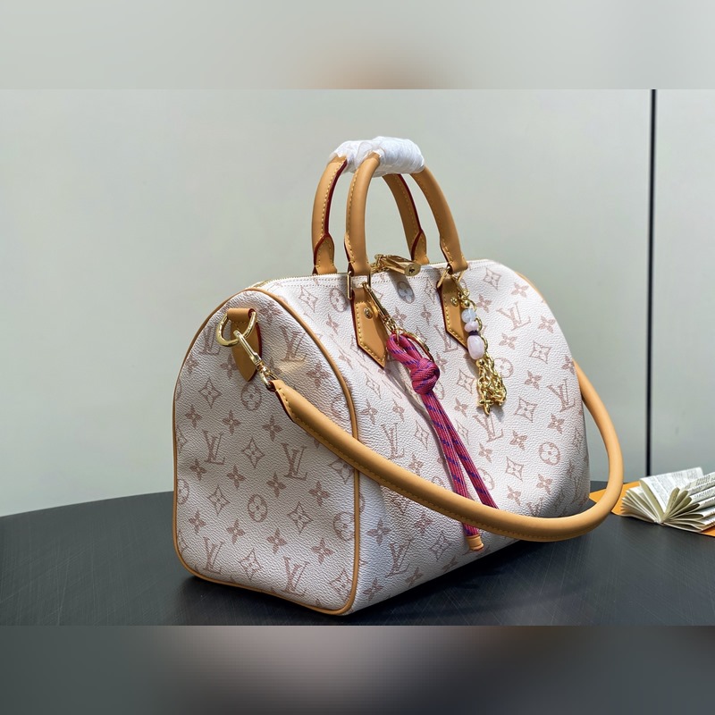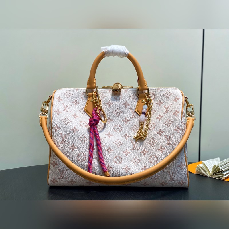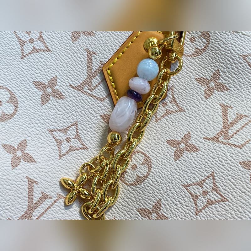 M15108 화이트 플라워 스피디 베개백 시즌 신상 스피디 소프트 30 럭키 핸드백 본 스피디 소프트 30 럭키 핸드백은 모노그램 듄 캔버스에 VVN 가죽 트림을 더하고 보석 같은 장식 대비되는 컬러의 안감 매듭과 눈부신 금속 디테일로 세련된 디테일을 더했습니다. 넉넉한 실루엣으로 태블릿과 일상 소지품을 여유롭게 수납할 수 있습니다. 21 x 17 x 30 cm