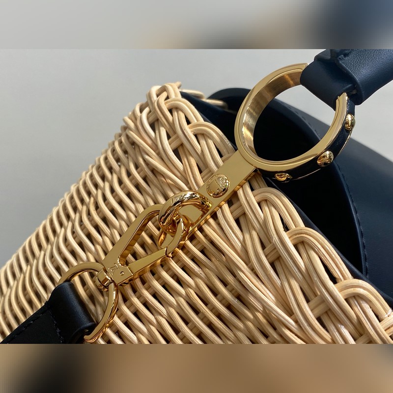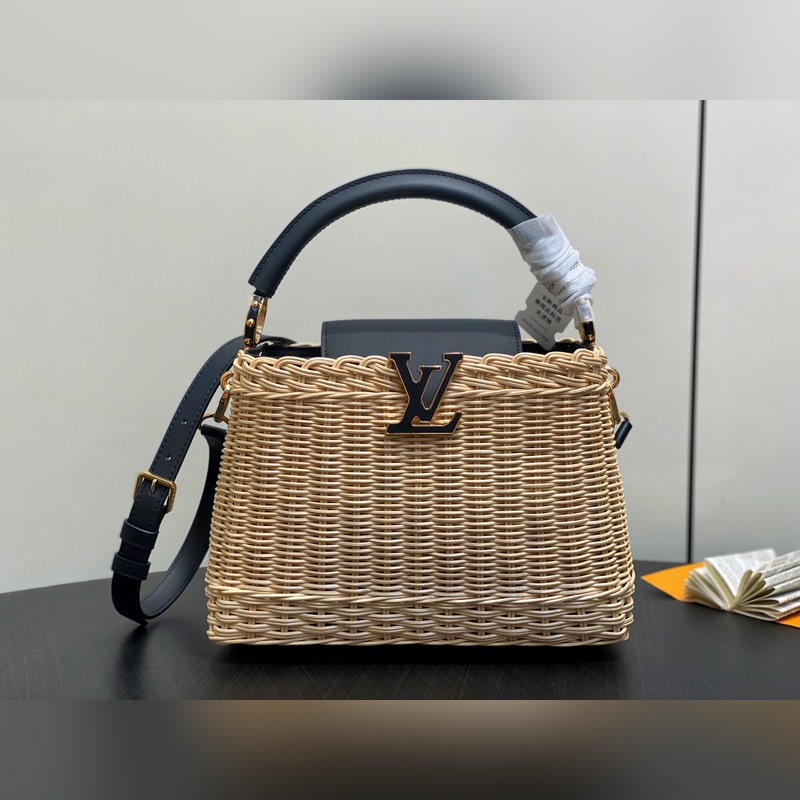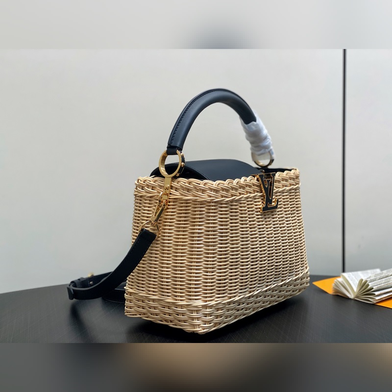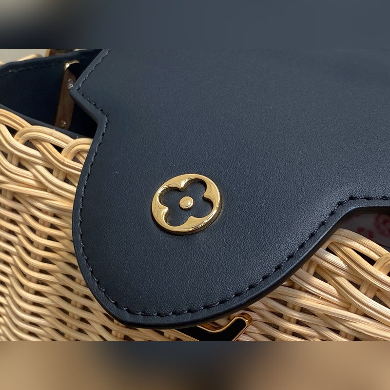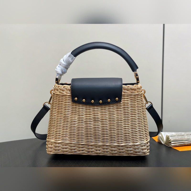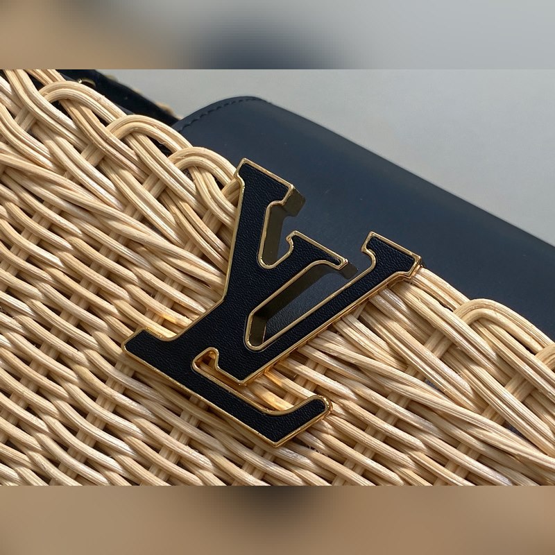 M26005 블랙 위빙 풀 가죽 캡 나잉 스타일 CAPUCINES BB 핸드백 m11617 브라운 m24976 옐로우(위빙) 본 제품 Capucines BB Hl 핸드백은 라탄 위빙으로 독특한 실루엣을 연출하며 1892년 출시된 루이 비통 피크닉 박스 디자인에서 영감을 받았습니다. 소가죽으로 제작된 상단 핸들과 플랩 금속 느낌의 LV 로고가 특징이며 탈부착 및 길이 조절이 가능한 가죽 숄더 스트랩으로 편리한 착용이 가능합니다. 크기: 27 x 17.3 x 9 cm