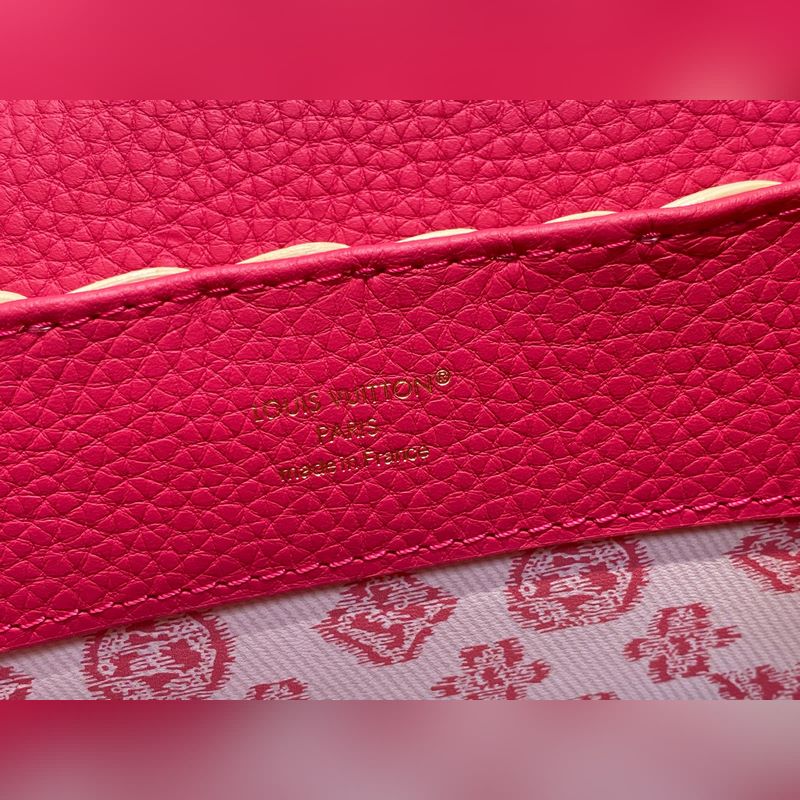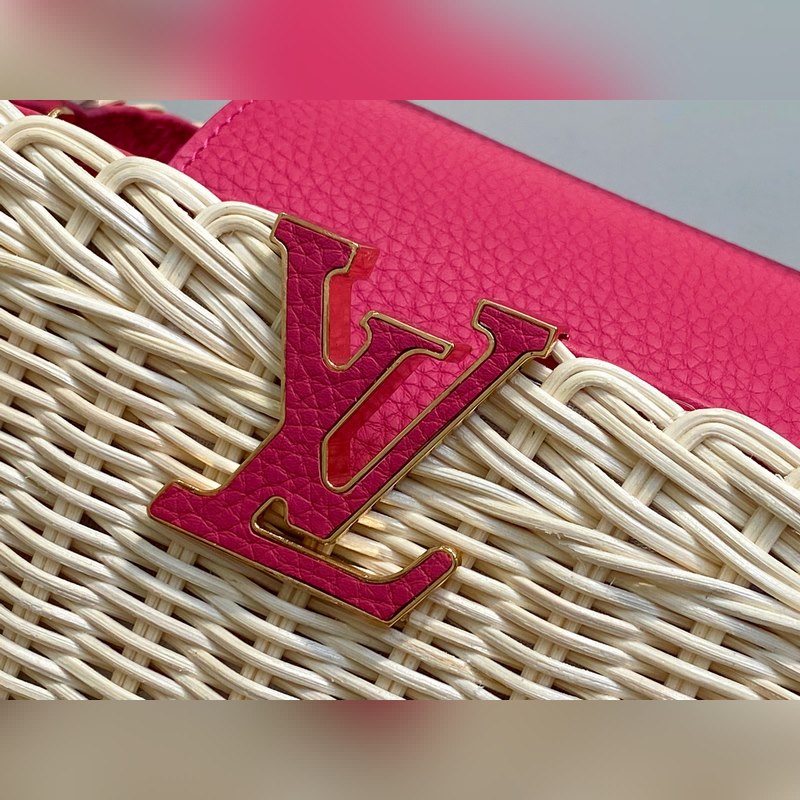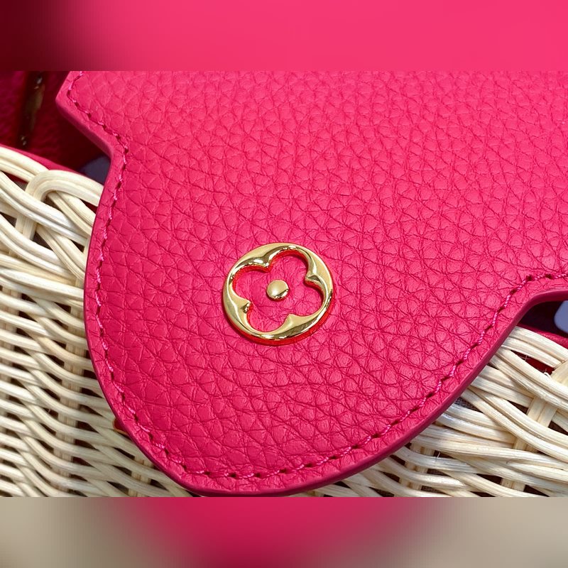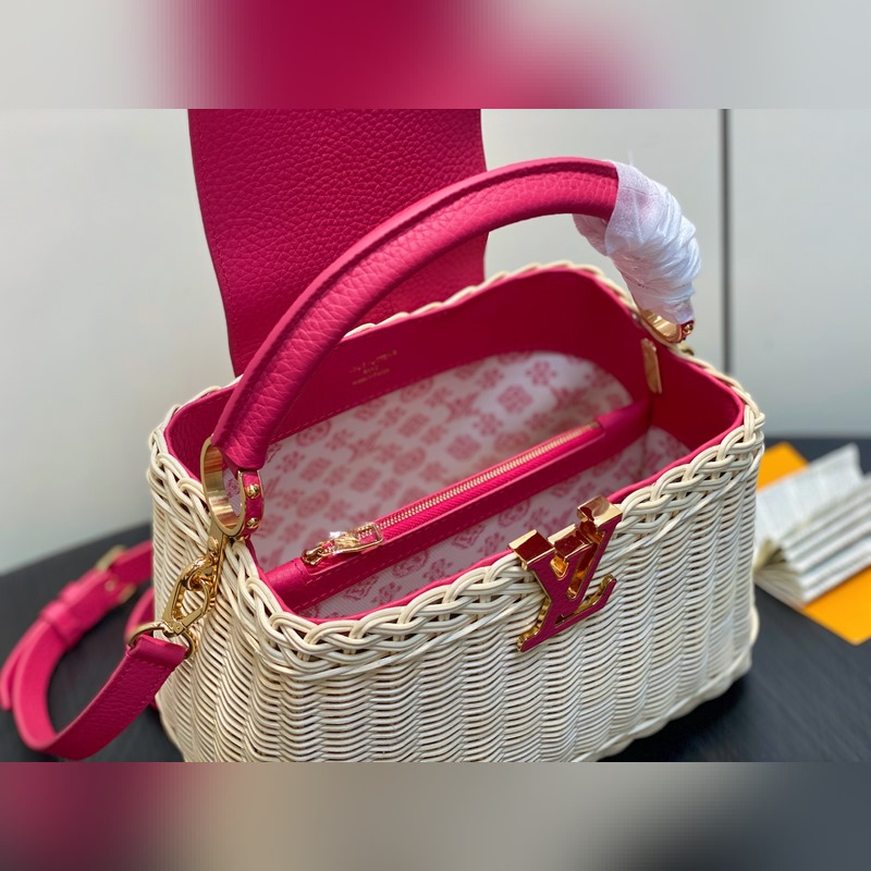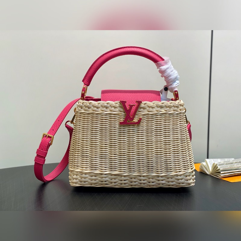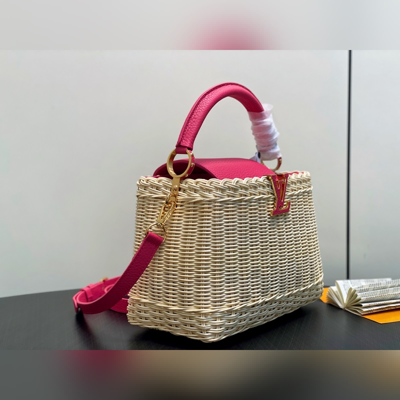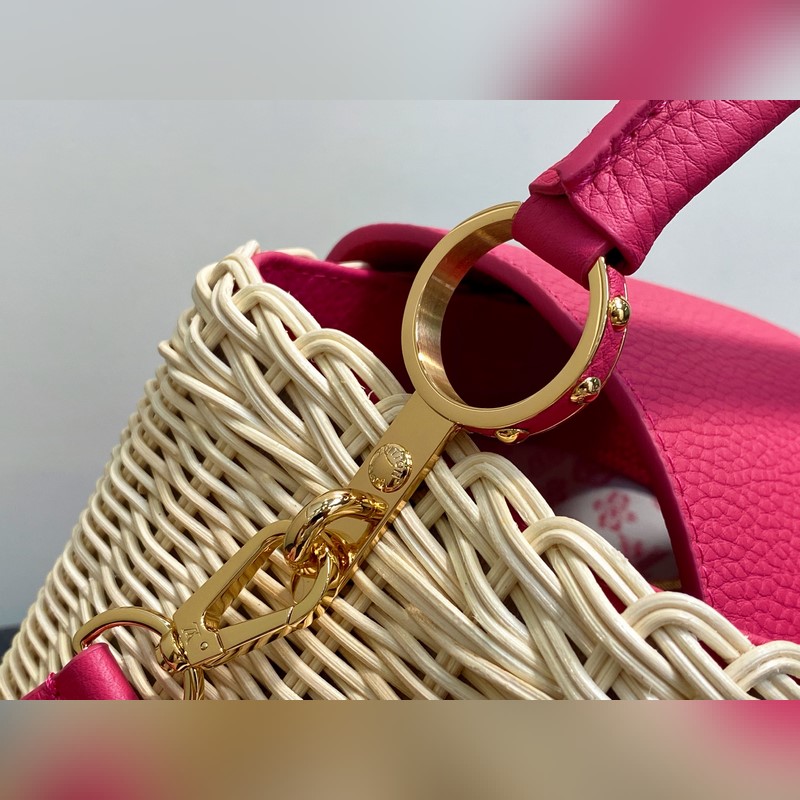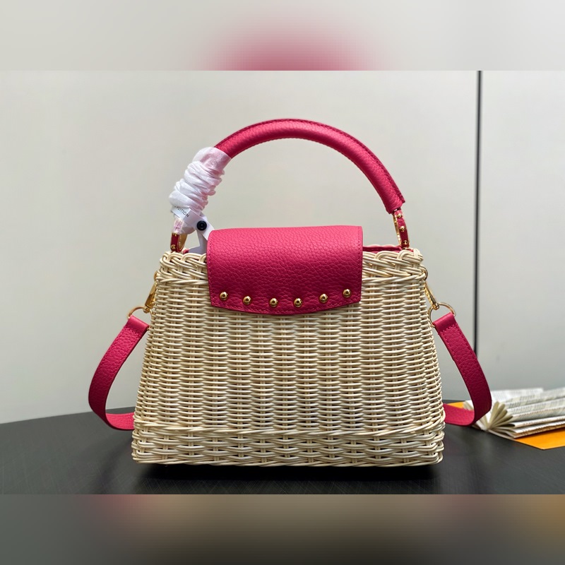 M26005 장미빛 레드 브레이드 풀 가죽 캡 나잉 스타일 CAPUCINES BB 핸드백 m11617 브라운 m24976 옐로우(브레이드) 본 제품 Capucines BB Hl 핸드백은 라탄 브레이드로 독특한 실루엣을 연출하며 1892년 출시된 루이 비통 피크닉 박스 디자인에서 영감을 받았습니다. 소가죽으로 제작된 상단 핸들과 플랩 금속 느낌의 LV 로고가 특징이며 탈부착 및 길이 조절이 가능한 가죽 숄더 스트랩으로 편리한 착용이 가능합니다. 크기: 27 x 17.3 x 9 cm
