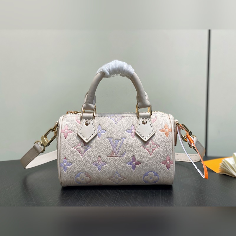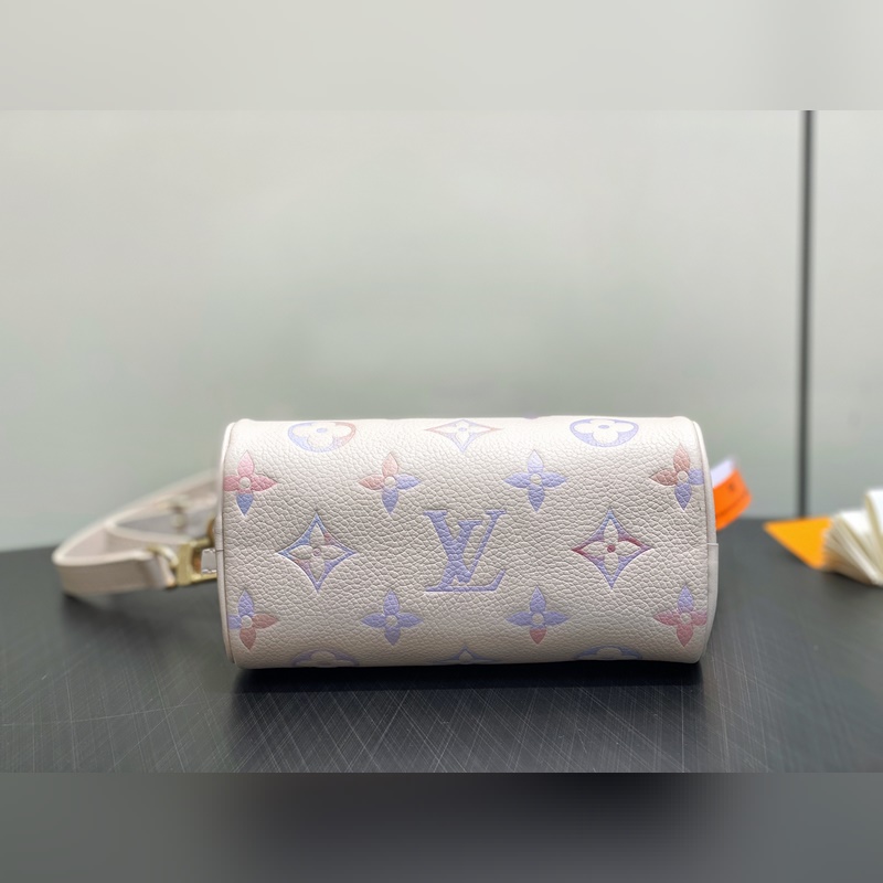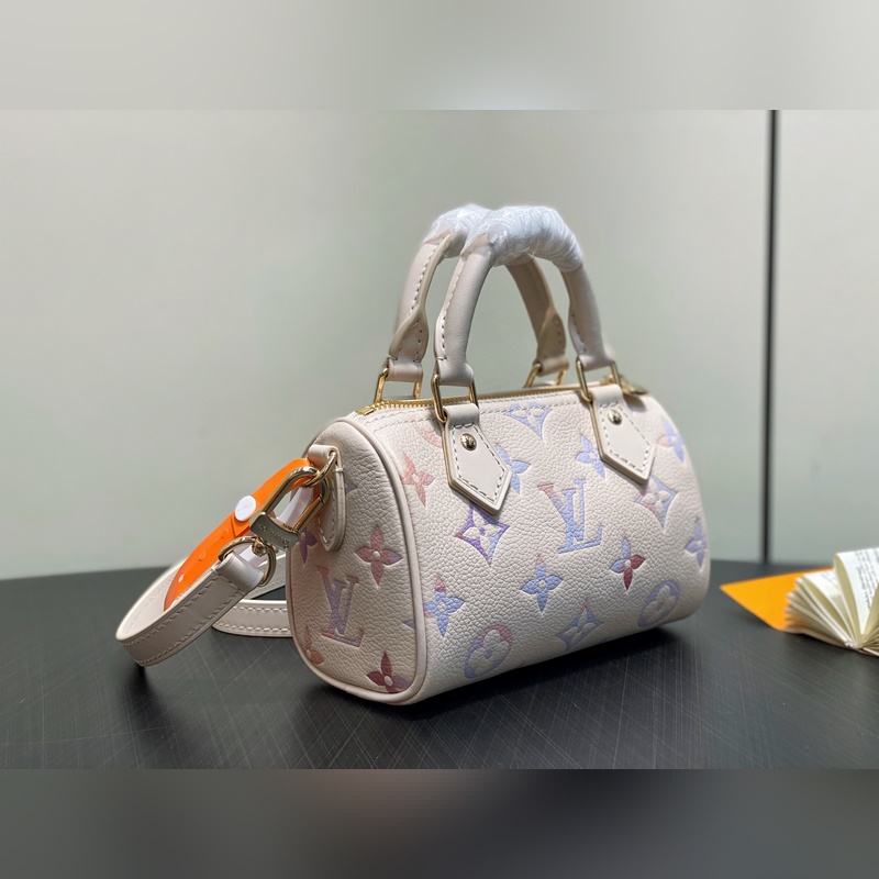 M25591 미백 그라데이션 풀 가죽 스피디 베개백 이번 시즌 나노 스피디 핸드백은 은은한 환상적인 색상으로 물들어 다양한 스타일을 손쉽게 완성해 줍니다. 클래식한 모노그램 엠프린트 가죽 바디에 메탈 디테일이 조화를 이루며 넉넉한 내부 공간으로 소형 지갑 등 일상 소지품을 수납할 수 있습니다. 탈부착 가능한 숄더 스트랩으로 다양한 스타일링이 가능합니다. 10 x 7.5 x 16 cm(높이 x 너비 x 길이)
