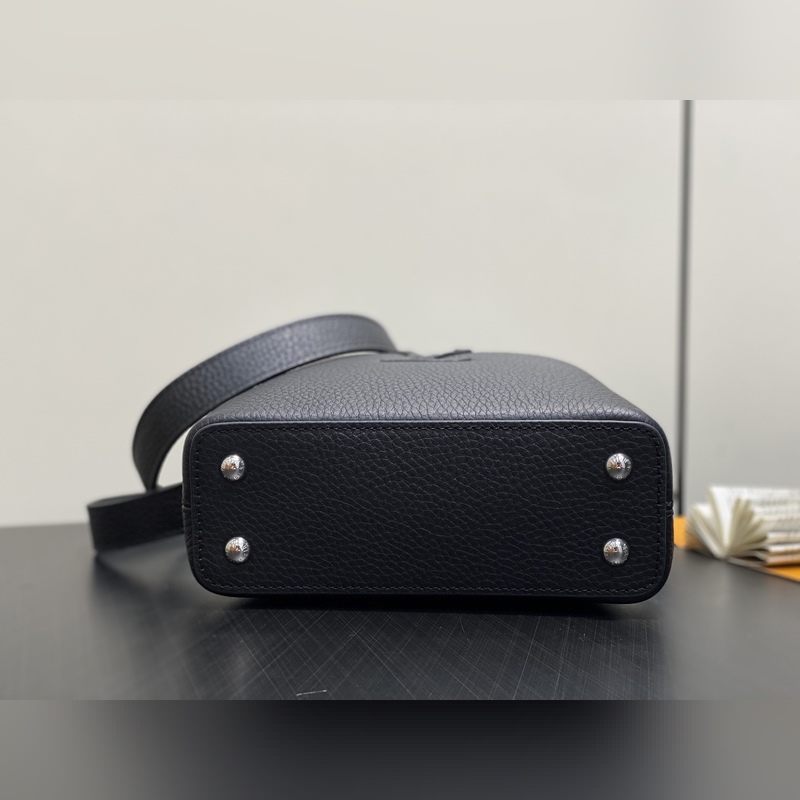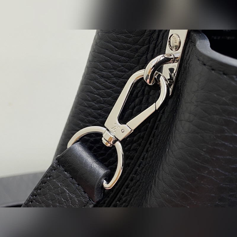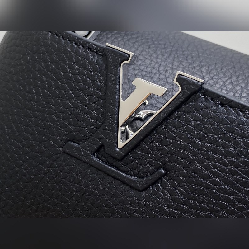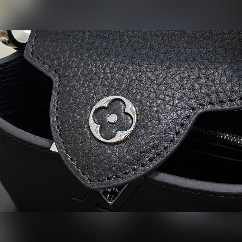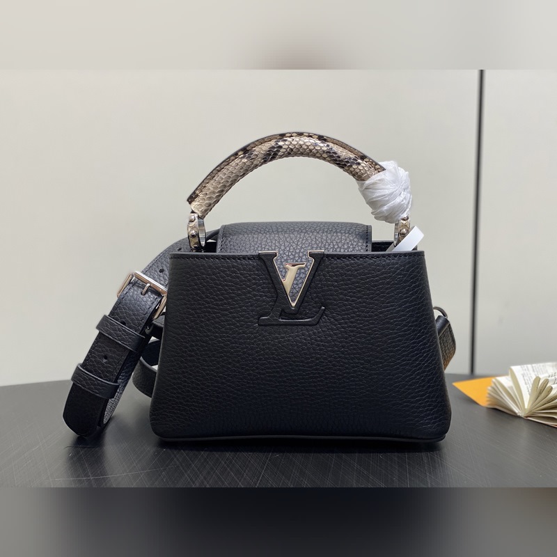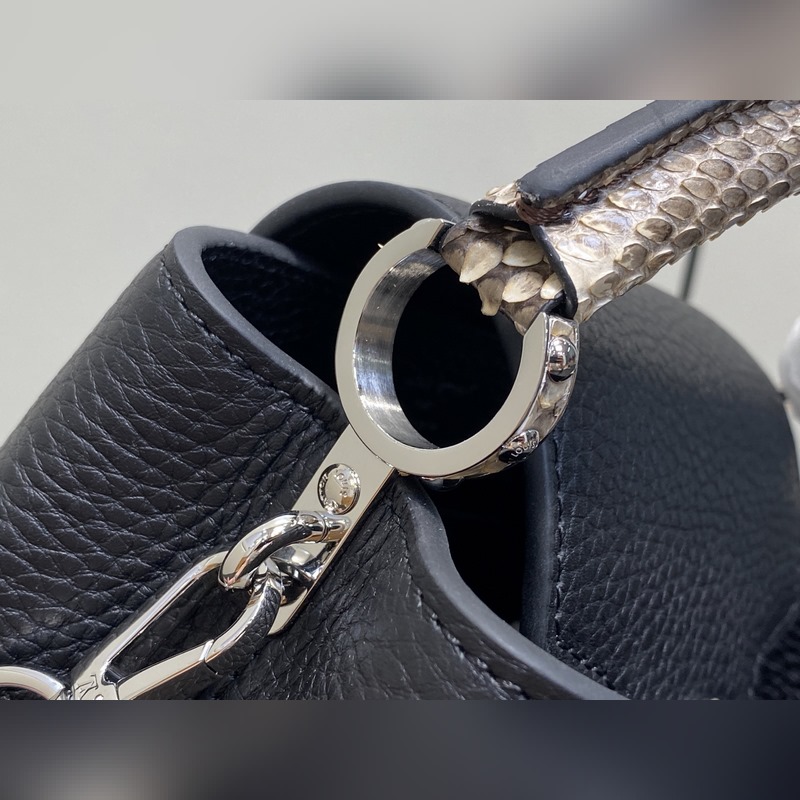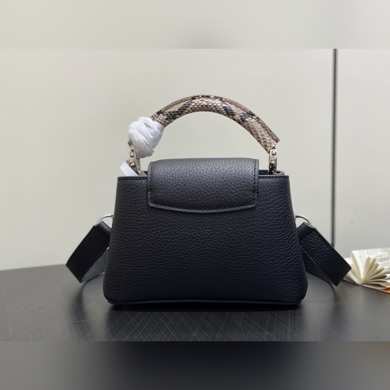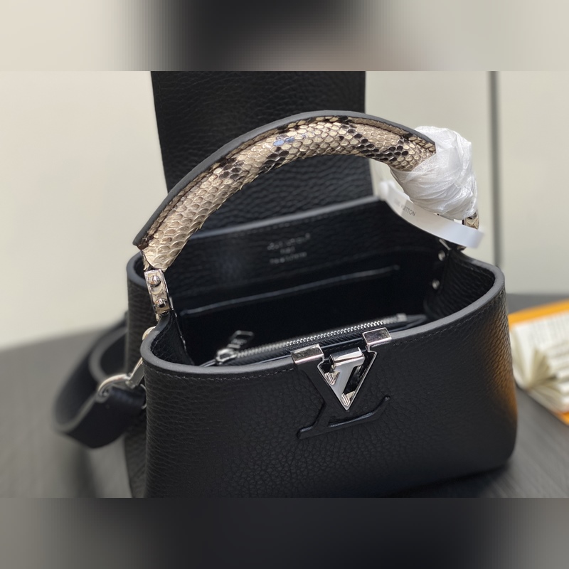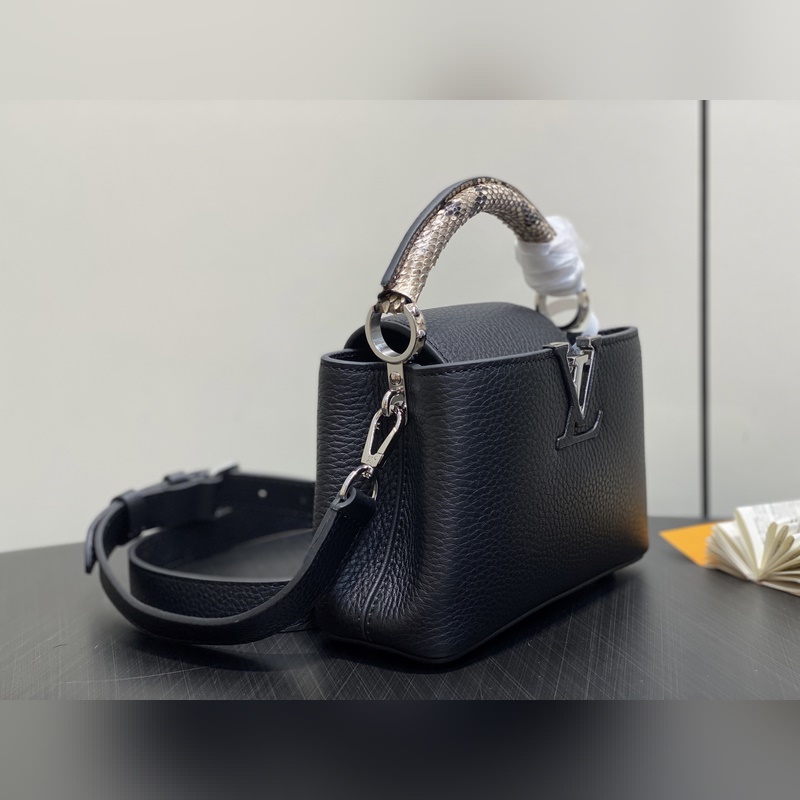 N85513 블랙 뱀가죽 풀 가죽 캡 나잉 스타일 캡시네스 미니 핸드백 캡시네스 핸드백 시리즈는 2013년 출시되었으며 1854년 루이 비통이 파리에서 첫 매장을 열었던 거리에서 이름을 따왔습니다. 이 캡시네스 BB 핸드백은 풀 그레인 타우리용 소가죽을 사용해 다양한 브랜드 요소를 담아냈습니다. 가죽으로 감싼 LV 이니셜 보석 같은 핸들 링은 클래식한 하드 케이스 디자인을 계승했으며 독특한 플랩에는 모노그램 플라워가 피어오르고 화려한 뱀가죽 핸들은 세심한 디테일을 더합니다. 14 x 8 x 21 cm.