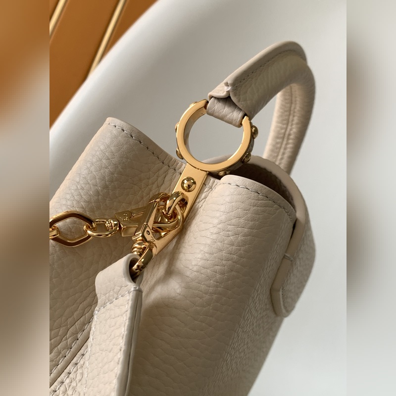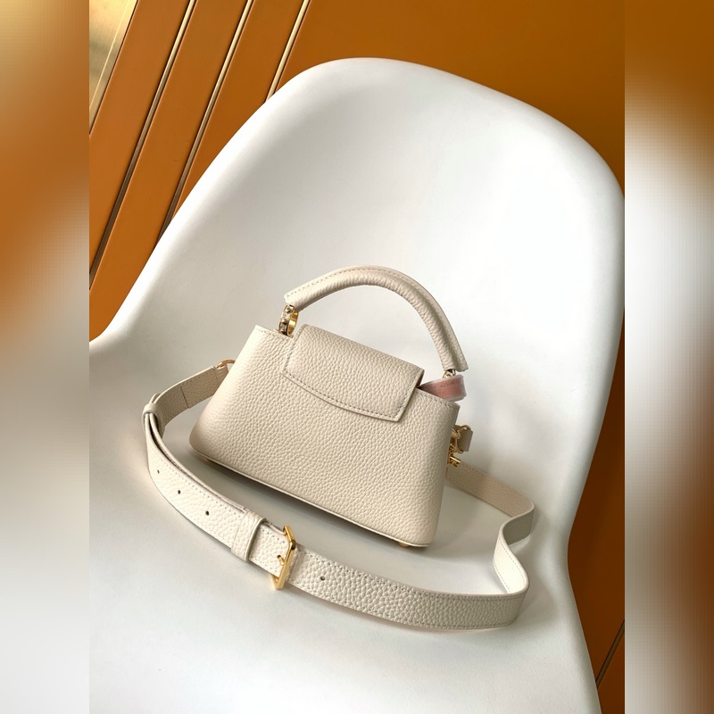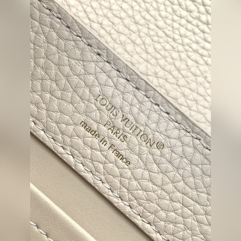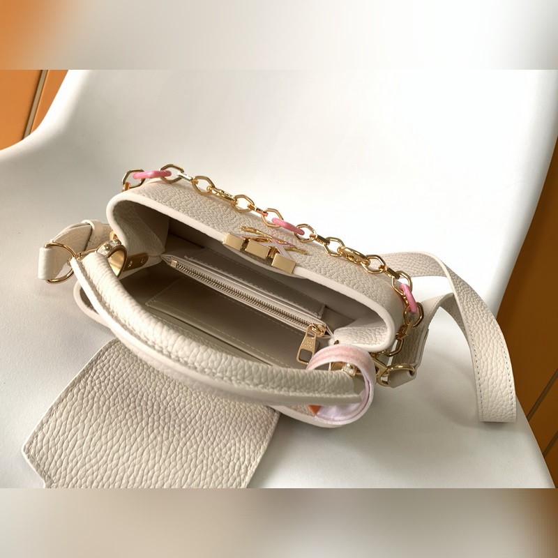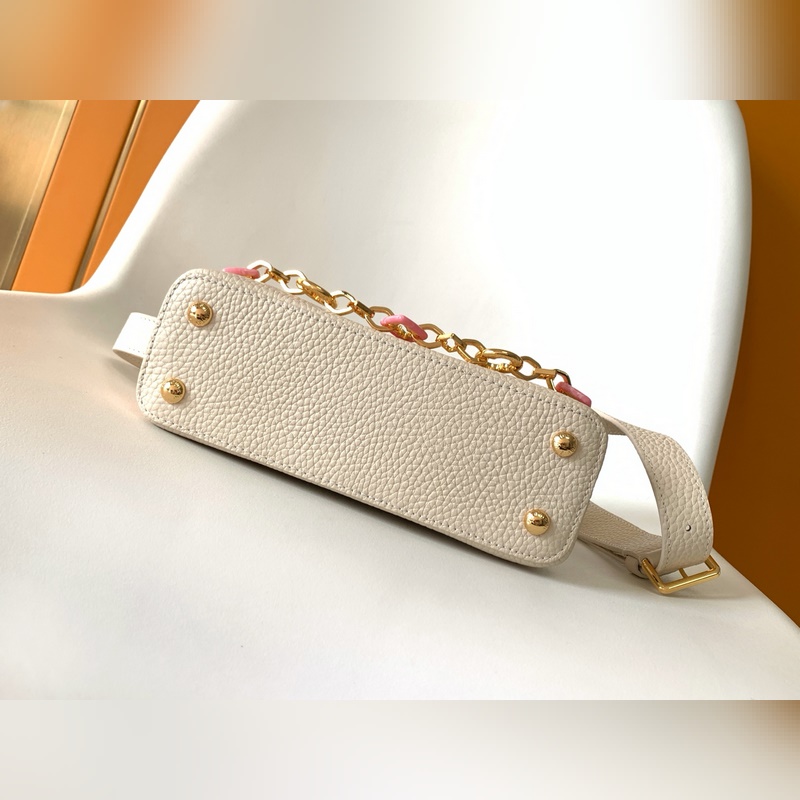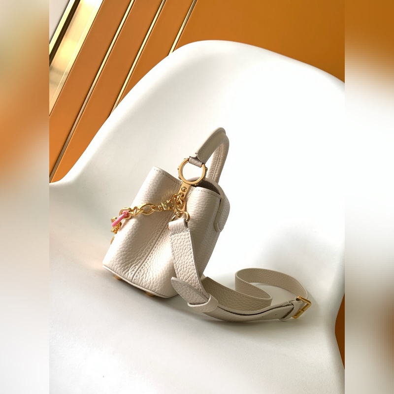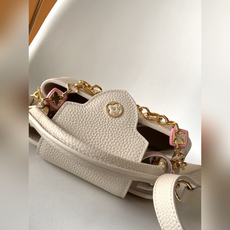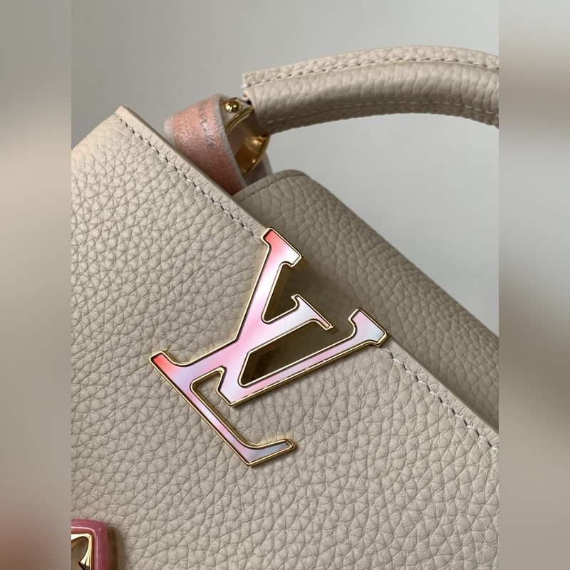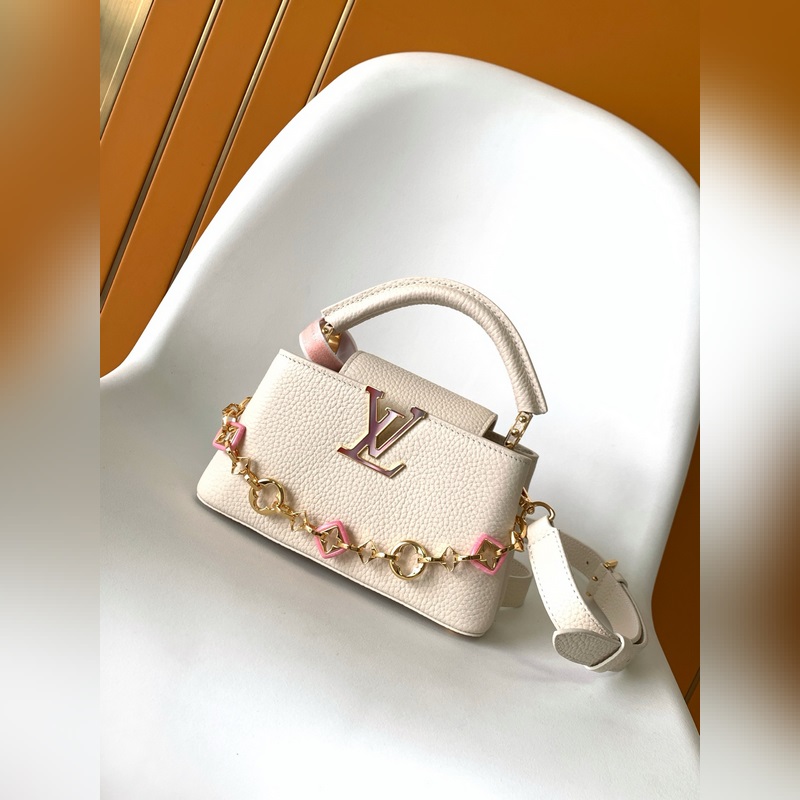 M14381 브라운 M14970 블랙 M14971 네온 블루 M14972 핑크 퍼플 M14393 가로형 베이지 정품 오리지널 다이내믹 163 본 Capucines BB 핸드백은 Harmony 시리즈의 디자인 요소를 차용하여 화려한 체인으로 Monogram 플로럴의 영감을 표현합니다. 타우리용 소가죽 바디에 레진 코팅 LV 로고가 장식되어 있으며 외부 또는 내부로 접을 수 있는 플랩을 열면 다중 포켓이 정돈된 내부 레이어가 드러납니다. 가로형 미백 22.0 x 12.0 x 8.0 cm (길이 x 높이 x 너비) --------- 브라운 블랙 네이비 퍼플 21.0 x 14.0 x 8.0 cm (길이 x 높이 x 너비) 27.0 x 17.3 x 9.0 cm (길이 x 높이 x 너비) Taurillon 소가죽 소가죽 트림 소가죽 안감 수지 및 금속 부품 플랩은 안쪽 또는 바깥쪽에 위치 가능 분할 공간 내부에 포켓 부착 금속 바닥 못 6.1인치 스마트폰 Capucines 소형 지갑 열쇠 립스틱 수납 가능