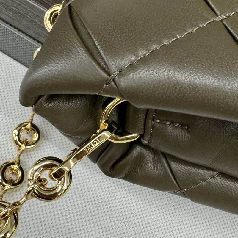 LOEWE 주름 장식 반짝이는 나파 양가죽 퍼퍼 고야 핸드백은 고야의 미학에서 영감을 받아 거위털 패딩이 적용된 반짝이는 나파 양가죽으로 새로운 감각과 촉각적 차원을 선사합니다. 탈부착 및 길이 조절이 가능한 메탈 도넛 체인과 탈부착 가능한 가죽 스트랩이 함께 제공됩니다. 이 버전은 주름 잡힌 양가죽을 사용하여 재단 봉제 및 수작업으로 엮어 제작되었습니다. 어깨에 메거나 손에 들 수 있습니다. *자석 버튼* 이 핸드백에는 탈부착 가능한 체인과 가죽 스트랩이 포함되어 있습니다. 하나의 메인 수납공간 지퍼 포켓 하나 슬롯 포켓 하나 *나파 양가죽 안감 모델: 062466 사이즈: 23*9*17cm