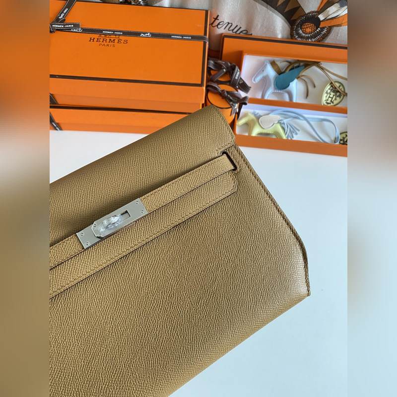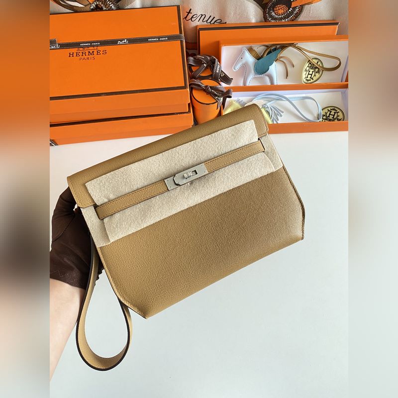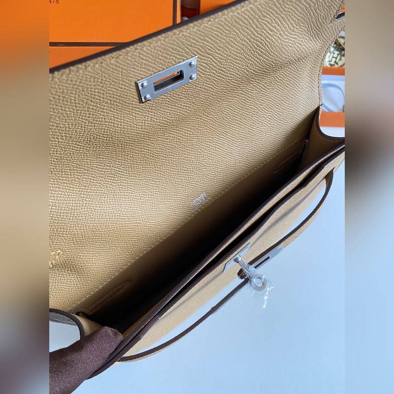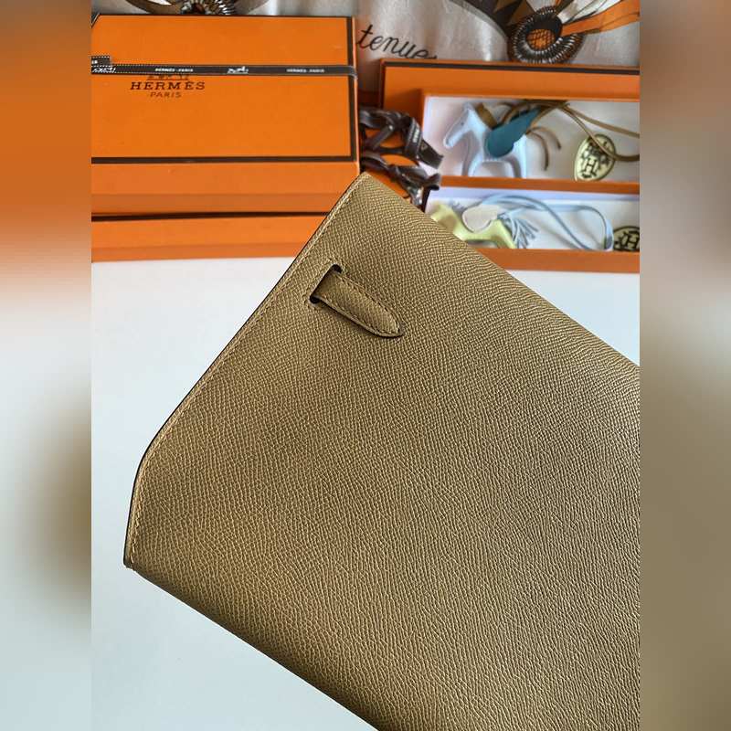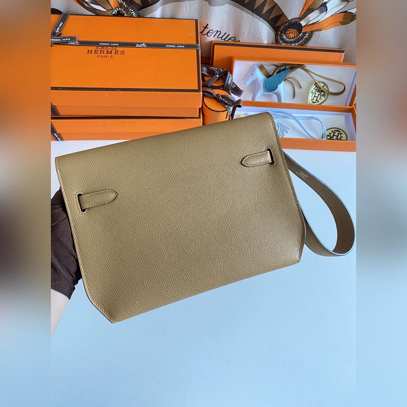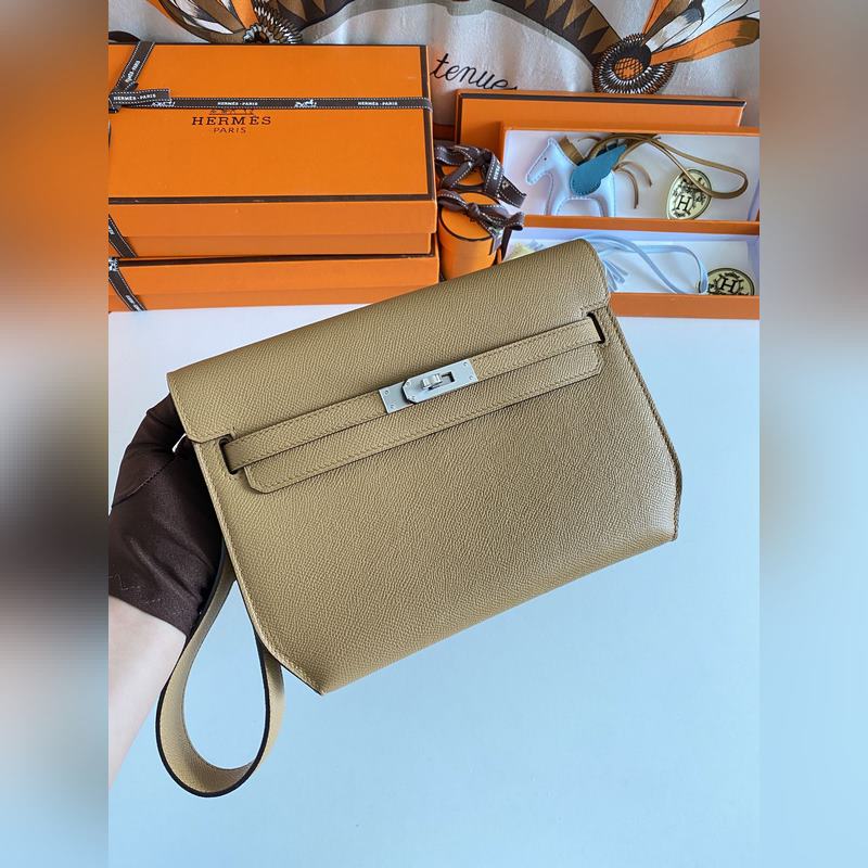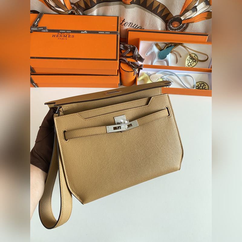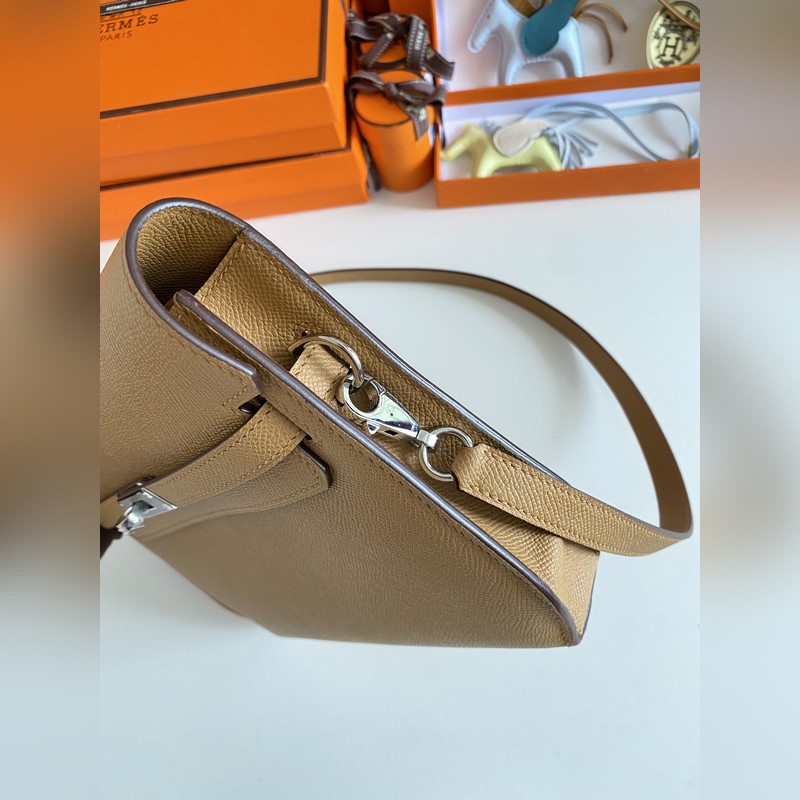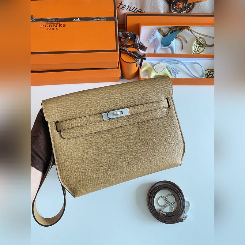 켈리 데페쉬 25cm 핸드백/숄더백 에프솜 가죽 참깨색 실버 버클 수제 봉제 남녀 공용. (별도 어깨끈 포함) 핸드백으로도 숄더백으로도 사용 가능. 핸드 스트랩과 어깨끈 모두 탈부착 가능.