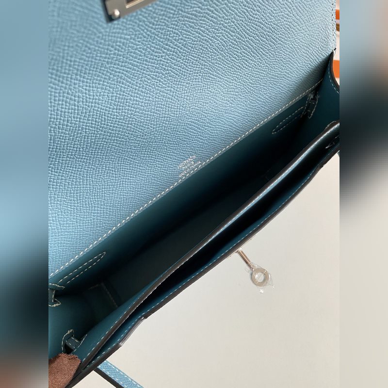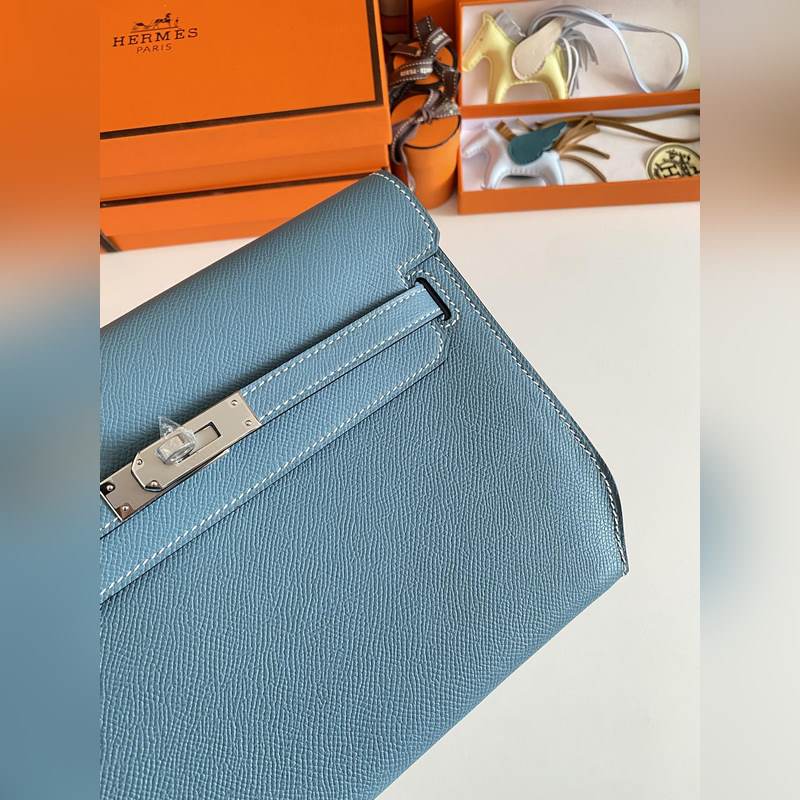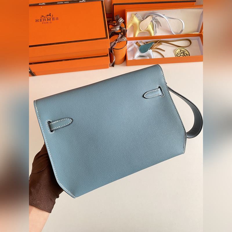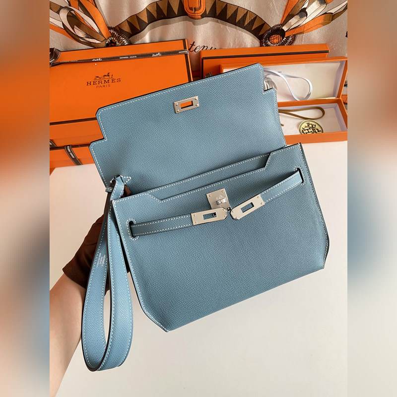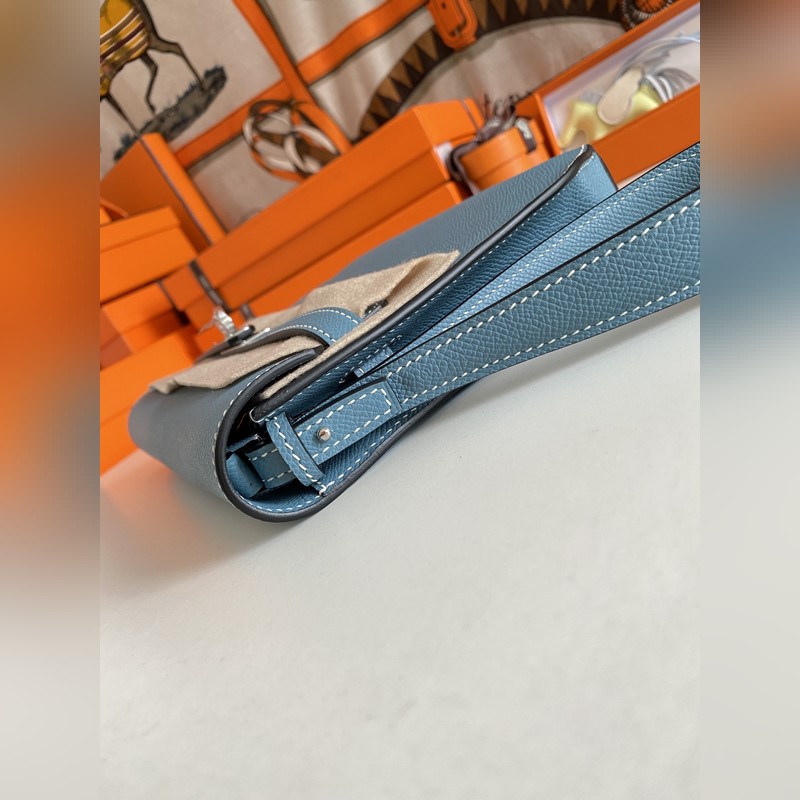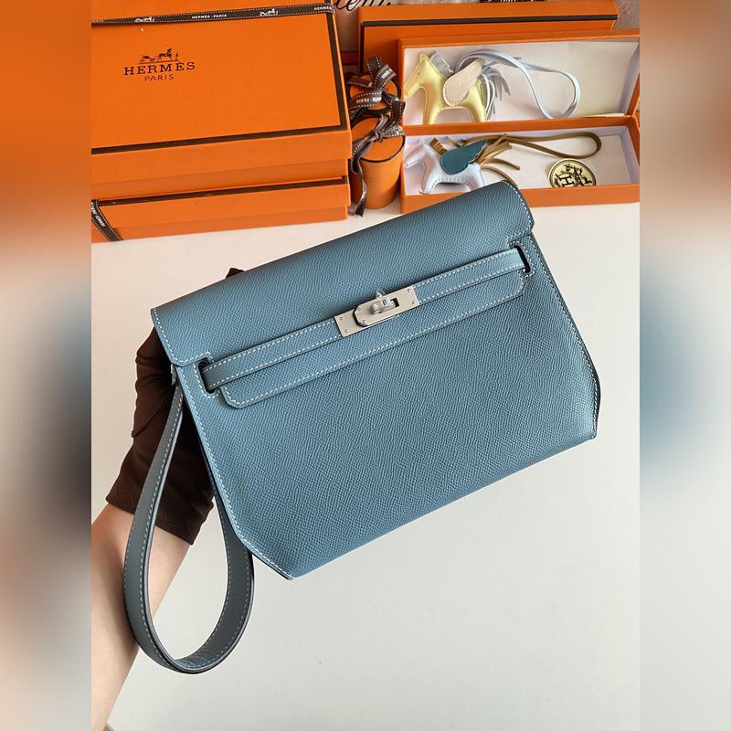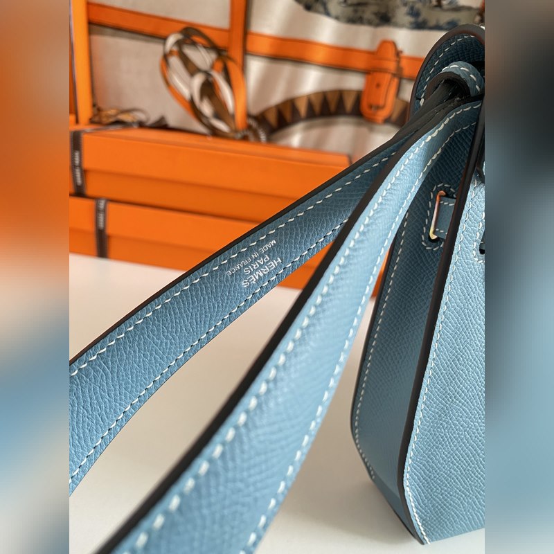 켈리 데페쉬 25cm 핸드백/숄더백 에프솜 가죽 데님 블루 실버 버클 수제 봉제 남녀 공용. (별도 어깨끈 포함) 핸드백으로도 숄더백으로도 사용 가능 한 가방으로 다양한 활용. 핸드 스트랩과 어깨끈 모두 탈부착 가능.