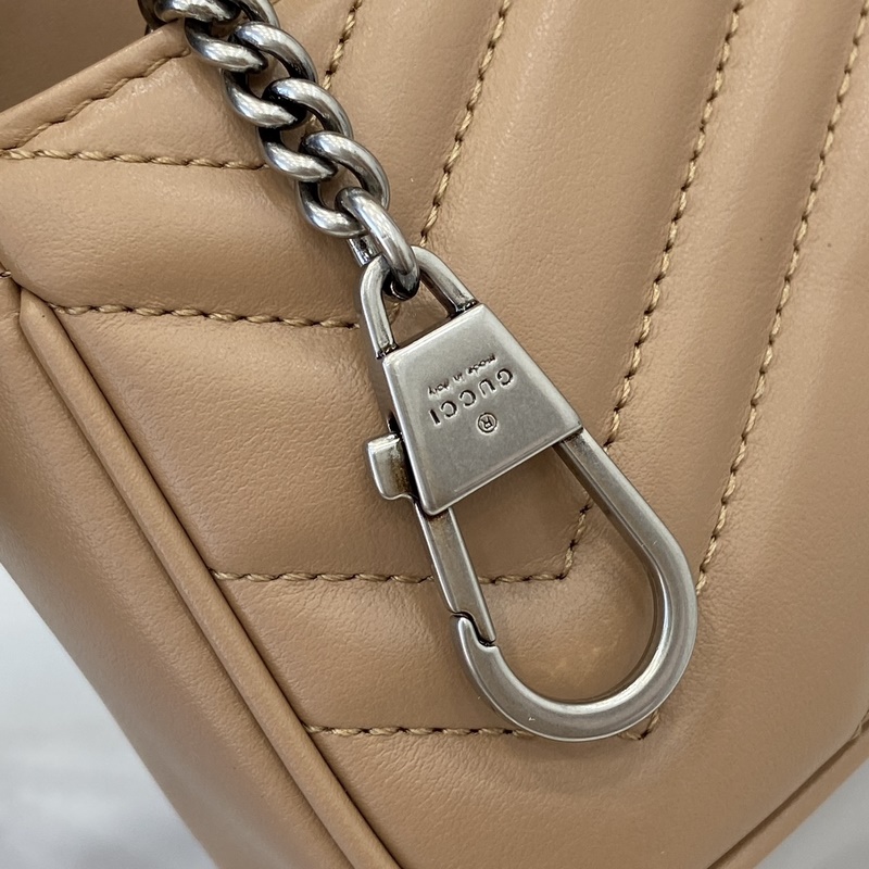 GG Marmont 시리즈 초미니 핸드백. 이 초미니 핸드백은 로즈 베이지 퀼팅 V-타입 가죽으로 제작되었으며 클래식한 더블 G 로고가 장식된 골드 톤 액세서리가 전체 디자인에 포인트를 더합니다. 키링은 본 제품을 다른 핸드백에 고정하는 데 사용할 수 있어 디자인의 매력을 한층 높여줍니다. 로즈 베이지 퀼팅 V-가죽 골드 톤 액세서리 벨벳 느낌의 초극세사 안감 별도 제공되는 키링(가방에 연결 가능) 더블 G 체인 숄더 스트랩(60cm 높이) 무게: 약 0.35kg. 모델 번호: 476433. 사이즈: 16.5(길이) x 10(너비) x 4.5cm(두께) 색상: 로즈 베이지 G/오리지널 가죽. 모델 키 176cm iPhone Pro 카드지갑 립스틱 수납 가능