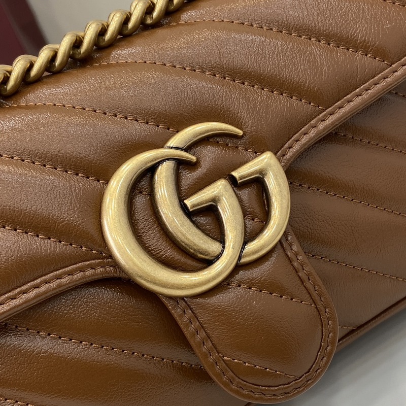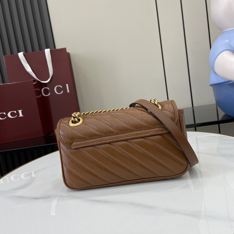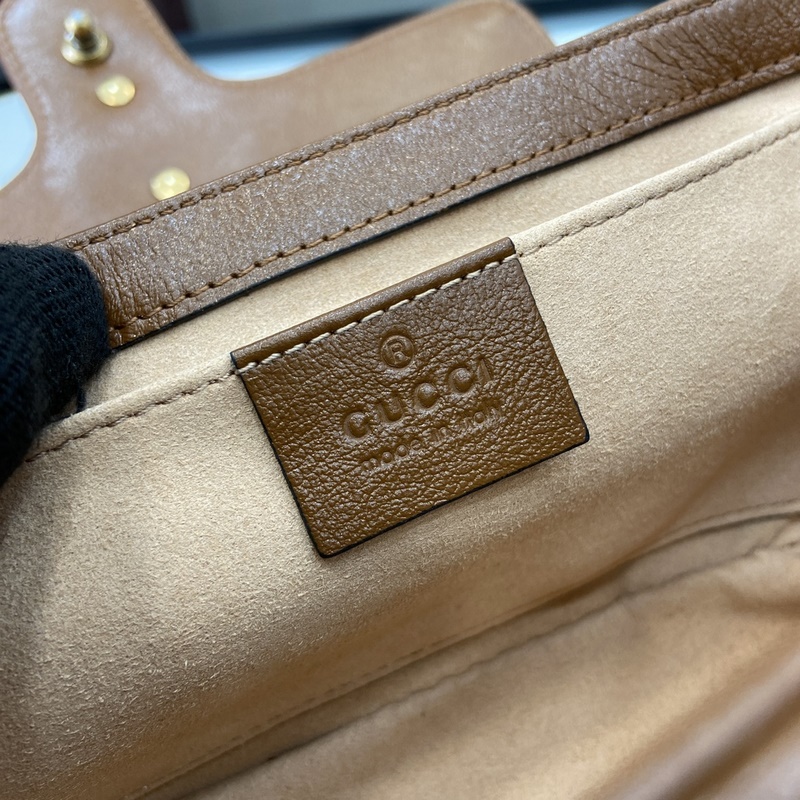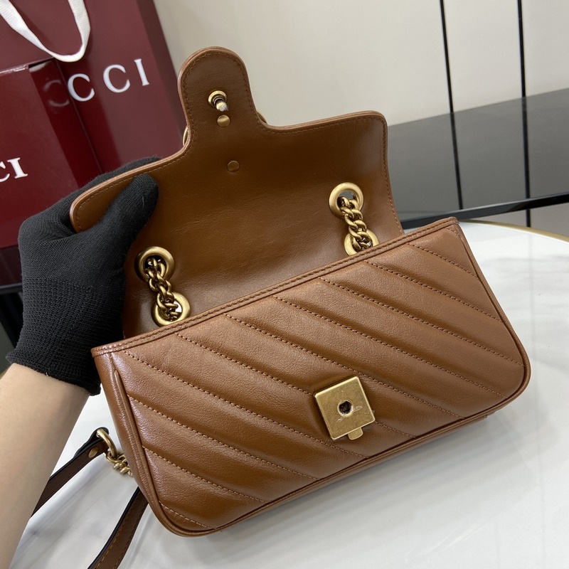 원본 가죽 GG Marmont 시리즈 퀼팅 미니 핸드백. 이 GG Marmont 시리즈 미니 핸드백은 높은 인지도의 디자인 중성적인 갈색 퀼팅 V자 가죽 소재로 제작되었으며 가방 본체가 약간 뻣뻣한 느낌을 줍니다. 플랩 오픈 디자인에 더블 G 액세서리가 장착되어 있습니다. 다양한 착용 방식이 가능한 이 핸드백은 금속 체인을 쉽게 슬라이드시켜 숄더백과 핸드백 사이를 자유롭게 전환할 수 있습니다. 갈색 퀼팅 V자 가죽 골드 톤 액세서리 벨벳 소재의 초극세사 안감 더블 G 로고가 특징입니다. 슬라이딩 체인 스트랩은 숄더 스트랩(높이 55cm) 또는 탑 핸들(높이 30cm)로 사용 가능합니다. 크로스백으로도 활용 가능합니다. 스프링 버튼 플랩 무게: 약 0.6kg. 모델: 446744. 사이즈: 22(너비) x 13(높이) x 6cm(깊이) 색상: 브라운 풀 가죽/오리지널 가죽. 모델 키 177cm 최대 수납 가능 품목: iPhone Pro Max/Plus Airpods 이어폰 소형 지갑 립스틱