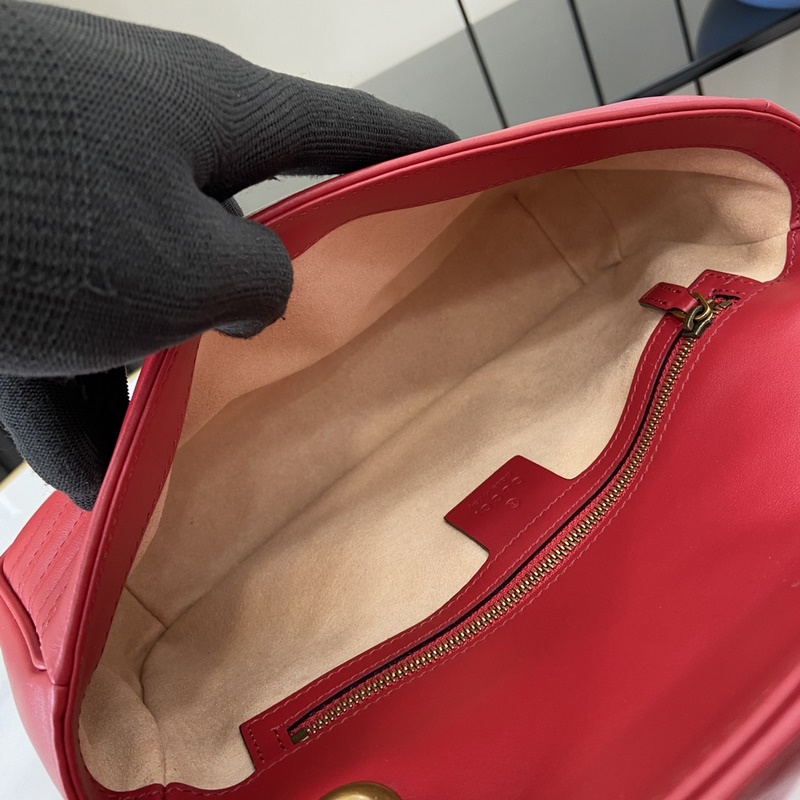 수입 정품 가죽 GG Marmont 메탈 체인 숄더백 부드러운 구조 초대형 플랩 디자인 더블 G 디테일 장식. 슬라이딩 체인 스트랩이 정교하게 설계되어 다양한 착용법으로 어깨에 메거나 손에 들 수 있습니다. 퀼팅 V자형 소가죽 소재 뒷면에 하트 모양 패턴 장식. 하트 모양 패턴이 장식된 진홍색 퀼팅 V자형 소가죽 구리빛 톤 액세서리 더블 G 지퍼 내부 포켓 슬라이딩 체인 스트랩은 숄더 스트랩(55cm 높이) 또는 탑 핸들(30cm 높이)로 사용 가능. 스프링 걸쇠 플랩 무게: 약 0.648kg 모델: 443497. 크기: 26cm(너비) x 15cm(높이) x 7cm(깊이) 초극세사 안감 색상: 진홍색/수입 원산지 가죽.