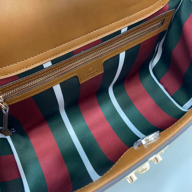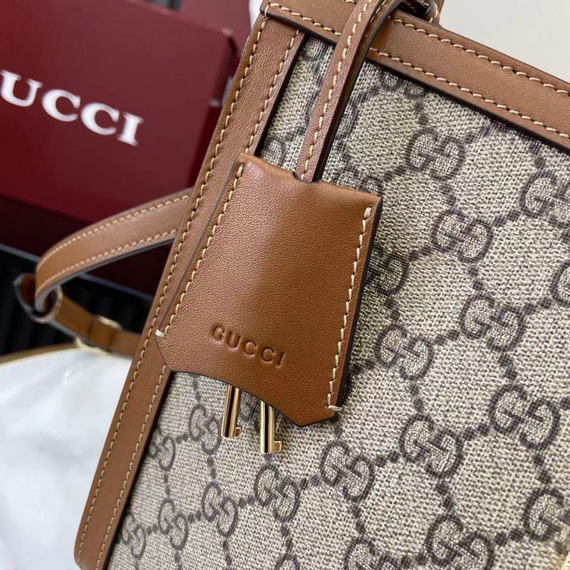 패드록 시리즈는 다양한 휴대 방식을 갖춘 세련된 가방으로 2026 프리폴 컬렉션에 화려함을 더합니다. 이 핸드백은 브랜드의 상징적인 패턴을 연상시키는 스트랩 안감을 특징으로 합니다. 베이지와 다크 브라운 GG 로고 패턴이 교차된 코팅 직물 갈색 가죽 롤링 마감 연한 골드 톤 액세서리 빨강과 초록 스트랩 면 안감 내부: 지퍼 포켓 1개 손잡이(높이 17.5cm) 분리 및 조절 가능한 가죽 숄더 스트랩(높이: 54cm - 60cm 길이: 115cm - 125cm) 자물쇠식 잠금 장치 가죽 키링 포함 모델 번호: 838991. 크기: 31cm(너비) x 21cm(높이) x 11cm(두께) 무게: 약 0.8kg. 색상: 브라운 PVC.