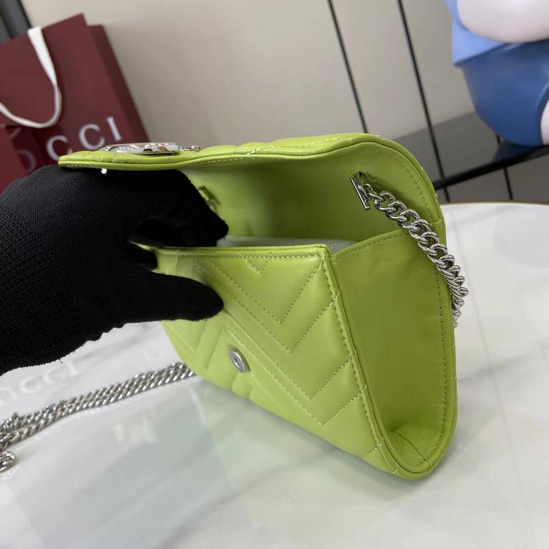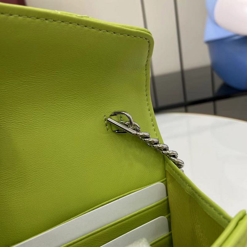 이 GG Marmont 시리즈 체인 지갑은 퀼팅 처리된 소가죽으로 정교하게 제작되었습니다. 이 시리즈의 상징적인 더블 G 디테일이 디자인에 풍성함을 더합니다. 밝은 녹색 V자 퀼팅 소가죽 실버 톤 디테일 밝은 그린색 타프타 안감 더블 G 내부: 카드 수납공간 6개 지퍼 포켓 1개 플랩 포켓 1개 체인 숄더 스트랩(60cm 높이) 스냅 버튼 여밈 모델: 837745. 사이즈: 20cm(가로) x 12cm(높이) x 4cm(깊이) 무게: 약 357g 색상: 밝은 녹색 전체 가죽.