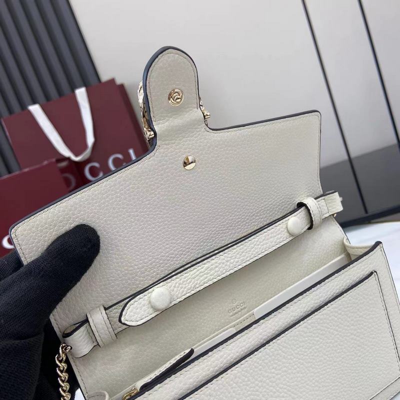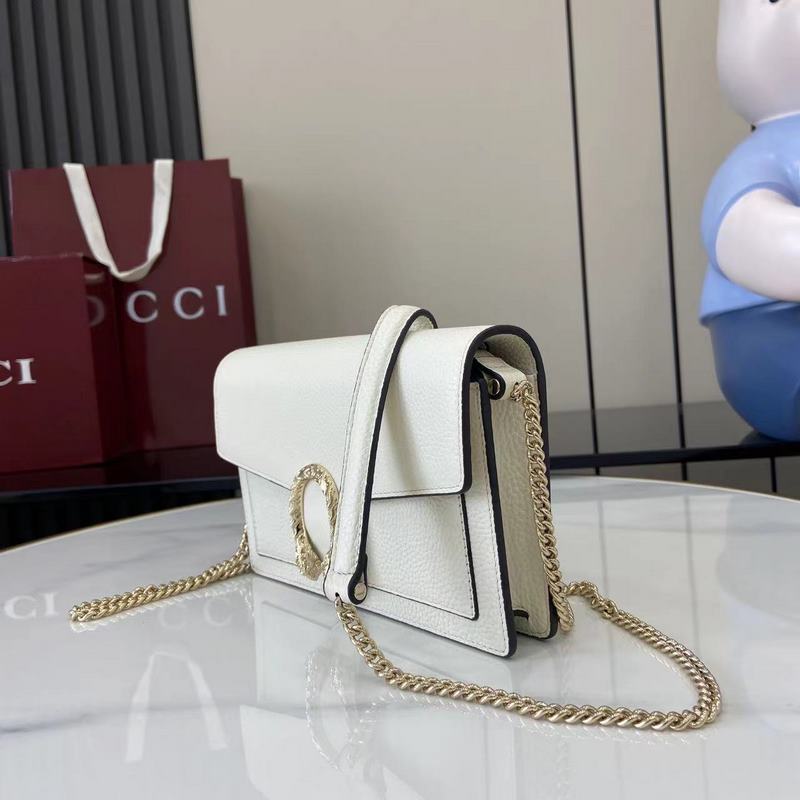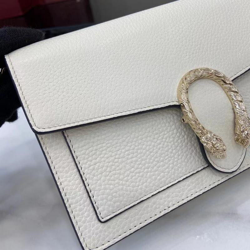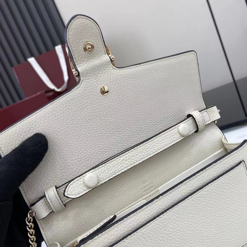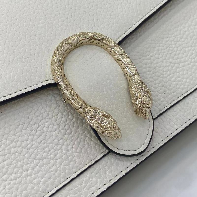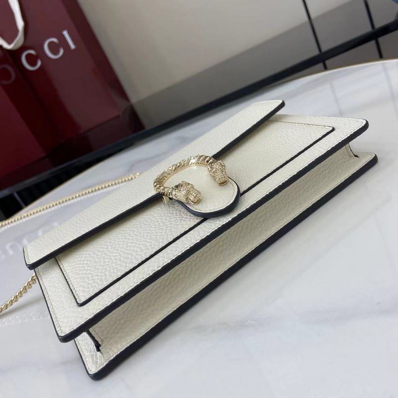 이 디오니소스 시리즈 체인 스트랩 지갑은 화이트 그레인 가죽으로 정교하게 제작되었으며 단추식 더블 타이거 헤드 잠금 장치가 세련되게 어우러집니다. 작고 우아한 디자인에 고정식 체인 숄더 스트랩이 더해져 낮과 밤을 가리지 않는 정교한 가방으로 완성되었습니다. 화이트 그레인 가죽 옅은 골드 톤 액세서리 내부: 카드 수납공간 6개 지퍼 포켓 1개 외부: 평평한 포켓 1개 버튼이 달린 이중 호랑이 머리 잠금장치 무게: 약 0.42kg 모델 번호: 837373 사이즈: 20cm(가로) x 11.5cm(높이) x 2.5cm(깊이) 색상: 화이트 풀 가죽.