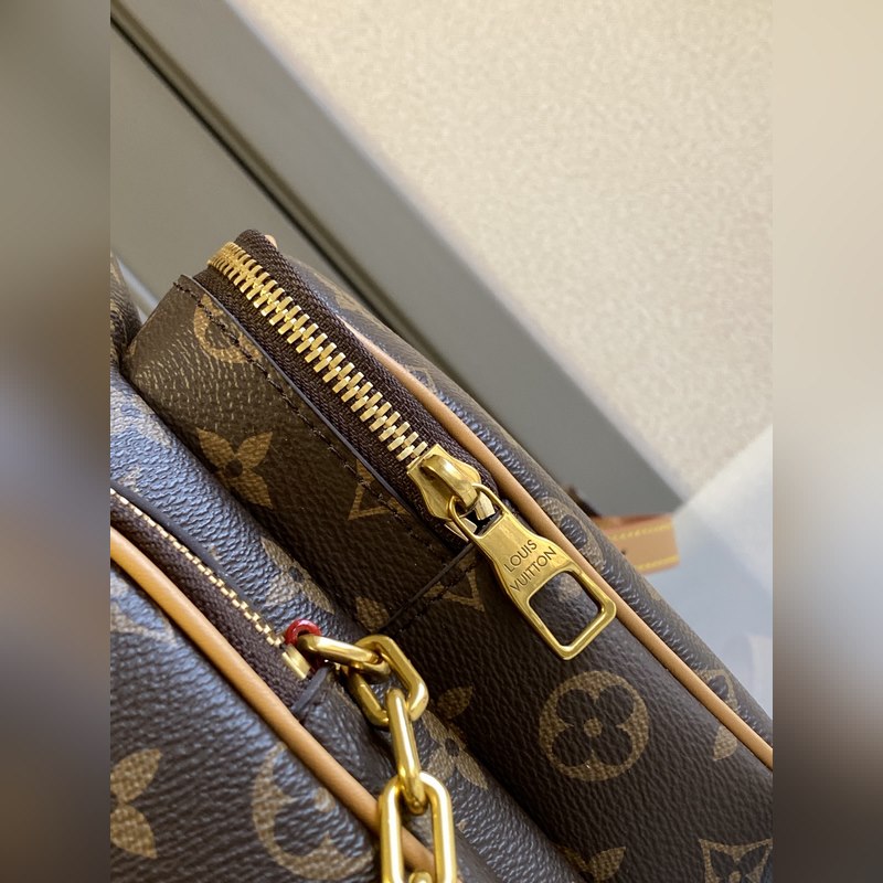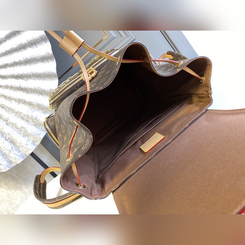 LV M44658 TRIO BACKPACK 트리오 백팩은 모노그램 캔버스에 소가죽 플랩이 달려 있습니다. 앞주머니에 달린 금색 체인과 같은 현대적인 디테일이 루이 비통의 과거와 현재를 연결합니다. 지퍼가 달린 앞주머니 3개와 사이드 포켓은 실용적인 면을 고려한 것이며 노트북을 넣을 수 있는 충분한 공간이 있습니다. 상세 기능 60 x 72 x 19 cm (길이 x 높이 x 너비) 모노그램 코팅 캔버스 안감 소가죽 트림 녹슨 금색 금속 부품 조절 가능한 가죽 어깨 스트랩 버클 잠금 외부 포켓 2개 앞쪽 바깥 주머니 안쪽 패치 포켓 이중 패치 포켓 내부 핸들: 단일 핸들