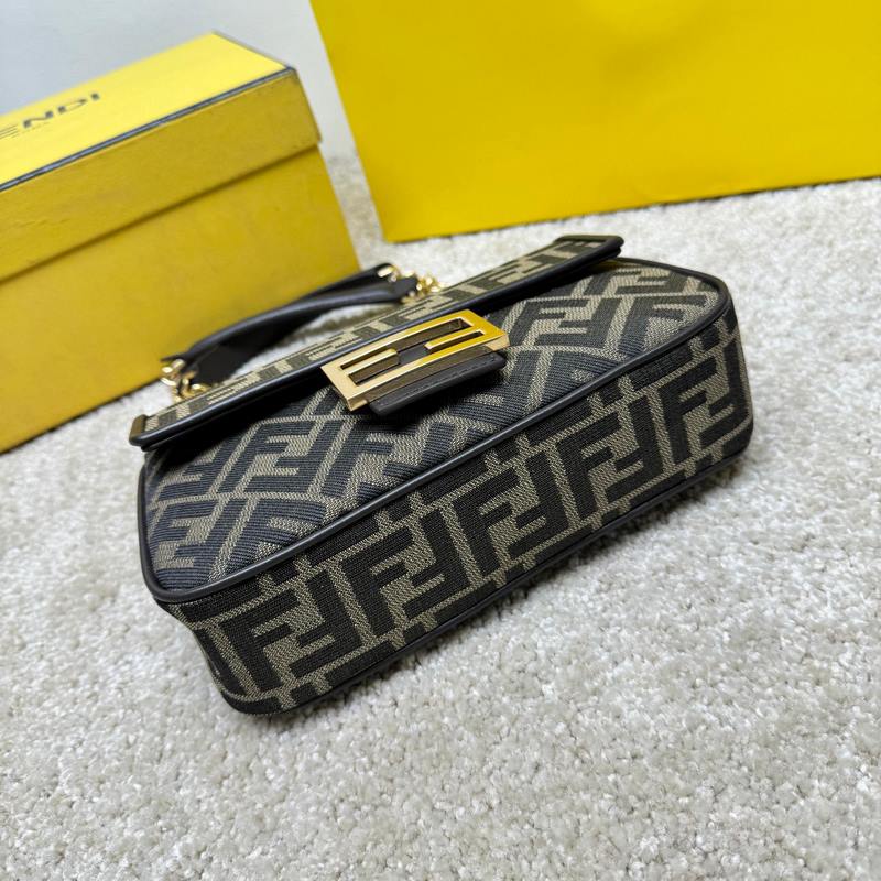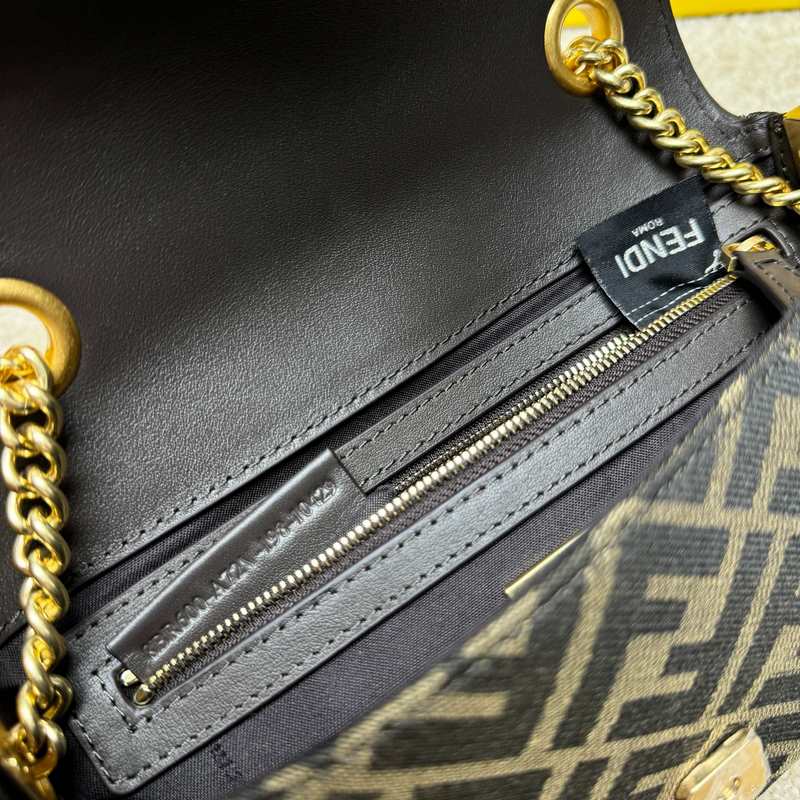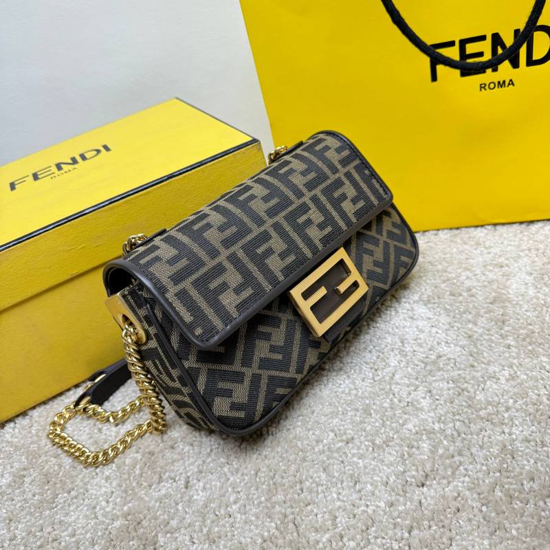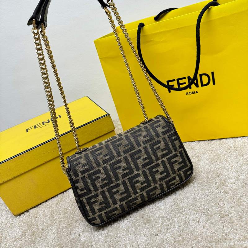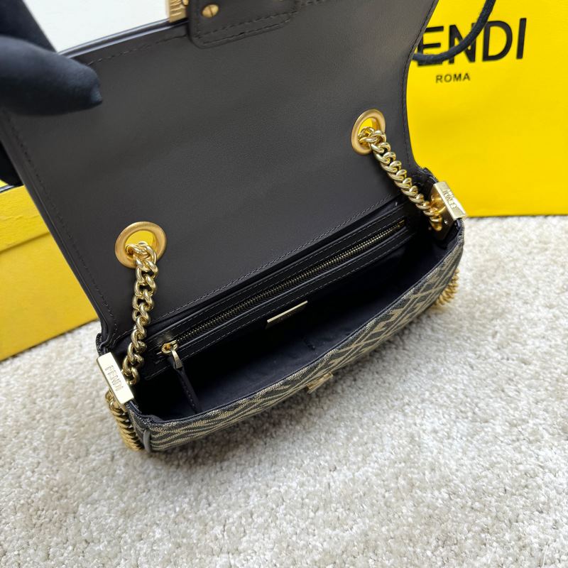 아이코닉한 바게트 미디엄 체인 백. 자수 직물 소재에 브라운 아이코닉 FF 패턴과 브라운 송아지 가죽 디테일을 더했으며 FF 버클이 특징입니다. 전면 플랩 자석 잠금장치 동일 톤의 시그니처 FF 자수 직물로 마감된 내부 포켓 지퍼 포켓 및 골드 톤 금속 디테일이 적용되었습니다. 슬라이드 체인 스트랩으로 어깨에 걸거나 크로스백으로 착용 가능합니다. 모델: 9923 올드 플라워 사이즈: 24-14.5-7cm