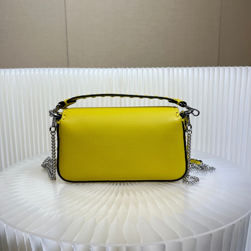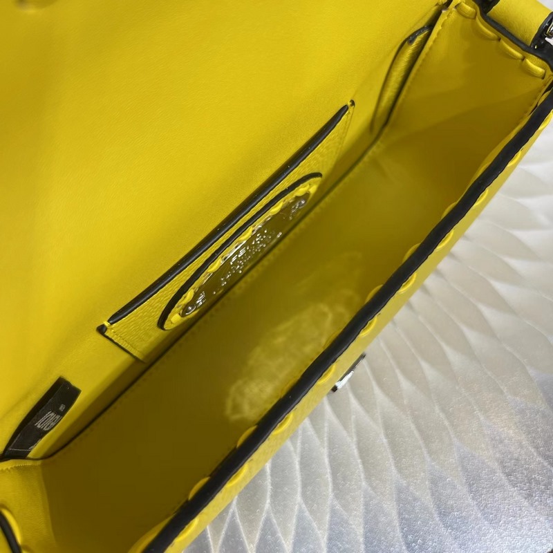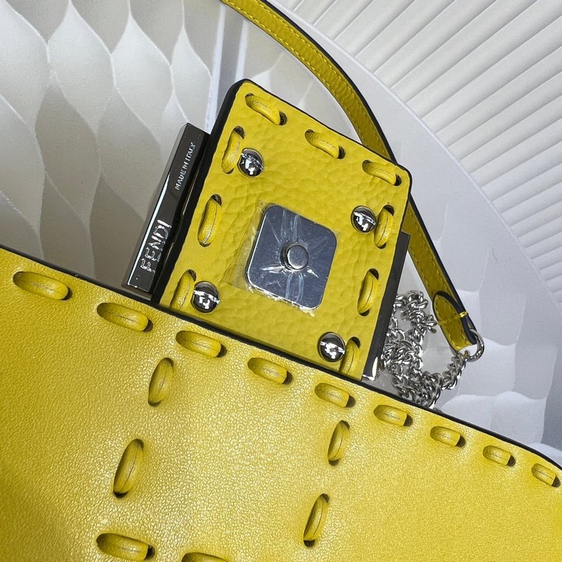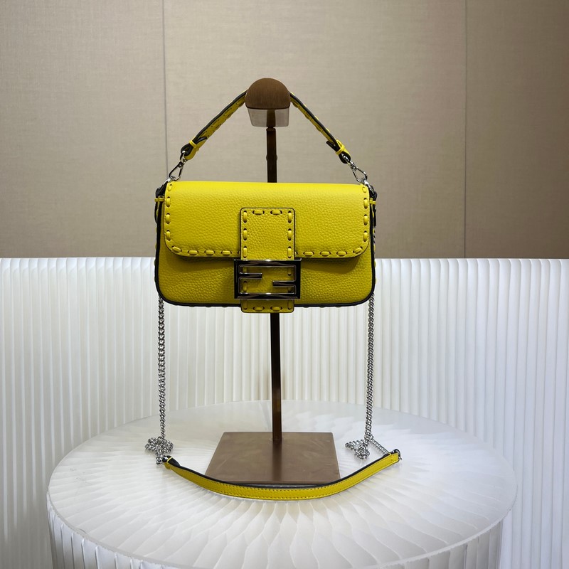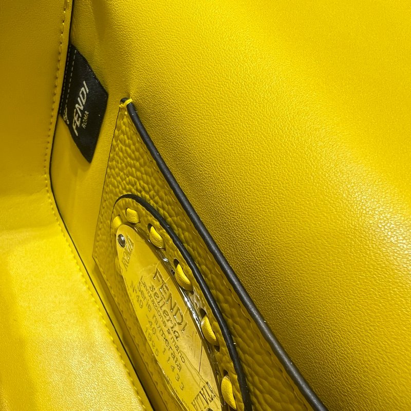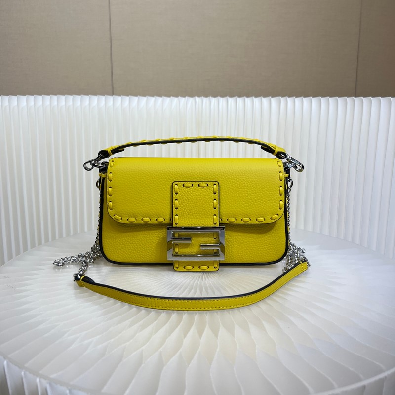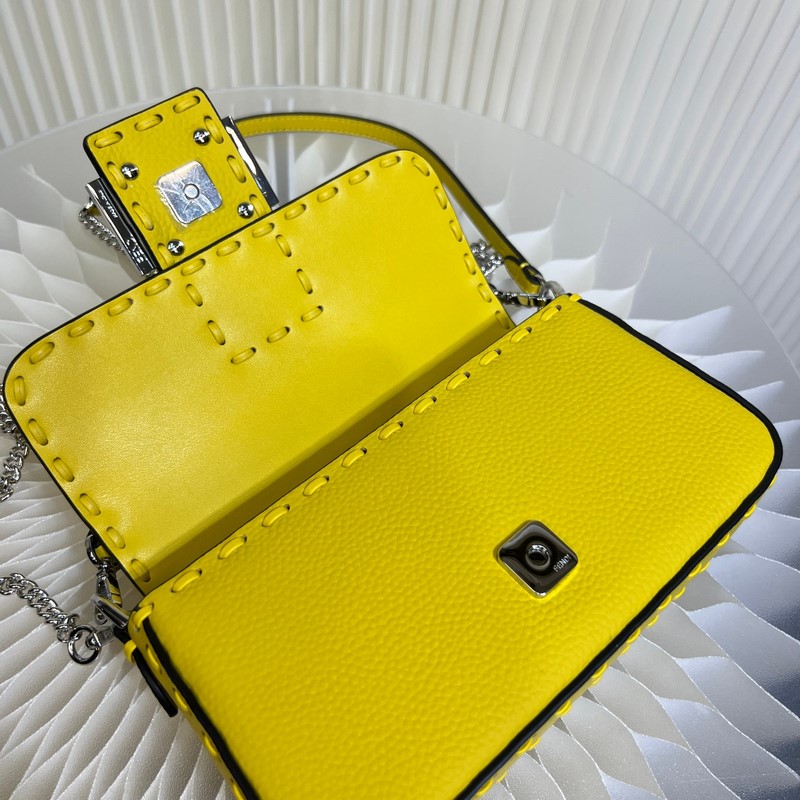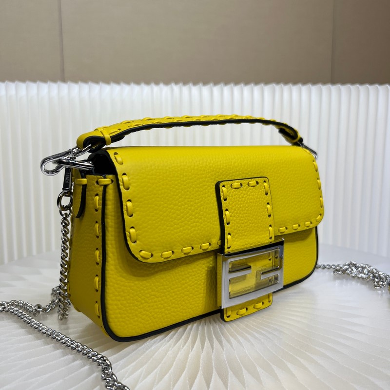 아이코닉한 바게트 미니 핸드백은 309바늘의 동일 색상 대형 스티치로 수작업으로 제작되어 전통적인 셀레리아 공예를 상징합니다. 선별된 노란색 쿠오이오 로마노 가죽은 아이코닉한 천연 그레인 소가죽으로 금속을 전혀 사용하지 않은 무금속 무두질 공법으로 제작되었습니다. 전면 플랩 자석 클로저 송아지 가죽 안감 내부 수납공간 및 포켓 실버 셀레리아 명판 실버 마감 금속 디테일을 갖추고 있습니다. FF 버클이 장식되어 있습니다. 핸드백은 손잡이와 탈부착 가능한 숄더 스트랩이 함께 제공되어 손에 들거나 어깨에 메고 다닐 수 있습니다. 사이즈 20*5*13cm S 리치 패턴 황색