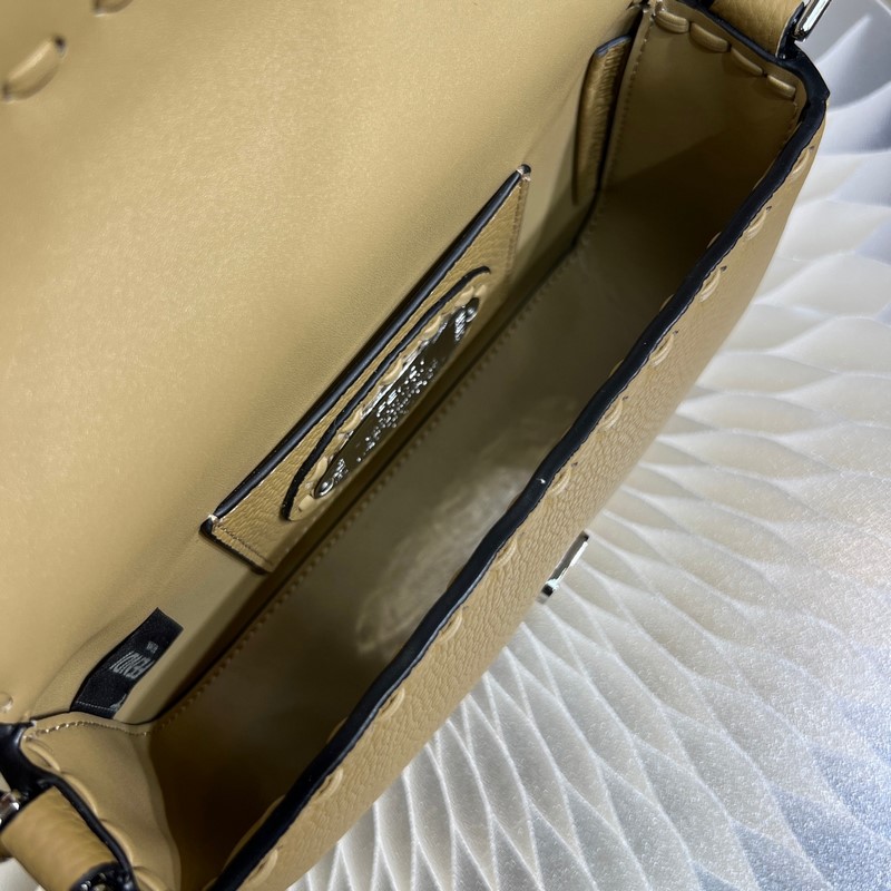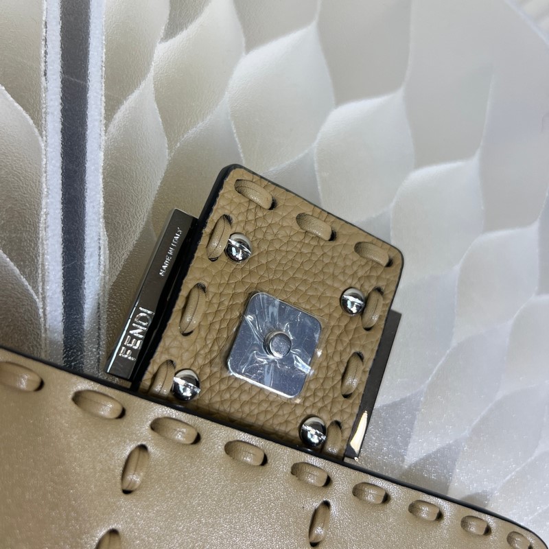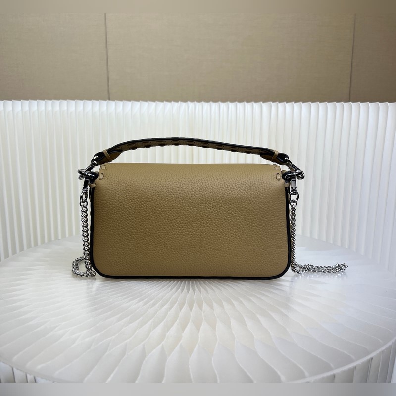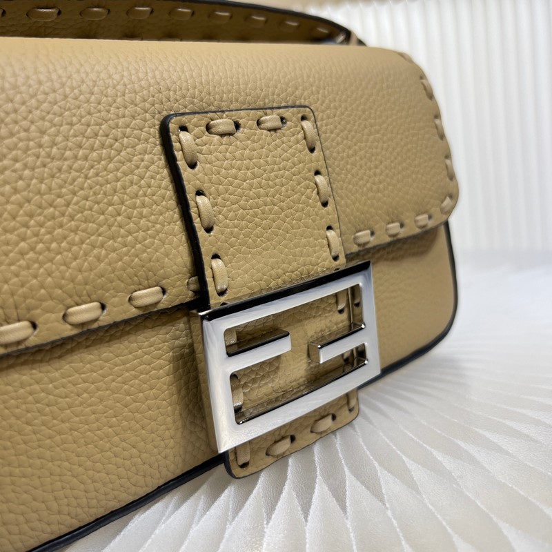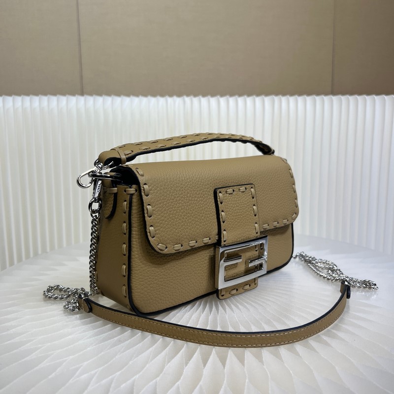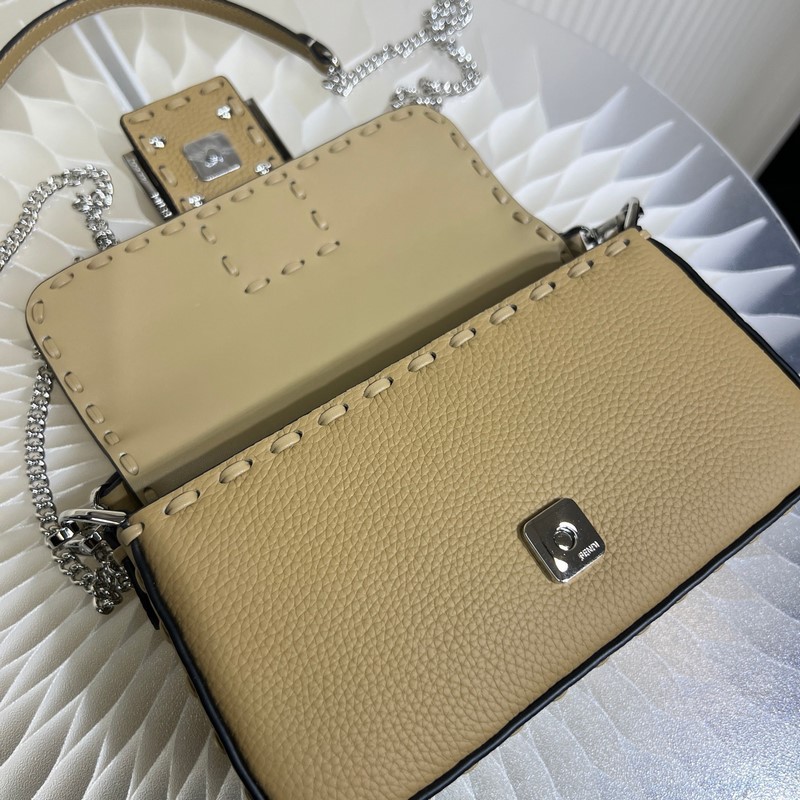 아이코닉한 바게트 미니 핸드백은 309바늘의 동일 색상 대형 스티치로 수작업으로 제작되어 전통적인 셀레리아 공예를 상징합니다. 선별된 살구색 쿠오이오 로마노 가죽은 아이코닉한 천연 그레인 소가죽으로 금속을 전혀 사용하지 않은 무금속 무두질 공법으로 제작되었습니다. 전면 플랩 자석 잠금장치 송아지 가죽 안감 내부 수납공간 및 포켓 실버 셀레리아 명판 실버 마감 금속 부품이 적용되었습니다. FF 버클로 장식되었으며 손잡이와 탈부착 가능한 숄더 스트랩이 있어 핸드백으로 또는 숄더백으로 활용 가능합니다. 사이즈 20*5*13cm S 사이즈 리치 패턴 앵두색