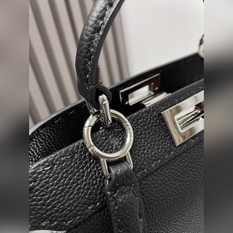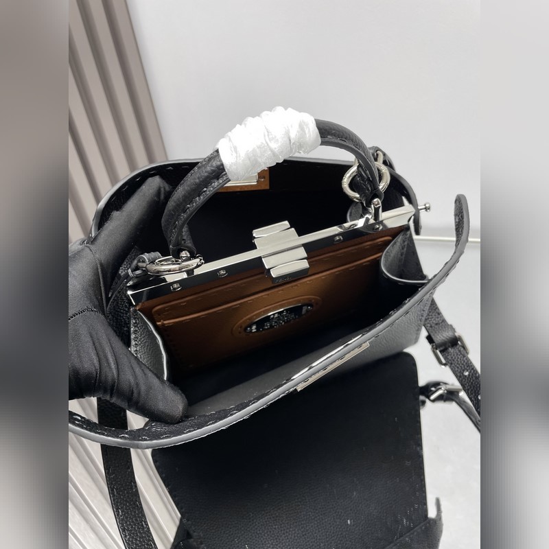 아이코닉 피카부 ISeeU 소형 핸드백 갈색 쿠오이오 로마노 가죽 소재 수작업으로 장식된 대비되는 컬러 스티치 양측에 클래식 트위스트 잠금장치. 가죽 셀레리아(Selleria) 로고가 새겨진 안감 두 개의 수납공간은 하드 칸막이로 분리되어 있으며 단추식 내부 포켓과 골드 마감 금속 디테일이 적용되었습니다. 손잡이와 조절 및 탈부착 가능한 숄더 스트랩이 포함되어 핸드백 또는 숄더백으로 활용 가능합니다. 사이즈 27*21*11cm 327M105
