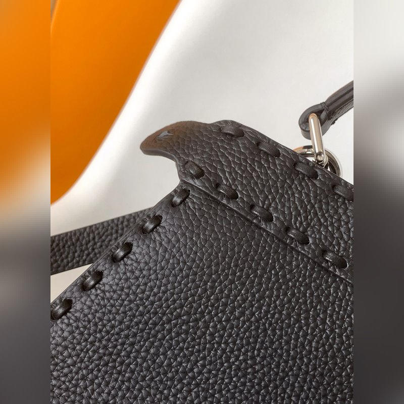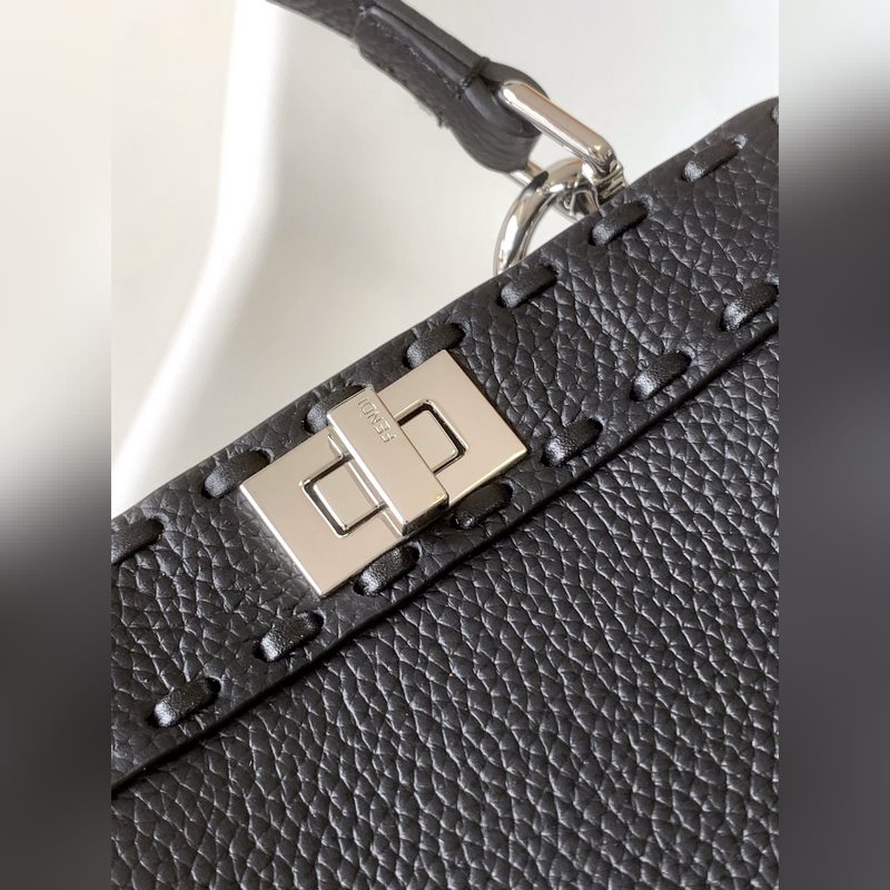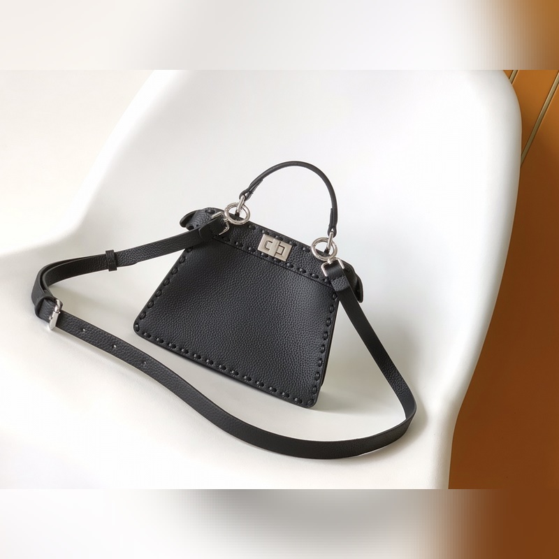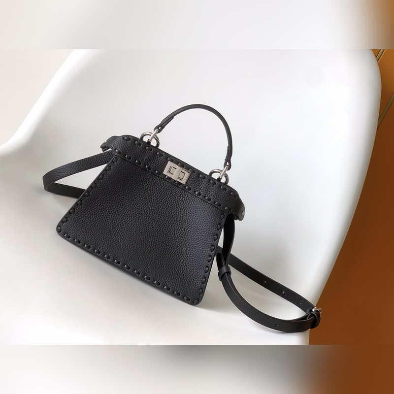 블랙 Fend 아이코닉 피카부 ISeeU 미니 수입 소가죽 소재 동일 색상 대형 스티치 수작업 마감 클래식 트위스트 잠금장치 장식 2개의 수납공간 핸들 및 조절 가능 탈부착형 숄더 스트랩 핸드백 또는 크로스백으로 사용 가능 사이즈: 20x11x15.5cm 모델 번호: 327s