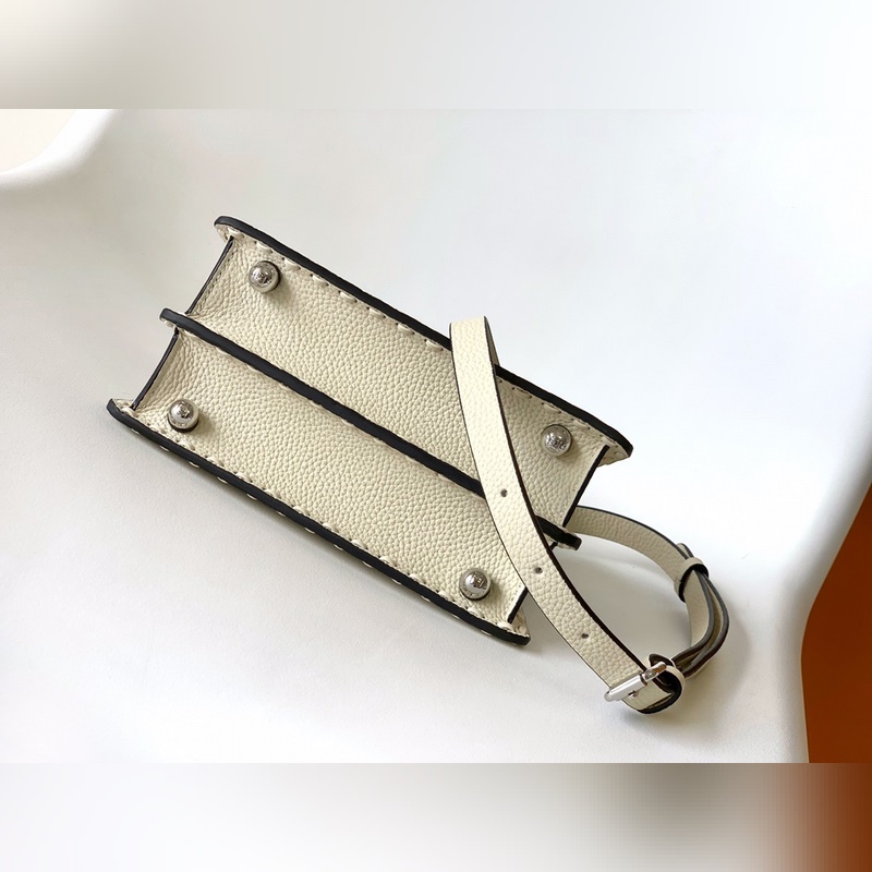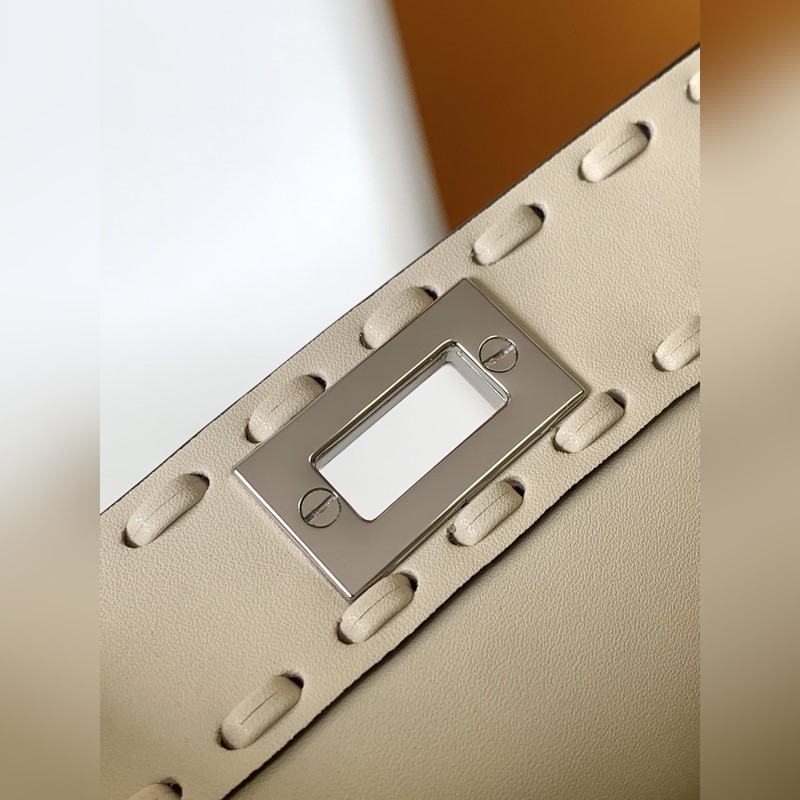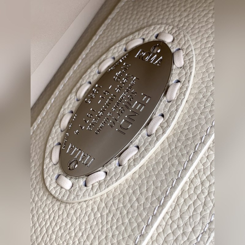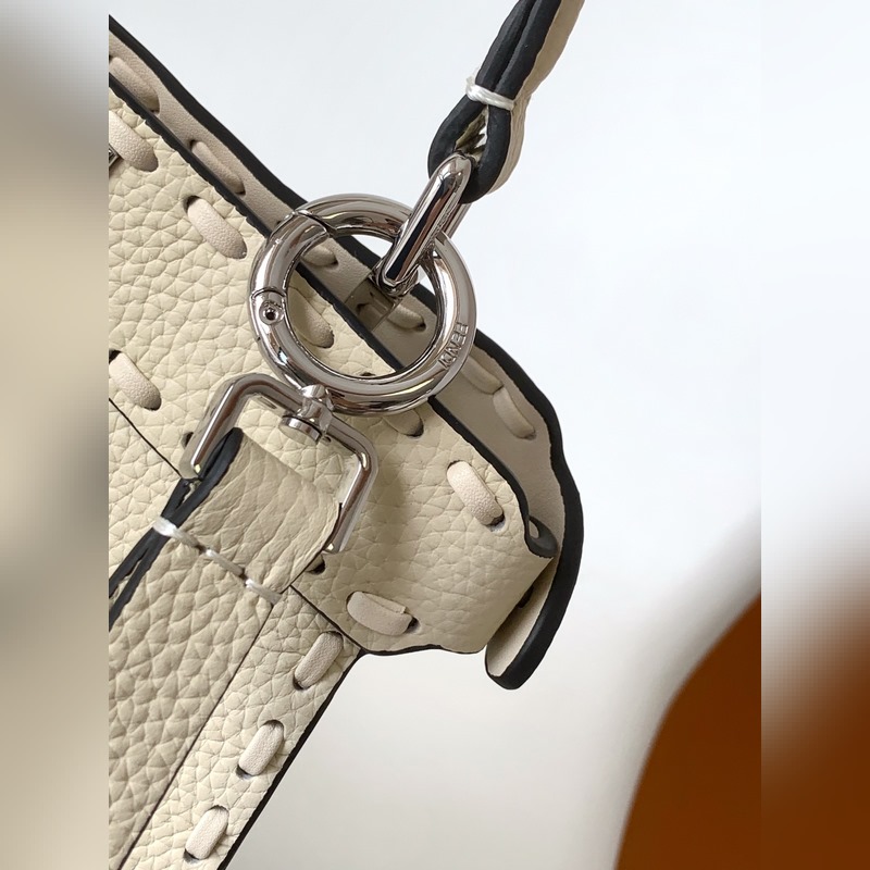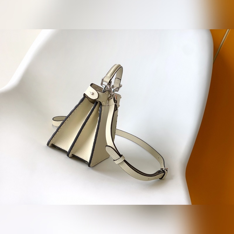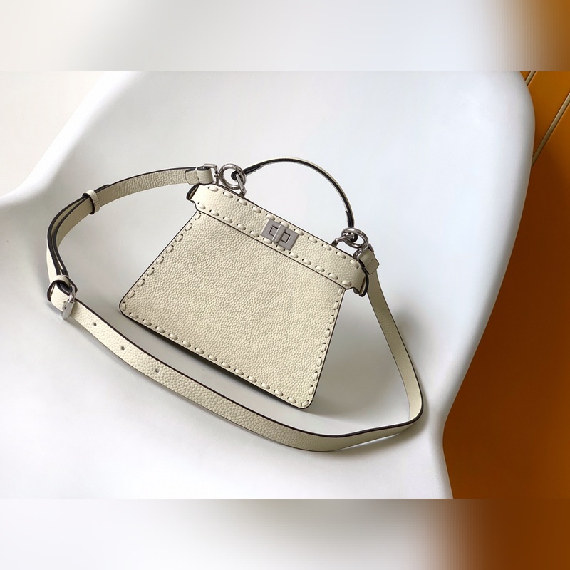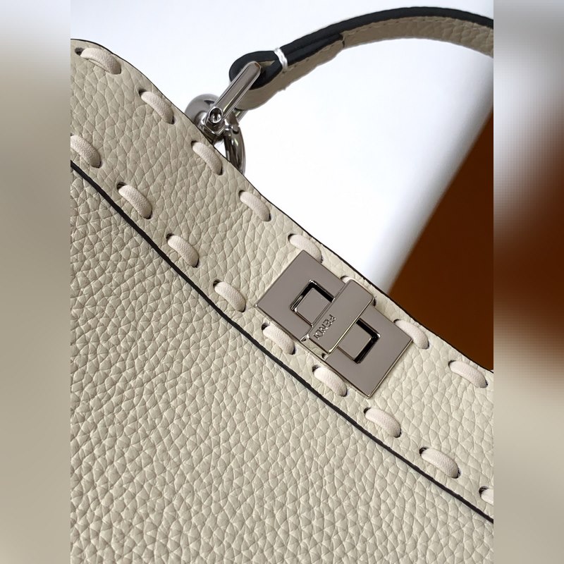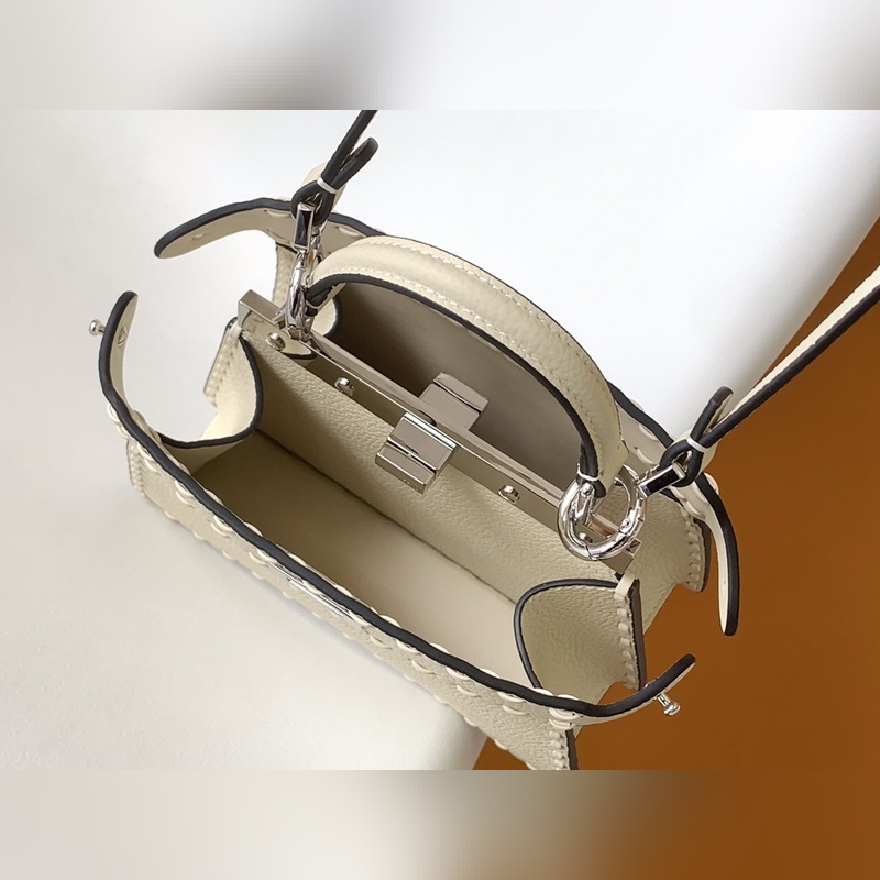 화이트 Fend Iconic Peekaboo ISeeU Mini 수입 소가죽 소재 동일 색상 대형 스티치 수작업 제작 클래식 트위스트 잠금장치 장식 두 개의 수납공간 손잡이와 조절 가능 탈부착식 숄더 스트랩 포함 핸드백 또는 크로스백으로 사용 가능 Size:20-11-15.5cm 모델 번호: 327s