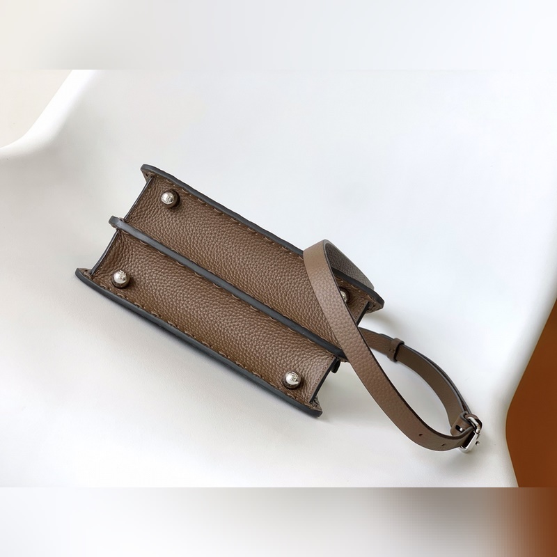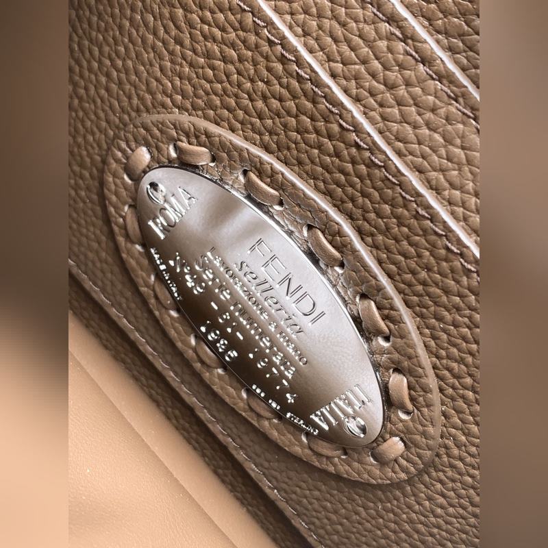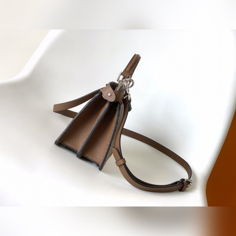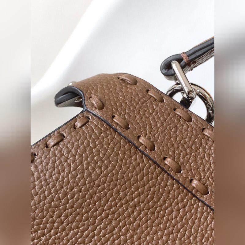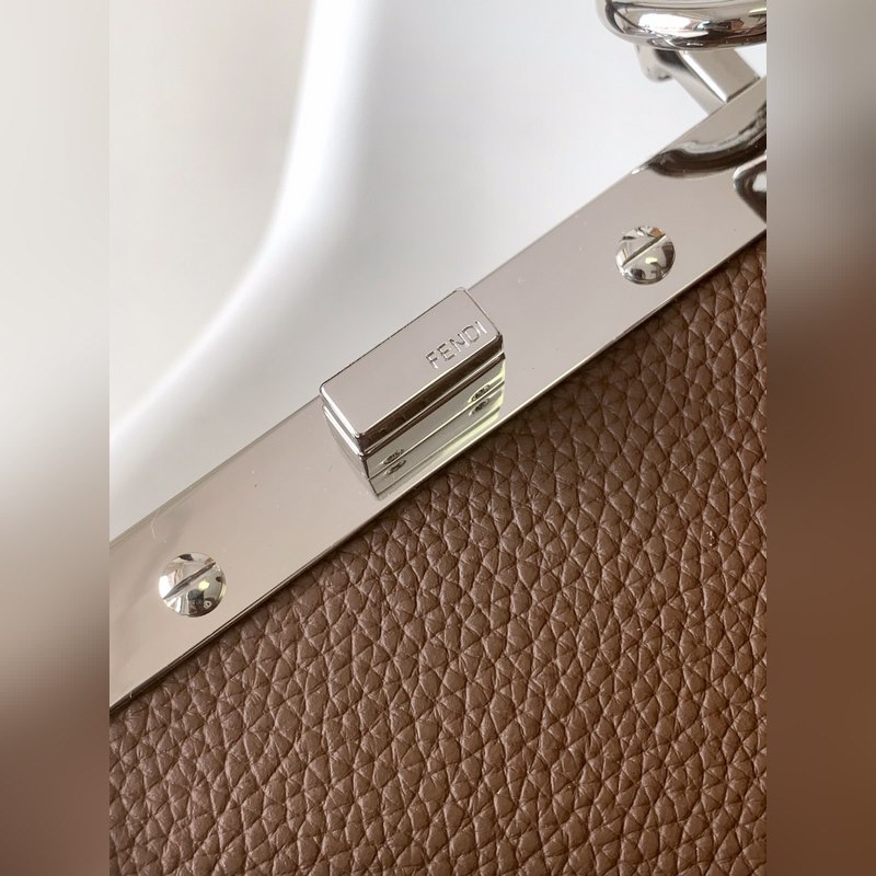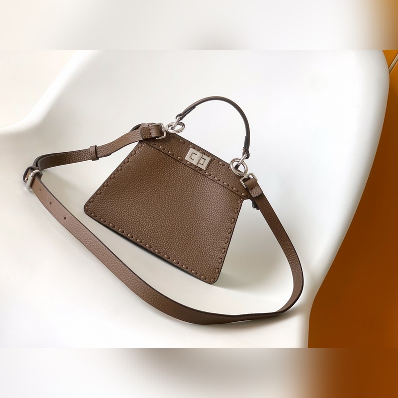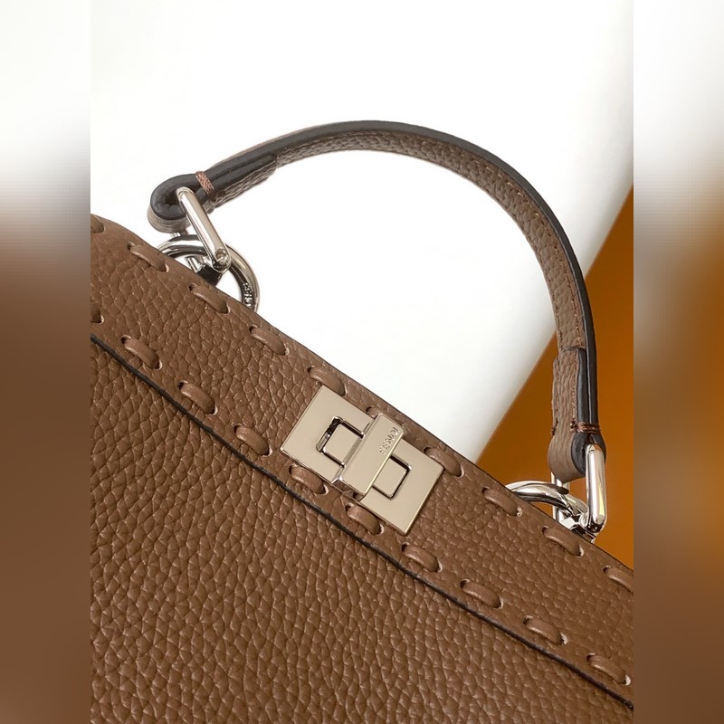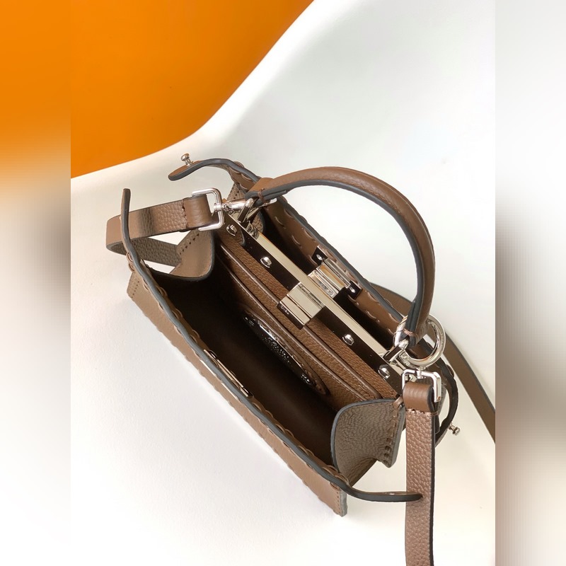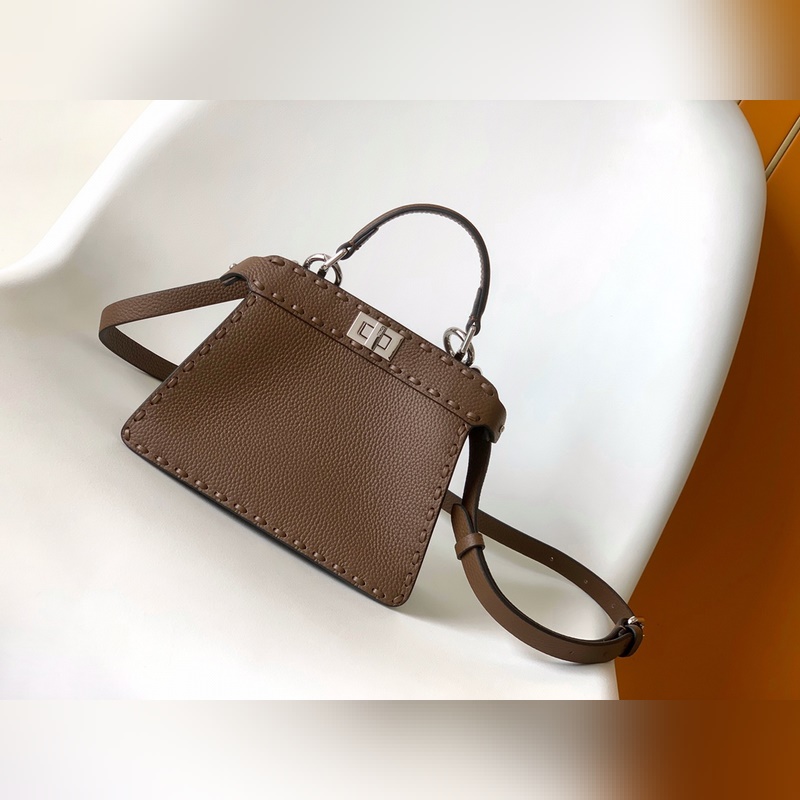 딥 브라운 Fend Iconic Peekaboo ISeeU Mini 수입 소가죽 소재 동일 색상 대형 스티치 수제 제작 클래식 트위스트 잠금장치 장식 두 개의 수납공간 핸들 및 조절 가능 탈부착식 숄더 스트랩 포함 핸드백 또는 크로스백으로 사용 가능 사이즈: 20-11-15.5cm 모델 번호: 327s