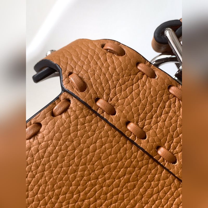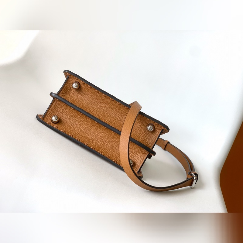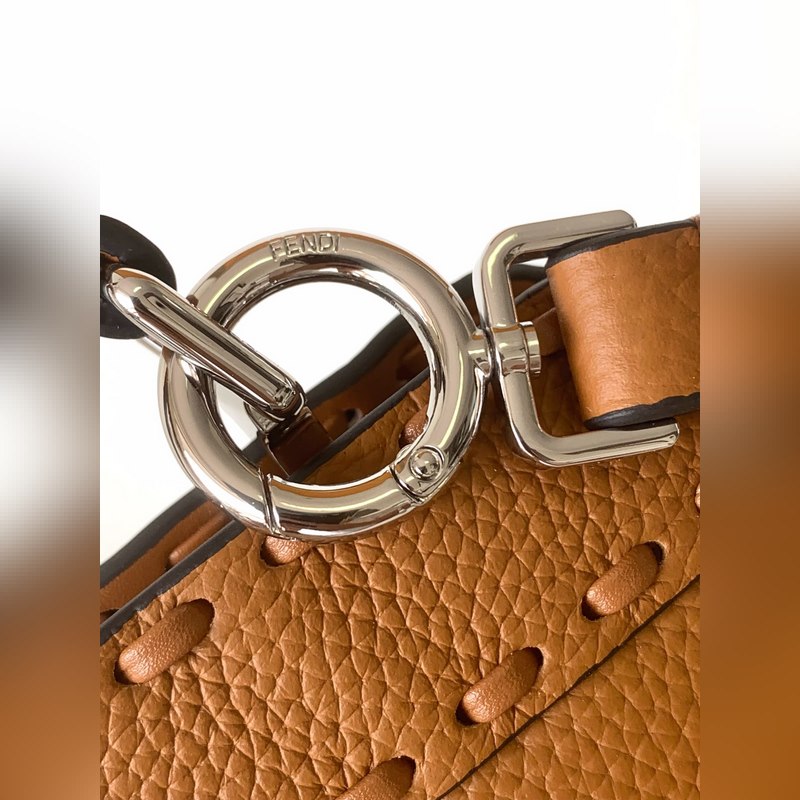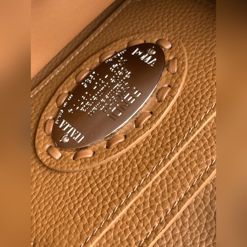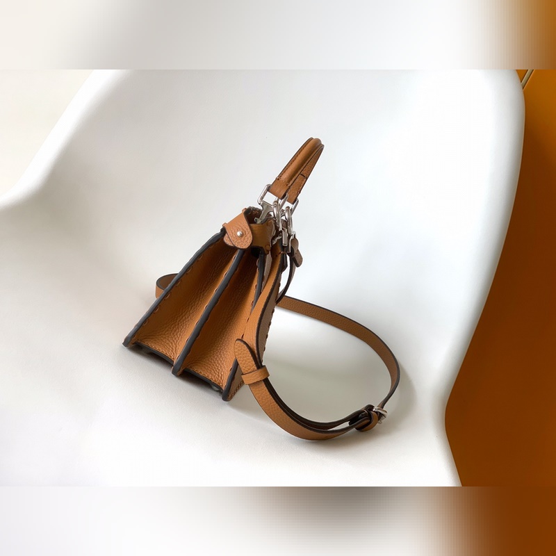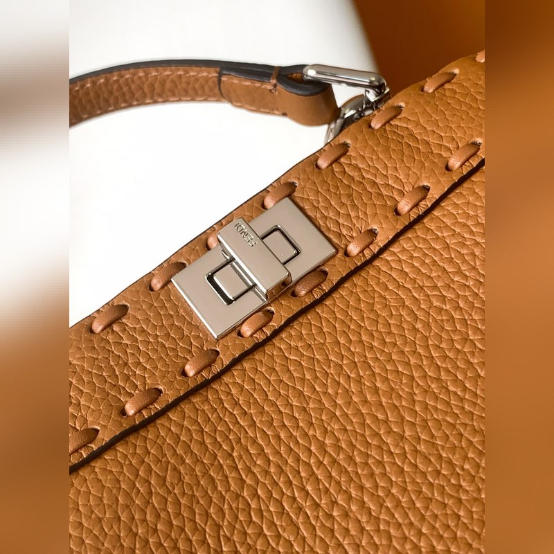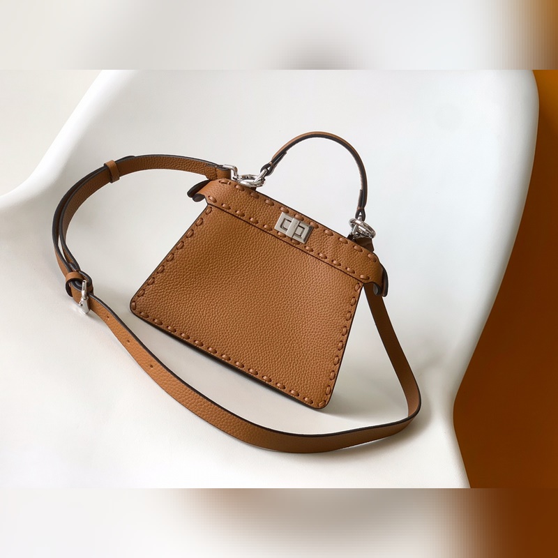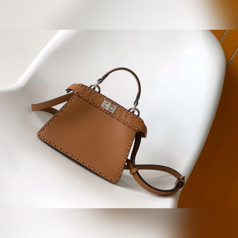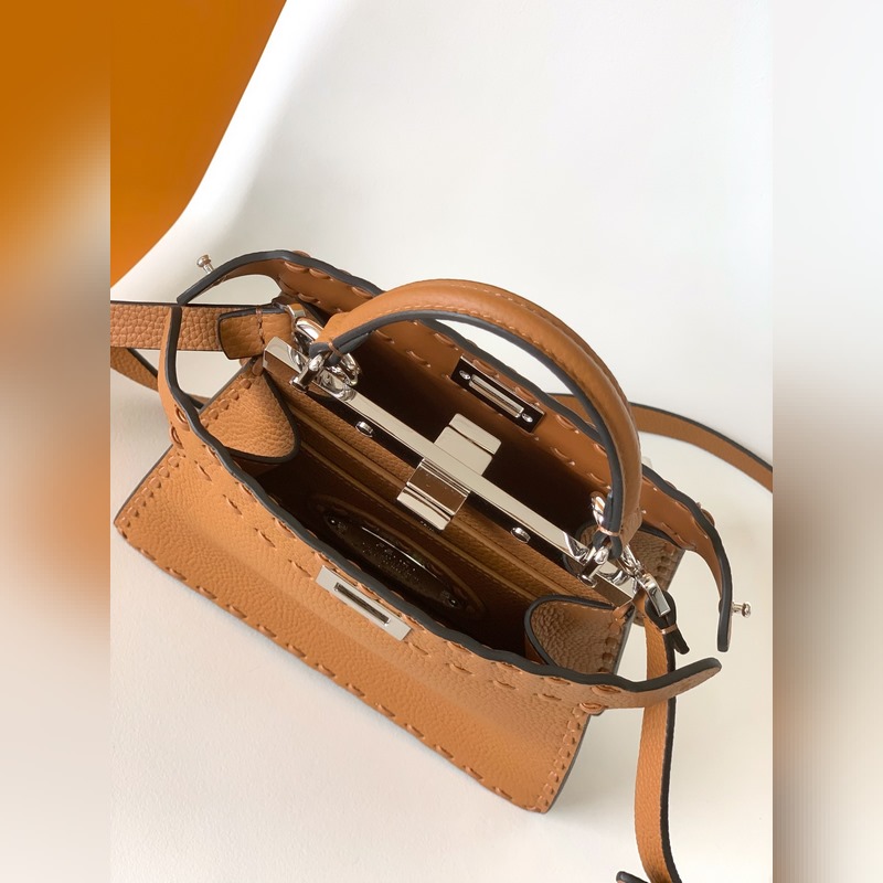 갈색 펜도 아이코닉 피카부 아이씨유 미니 수입 소가죽 소재 동일 색상 대형 스티치 수작업 제작 클래식 트위스트 잠금장치 장식 두 개의 수납공간 핸들 및 조절 가능 탈부착식 숄더스트랩 포함 핸드백 또는 크로스백으로 사용 가능 사이즈: 20-11-15.5cm 모델 번호: 327s