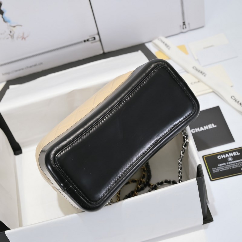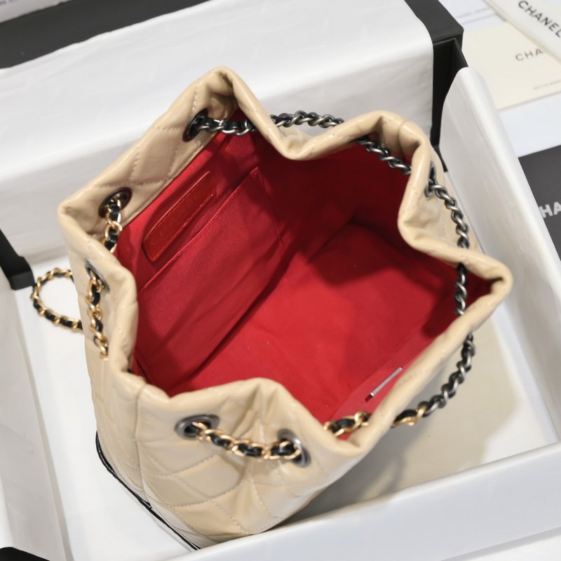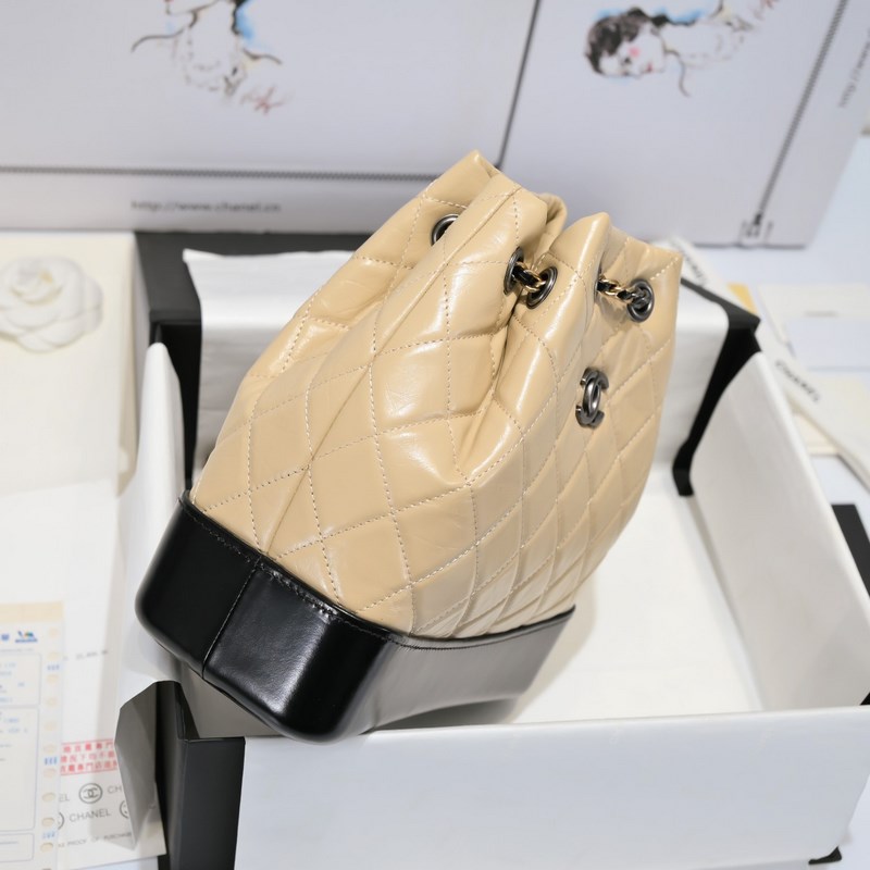 CHANEL GABRIELLE의 Wanderlust 컬렉션 백팩 소재: 빈티지 송아지 가죽 부드러운 소가죽 은 금 루테늄 색상의 금속 스타일 번호: A94485 크기: 23×22.5×10.5cm 색상: 검은색과 살구색