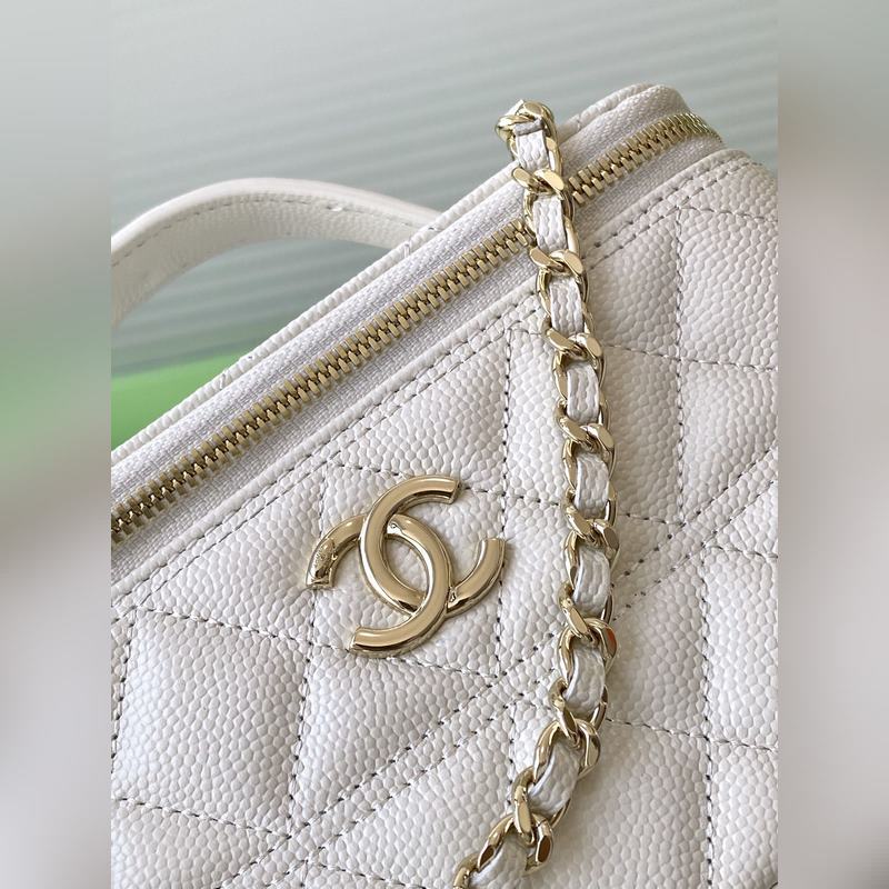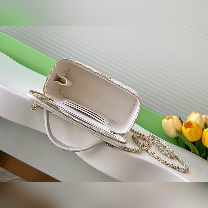 25C 립스틱 파우치 정교하고 소형 체인 클러치 입자 작은 송아지 가죽에 골드 메탈 디테일 핸들에는 작은 로고 장식 가죽 표면에 아치형 스티치 라인 전체적으로 더욱 탄탄한 실루엣 연출 리치 패턴 가죽은 긁힘에도 강함 체인 분리 가능 핸드백으로도 사용 가능하며 수납 공간도 적당합니다. 독특한 디자인과 실용성으로 최근 제 최애 아이템이 되었습니다. 모델 번호 AP4404 사이즈 9.5-17-8 패키지 포함