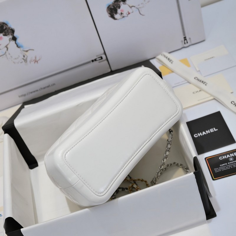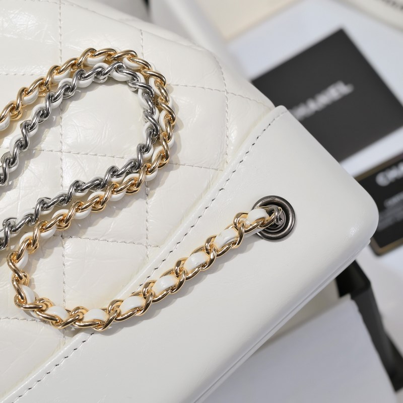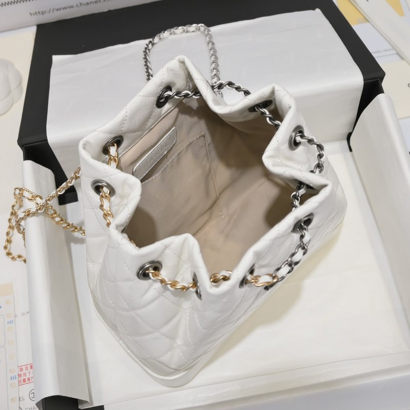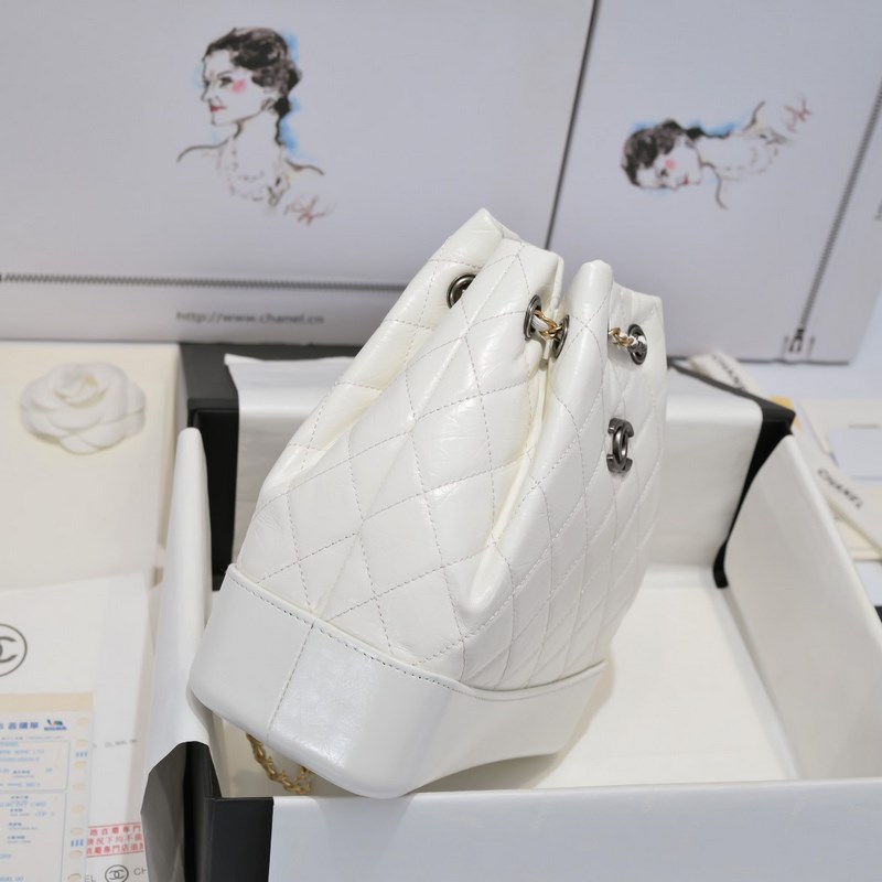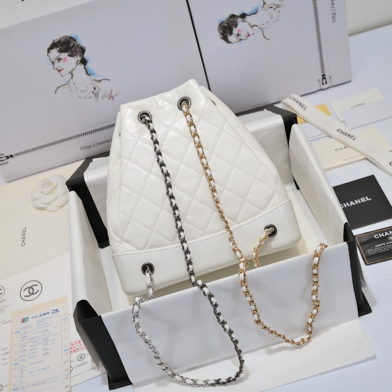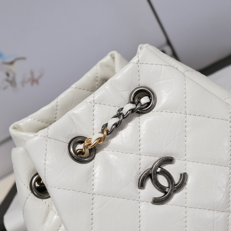 CHANEL GABRIELLE의 Wanderlust 컬렉션 백팩 소재: 빈티지 송아지 가죽 부드러운 소가죽 은 금 루테늄 색상의 금속 스타일 번호: A94485 크기: 23×22.5×10.5cm 색상: 흰색