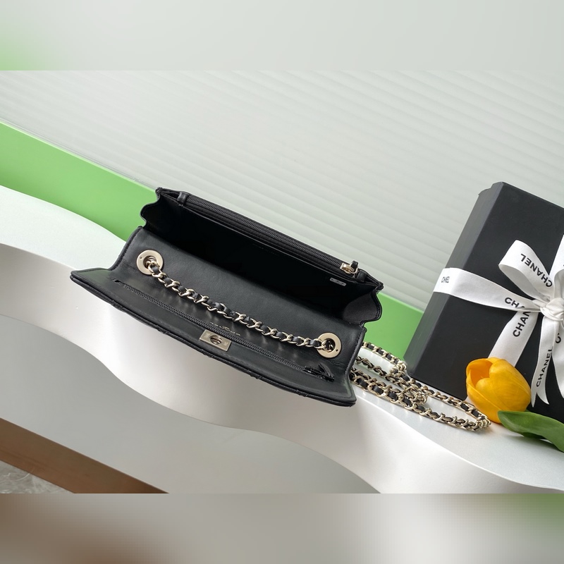 샤넬 25s 드로어스 클로저 트렌디CC 반짝이는 고급스러운 느낌 샤넬 25s 다이아몬드 버클 트렌디CC WOC 실물은 정말 절세미인 천금 같은 느낌. 기존 트렌디CC보다 더 정교해졌어요. 체인 구멍과 금속 스트립 위의 알파벳 모두 작은 다이아몬드가 박혀 있어 각기 다른 각도에서 반짝이는 빛을 발합니다. 보기에 마치 하나의 예술품 같습니다 가방 버클의 더블 C 로고에도 작은 다이아몬드가 가득 박혀 있고 가방 본체는 양가죽 소재로 정교함이 극대화되었습니다. WOC 형태의 실용적인 디자인으로 휴대폰과 일상 소지품을 수납하기에 적합합니다. 모델 번호 AP4323 패키지 포함 사이즈 12-19-3.5