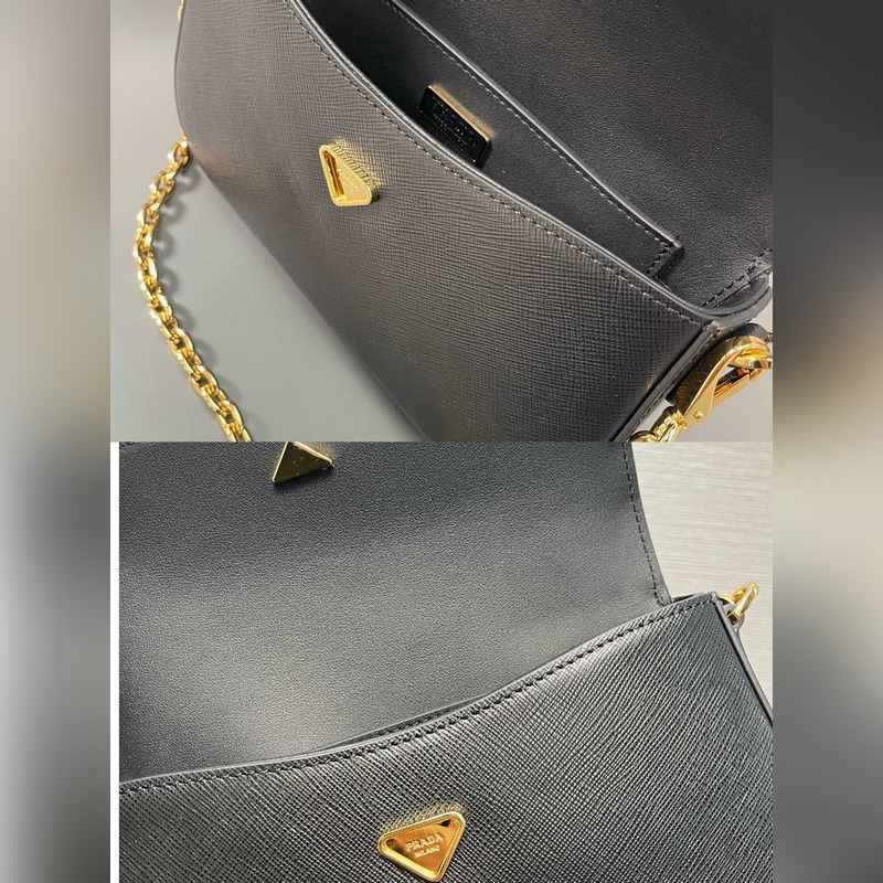【프리미엄 원단】 전문 매장 신상 체인 스트랩 숄더백 1BD356 입고되었습니다. 이 플립 뚜껑 디자인의 단숄더백은 사피아노 가죽으로 제작되었으며 내부는 양가죽으로 마감되었습니다. 정교한 디자인이 돋보이며 우아한 디자인이 돋보입니다. 플랩 개폐식 디자인의 끝부분에 에나멜 금속 삼각형 로고가 장식되어 있으며 탈착 가능한 긴 스트랩과 체인 스트랩이 포함되어 손잡이로도 사용할 수 있습니다. 세련된 매력과 간결한 디자인이 조화를 이룬 이 제품은 소장 가치가 있습니다. 서두르세요! 사이즈: 길이 20.5cm x 높이 10.5cm x 바닥 너비 4cm