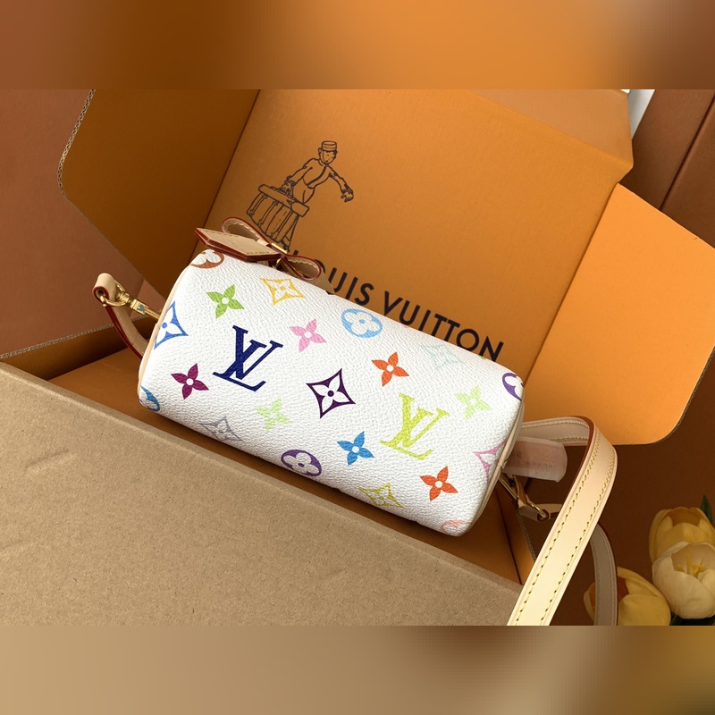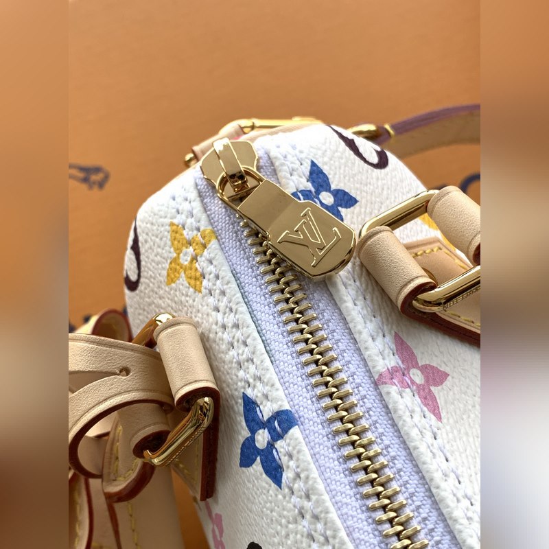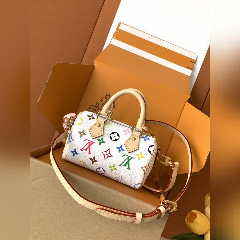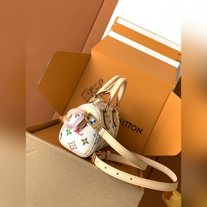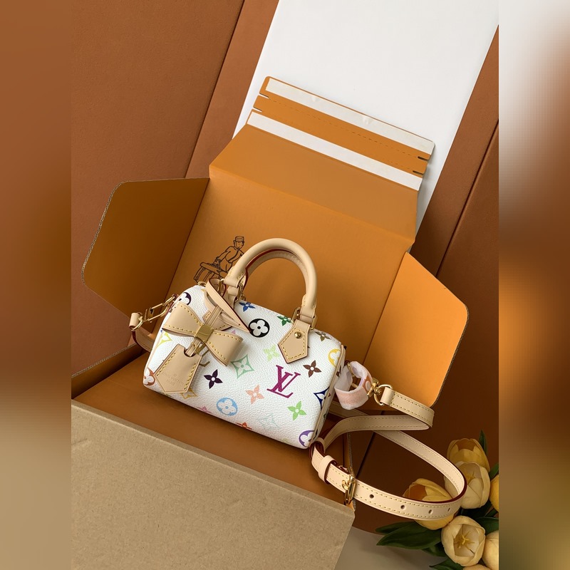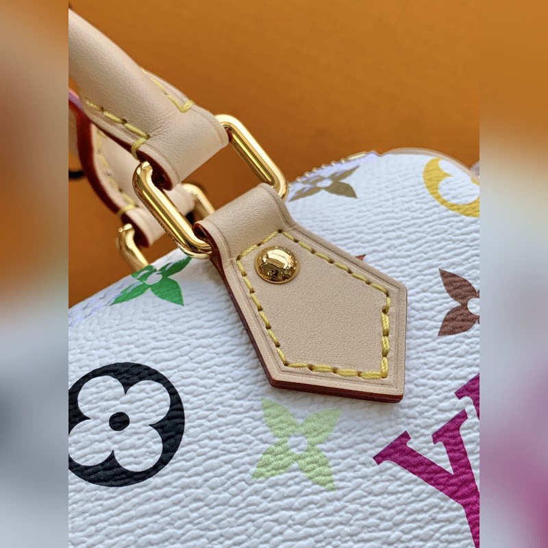 전강 【독점 실사 M13391 화이트 컬러 163 칩 】 이 Nano Speedy 핸드백은 Monogram 코팅 캔버스와 소가죽 장식 테두리로 세련된 실루엣을 완성했으며 생동감 넘치는 색상으로 루이 비통 x 무라카미 타쿠미 리메이크 시리즈의 독특한 분위기를 표현했습니다. Toron 손잡이와 화려한 잠금 장치는 브랜드의 여행 전통을 기념하며 분리 가능하고 조절 가능한 어깨 끈과 독특한 LV x TM 키 케이스가 전체 디자인을 완성합니다. 10 x 7.5 x 16 cm (높이 x 너비 x 길이)