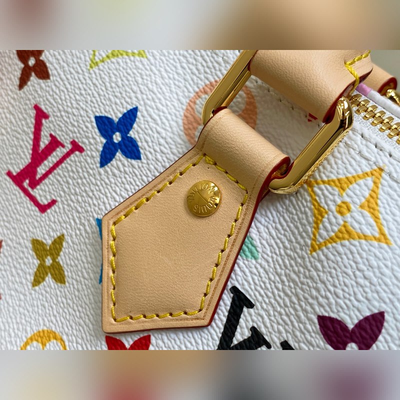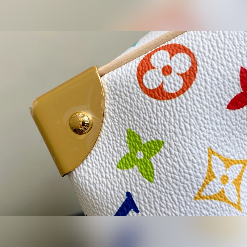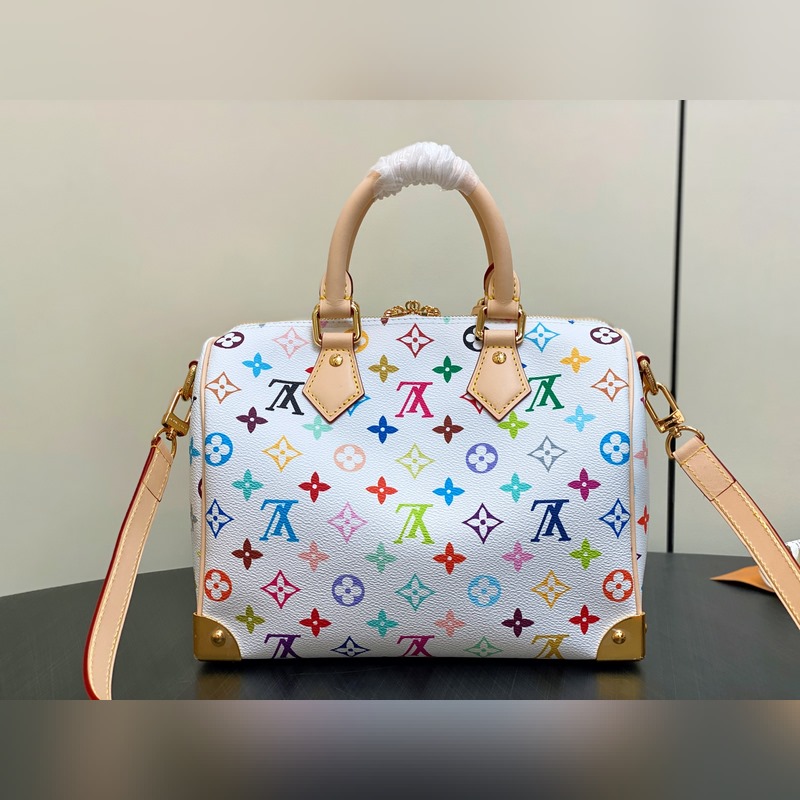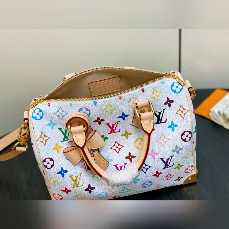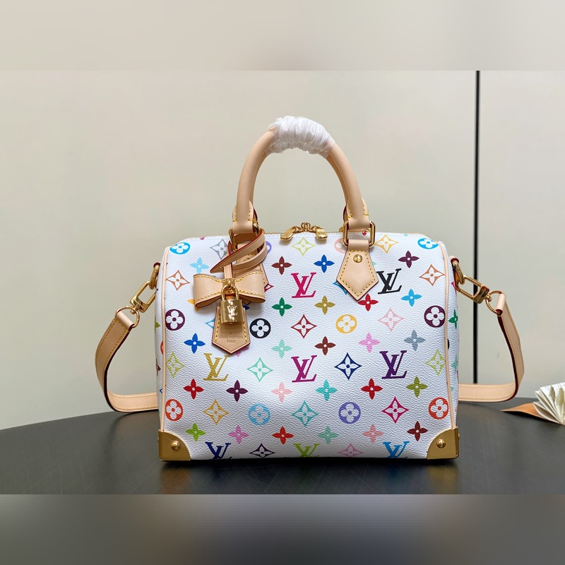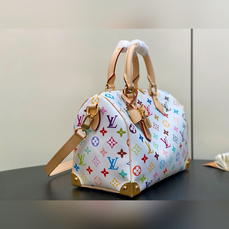 【올해 신제품】 M13085 화이트 컬러 스피디 베개 가방 이 스피디 밴드올리에르 25 핸드백은 클래식 모노그램 패턴에 일본 예술가 무라카미 타쿠미의 밝고 화려한 색조가 더해졌으며 나비 모양 키링과 함께 루이 비통 x 무라카미 타쿠미 협업 시리즈의 생동감 넘치는 스타일을 강조합니다. 소가죽으로 제작된 Toron 손잡이와 분리 및 조절 가능한 어깨 끈 눈길을 끄는 잠금 장치와 가방 모서리는 브랜드의 여행 가방 요소를 반영했습니다. 19 x 15 x 25 cm.