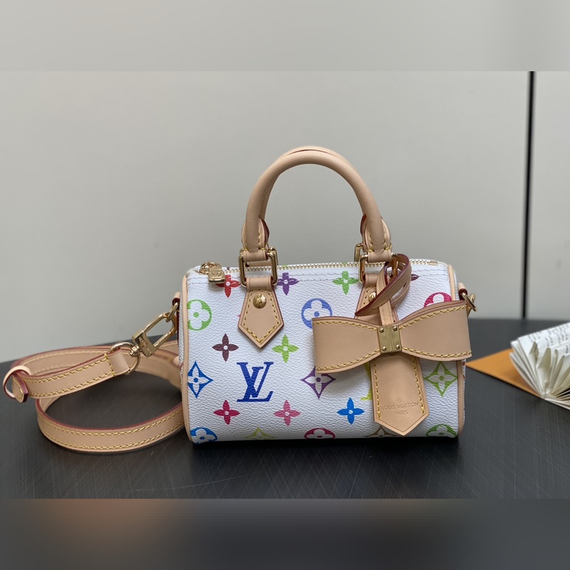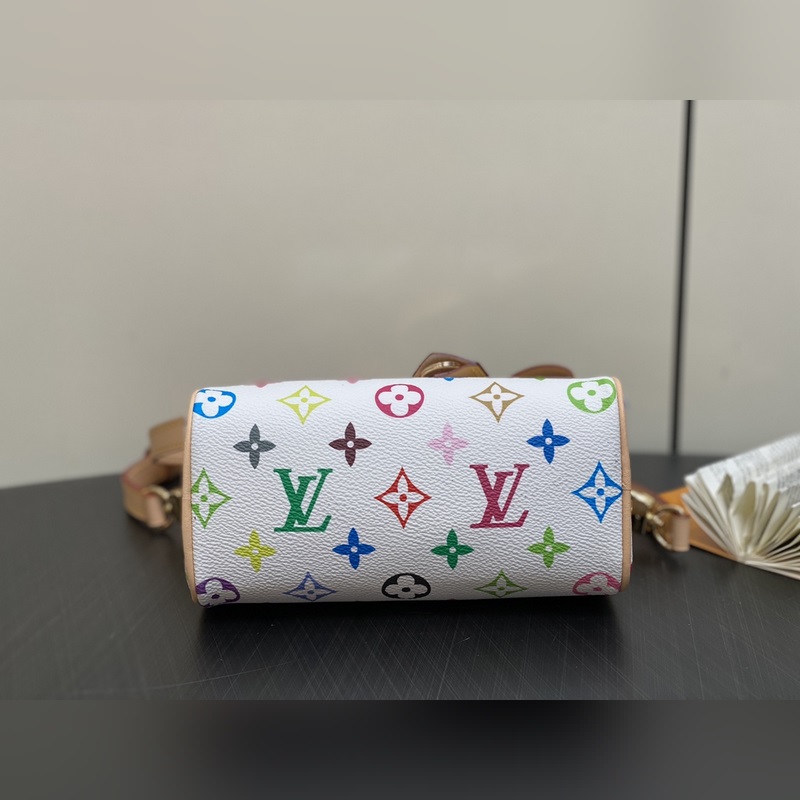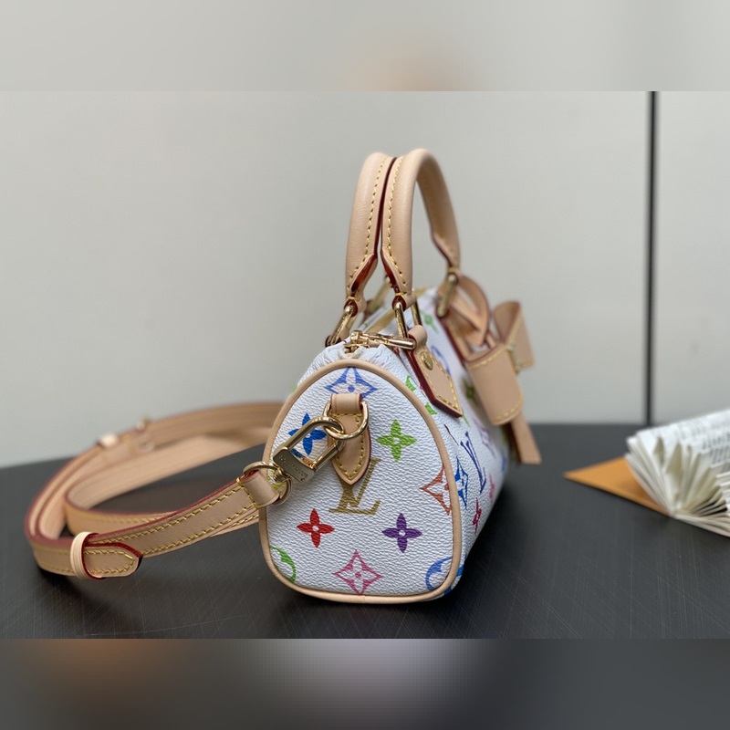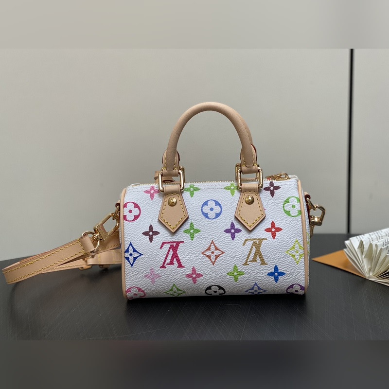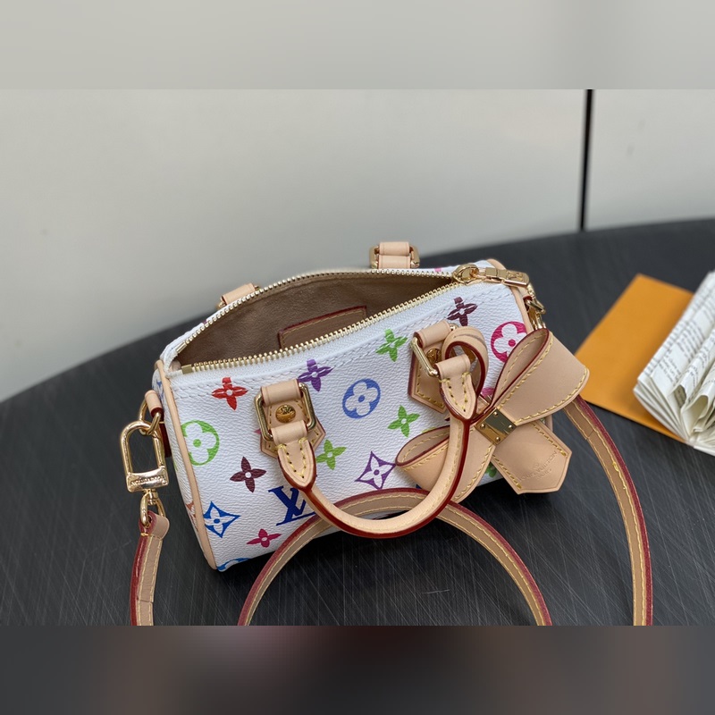 【올해 신제품】 M13391 화이트 컬러 베개 모양 가방 스피디 시리즈 LV 무라카미 타쿠미 콜라보레이션 NANOSPEEDY 핸드백 M13406 블랙 컬러 이 제품의 Nano Speedy 핸드백은 Monogram 캔버스와 소가죽 장식 프린트를 결합했으며 33가지 화려한 색상으로 백삼채와 흑삼채를 재해석해 12가지 컬러로 출시되어 전 세계에서 폭발적인 인기를 끌고 있으며 유명 인사들에게 사랑받고 있습니다. 16x10x7.5cm.